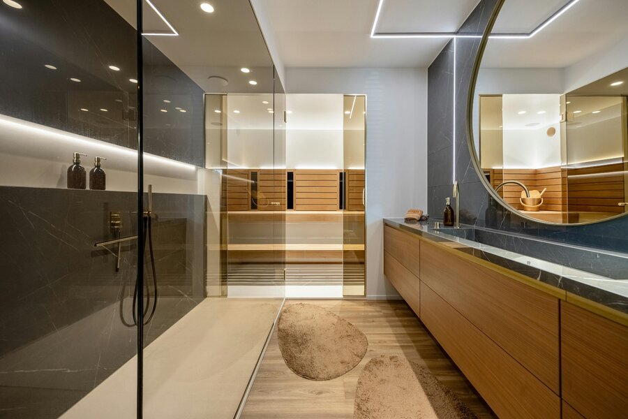 Het slaapgedeelte biedt pure luxe en comfort. De master bedroom beschikt over Nautilus rekken, een eigen terras, een elegante dressing van Pianca met aparte schoenenkast, een privébadkamer én een sauna. De tweede slaapkamer is eveneens voorzien van ingebouwde kasten en grenst aan een tweede badkamer. Een derde kamer werd volledig omgetoverd tot luxe dressing. Verder zijn er nog een linnenkamer met aansluitingen voor wasmachine en droogkast en twee afzonderlijke toiletten.