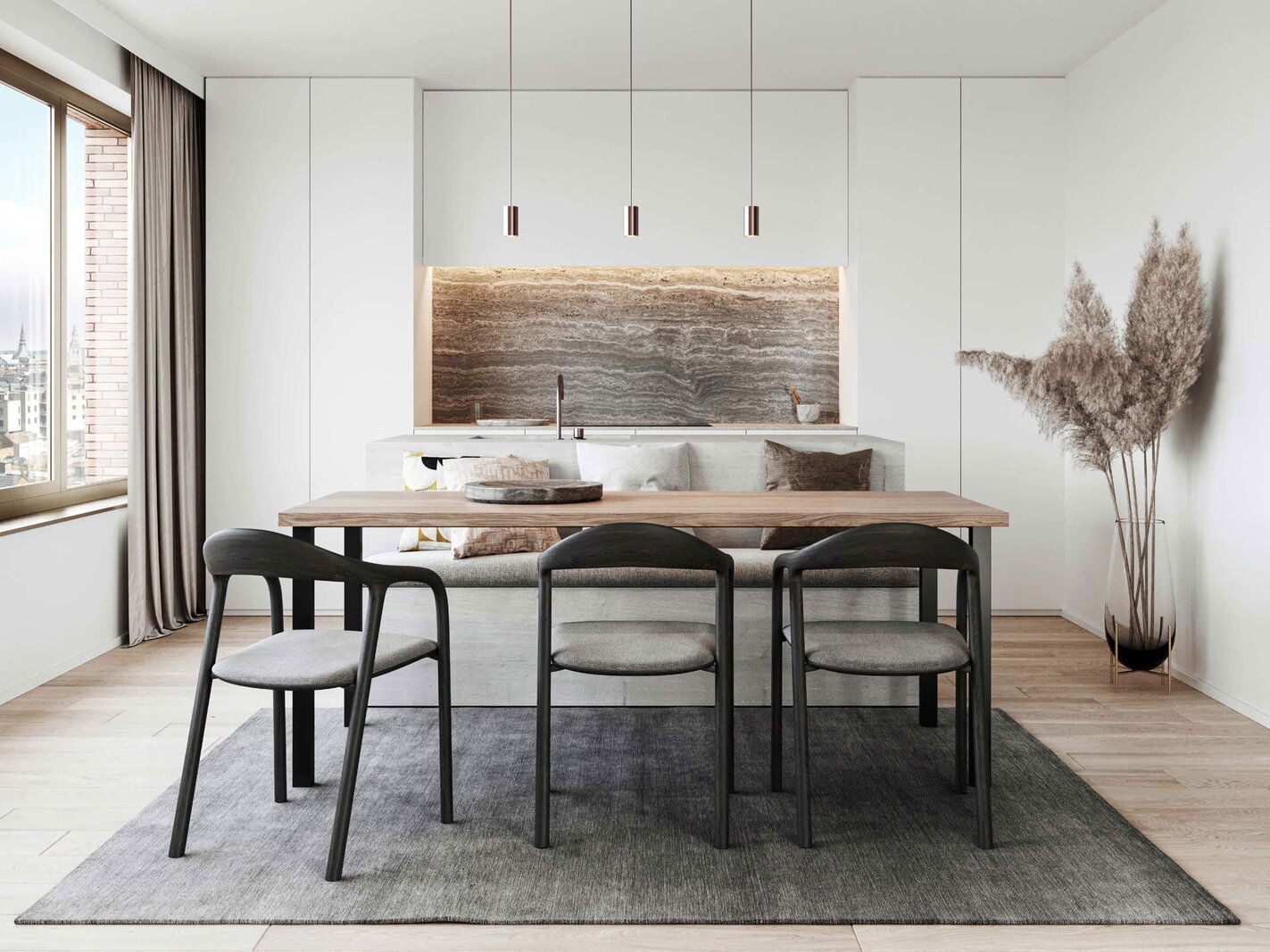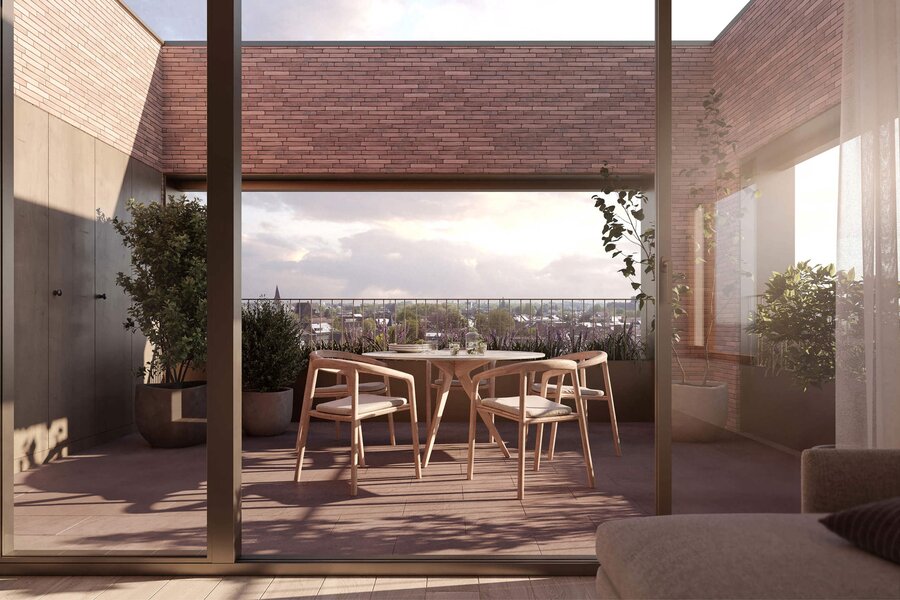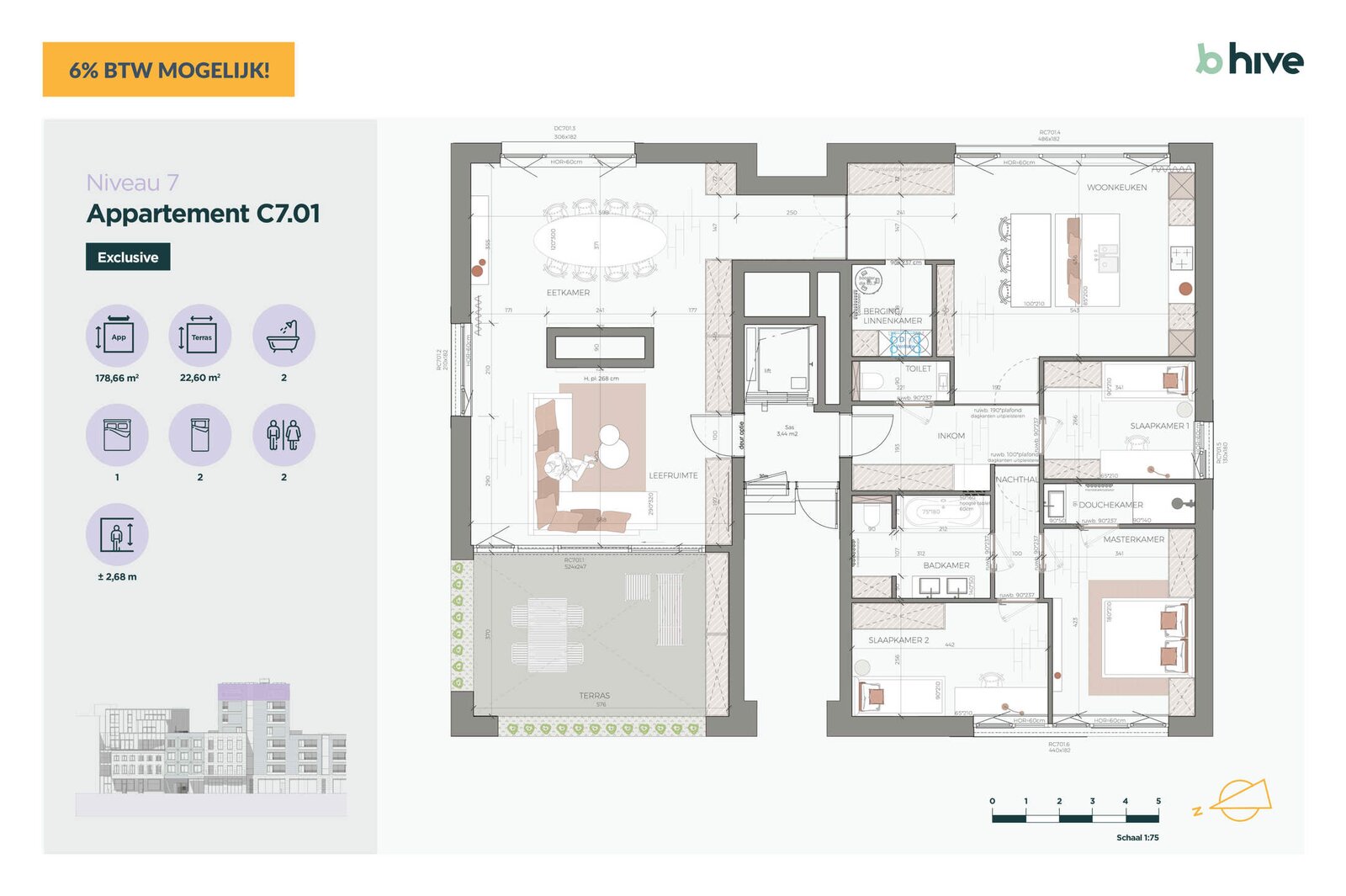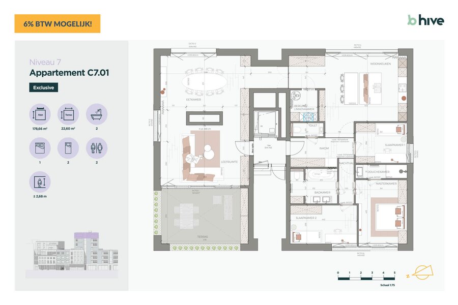 Deze exclusieve penthouse van 179 m² bevindt zich op de 7e verdieping van een hoogwaardig nieuwbouwproject in het hart van Hasselt. b-hive combineert moderne architectuur met duurzame materialen en biedt een unieke woonervaring in een bruisende stadsomgeving. De penthouse biedt een ruime leefruimte en living met veel lichtinval en directe toegang tot een groot hoekterras van 27 m², waar je zowel ‘s ochtends als ‘s avonds van de zon geniet. De keuken is functioneel verbonden met de leefruimte, maar ligt afgescheiden via een doorgang, waardoor je geniet van extra rust. Aansluitend aan de keuken bevindt zich een aparte berging of wasplaats. Er zijn drie volwaardige slaapkamers, waaronder een master bedroom met een eigen douchekamer. Daarnaast is er een stijlvolle badkamer voorzien van een bad, douche, dubbele lavabo en extra toilet. Het appartement is afgewerkt volgens het Exclusive-pakket, met hoogwaardige materialen, een verfijnde afwerking en duurzame keuzes die zorgen voor een stijlvolle, hedendaagse look.