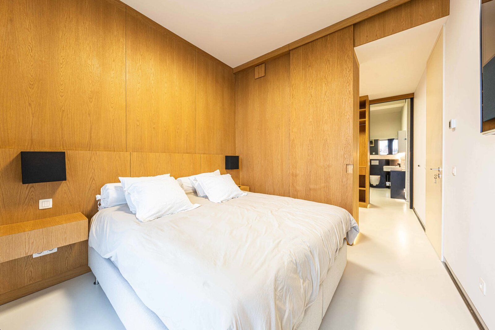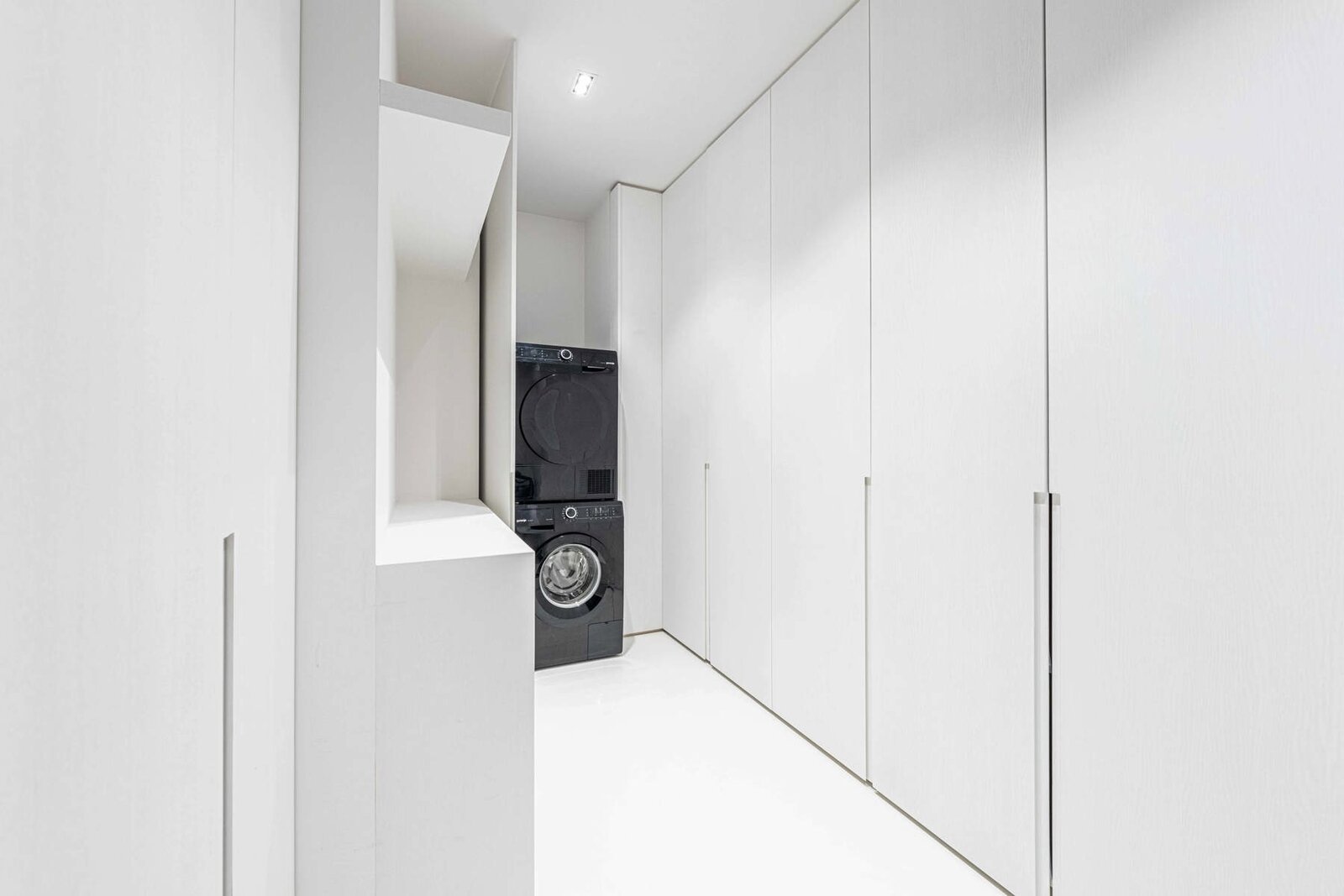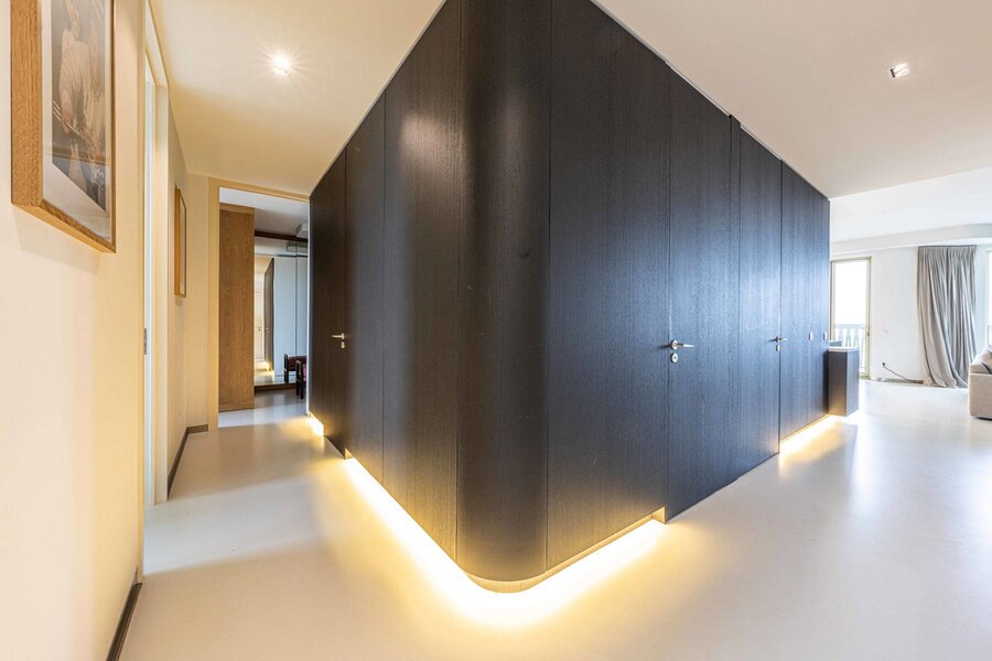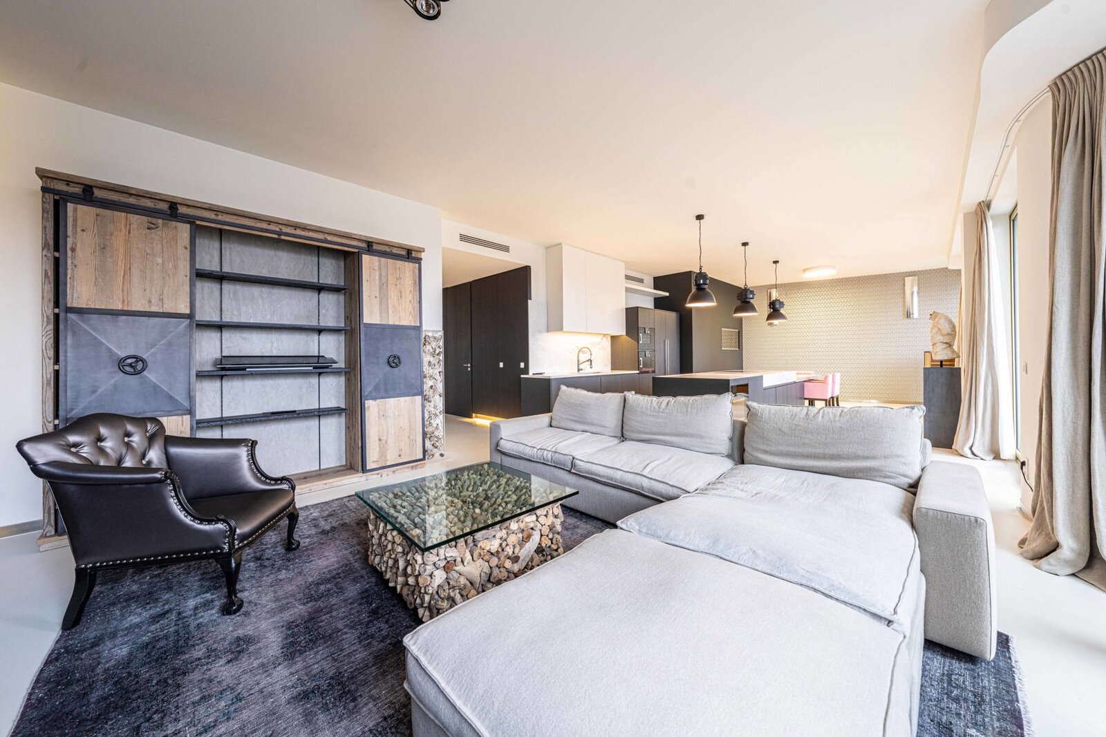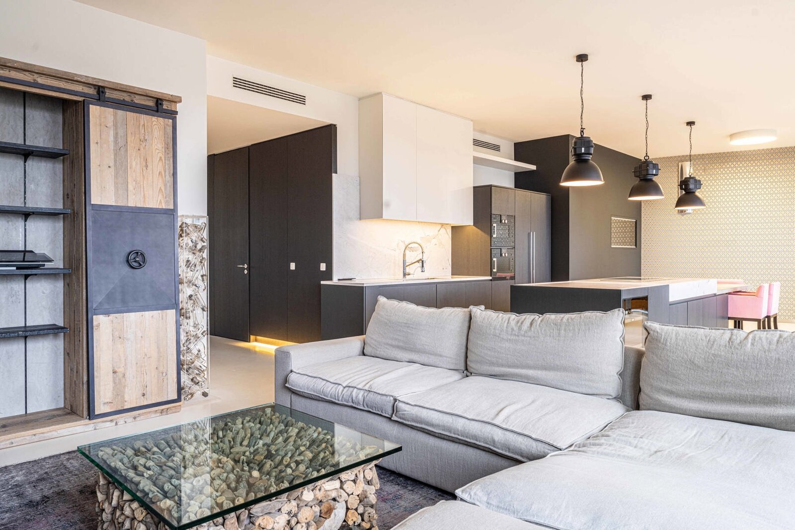 Het appartement bestaat uit een inkomhal met apart toilet, ruime ontvangstruimten waaronder een prachtige woonkamer met aangrenzend terras, een open keuken volledig uitgerust met luxe inbouwapparatuur, drie slaapkamers (waaronder een hoofdslaapkamer met dressing en aangrenzende badkamer en sauna), een doucheruimte, en de 3 slaapkamers hebben toegang tot het achterterras. Alle gebruikte materialen zijn van de allerbeste kwaliteit en de woning voldoet aan de huidige energienormen.