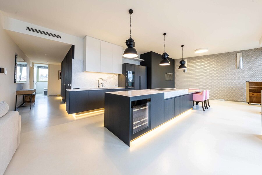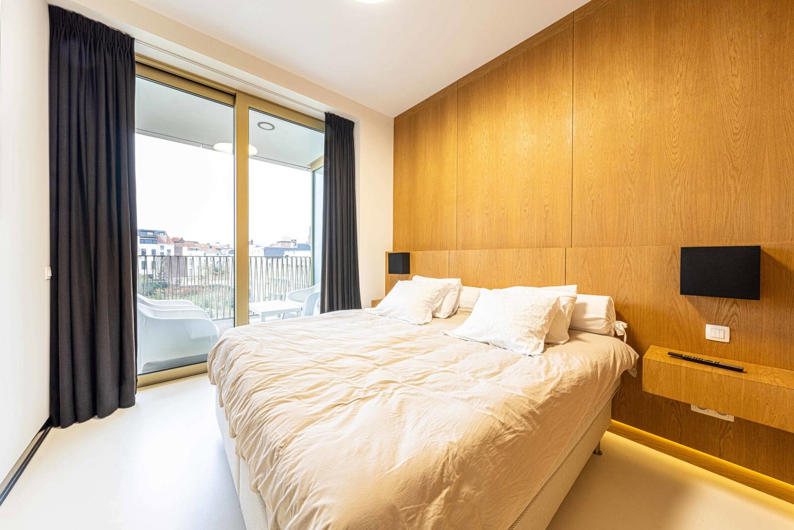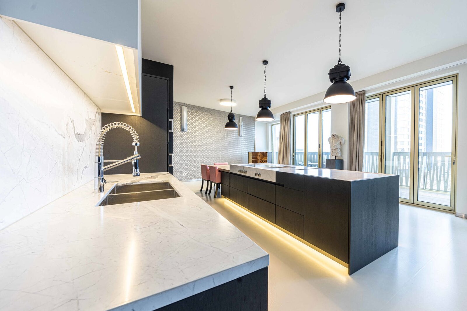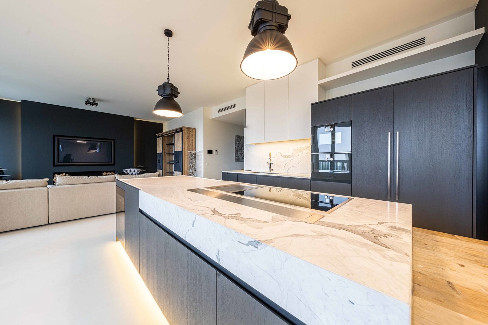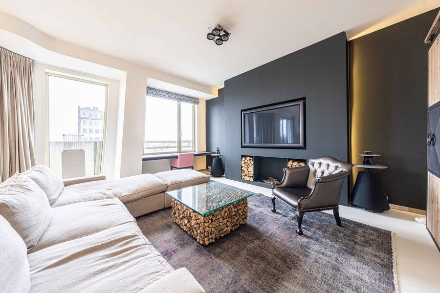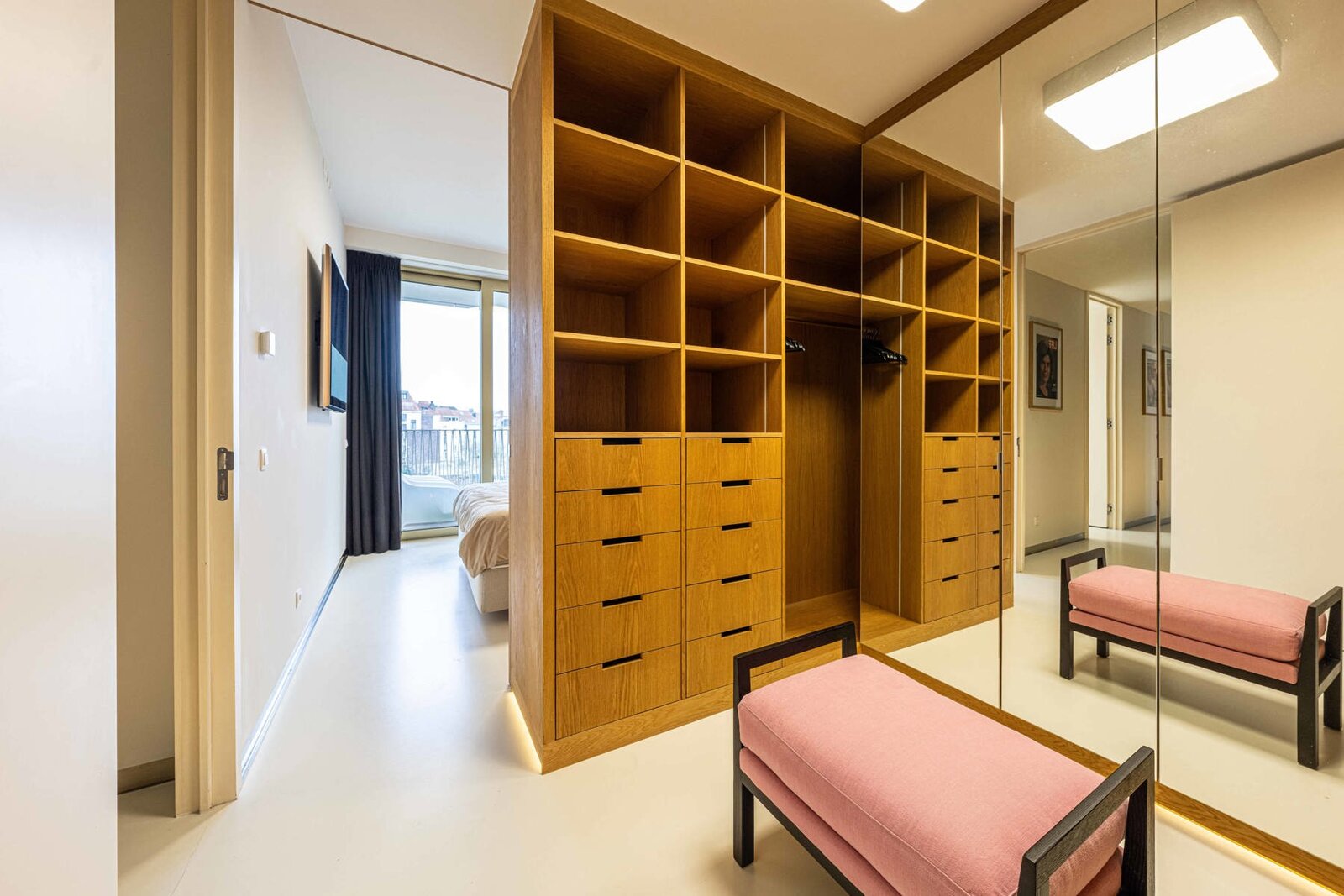 Het appartement bestaat uit een inkomhal met apart toilet, ruime ontvangstruimten waaronder een prachtige woonkamer met aangrenzend terras, een open keuken volledig uitgerust met luxe inbouwapparatuur, drie slaapkamers (waaronder een hoofdslaapkamer met dressing en aangrenzende badkamer en sauna), een doucheruimte, en de 3 slaapkamers hebben toegang tot het achterterras. Alle gebruikte materialen zijn van de allerbeste kwaliteit en de woning voldoet aan de huidige energienormen.