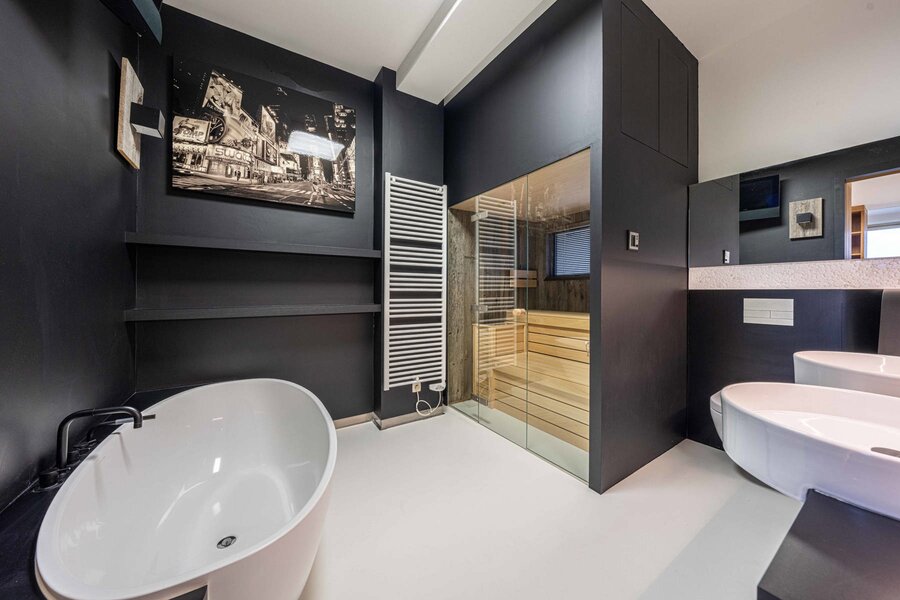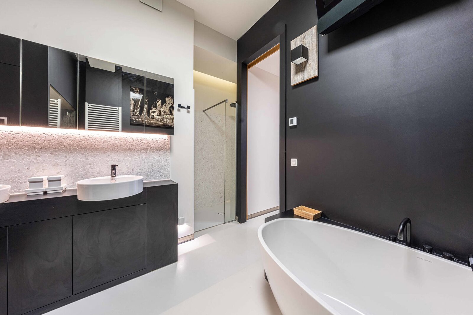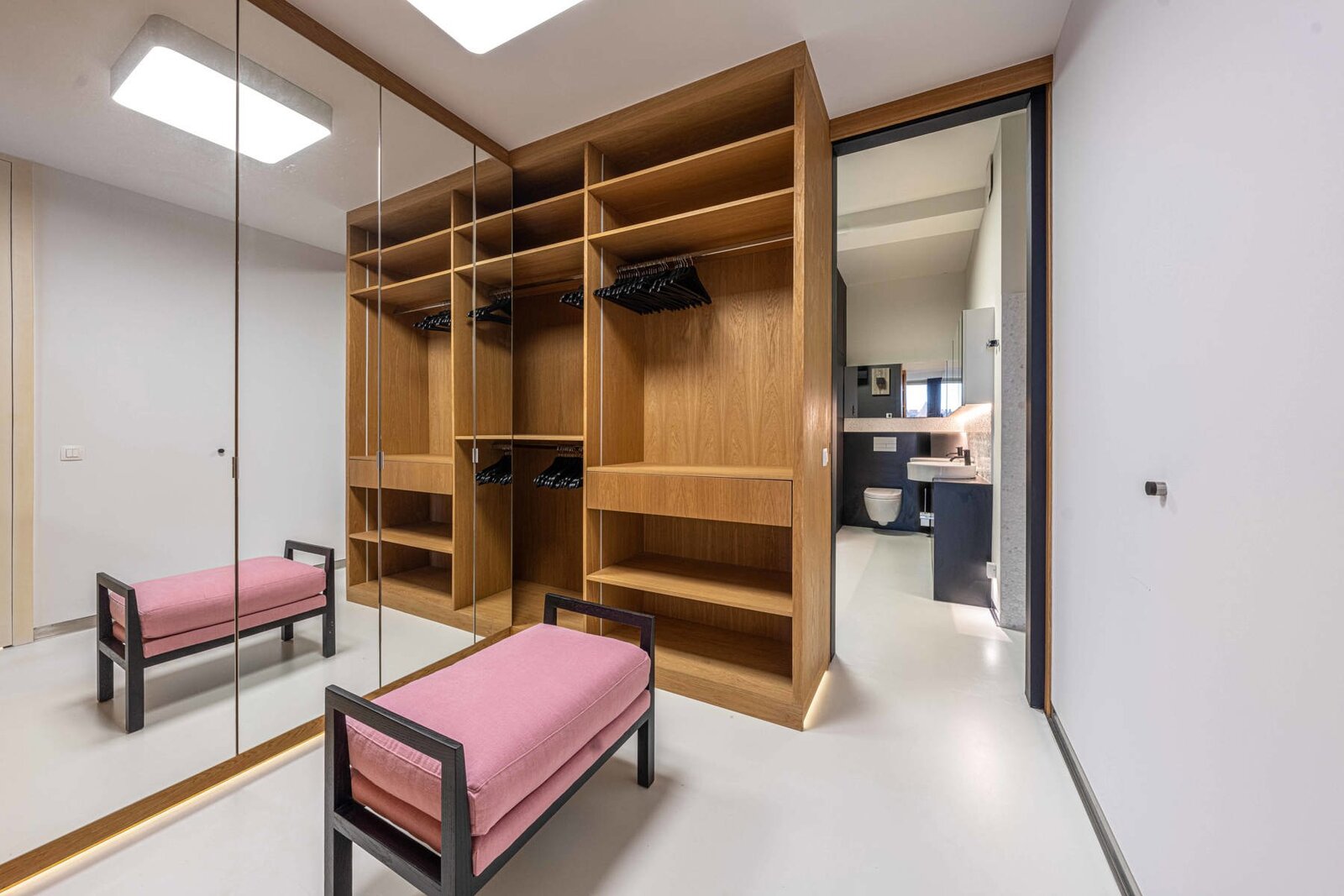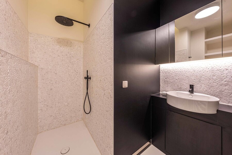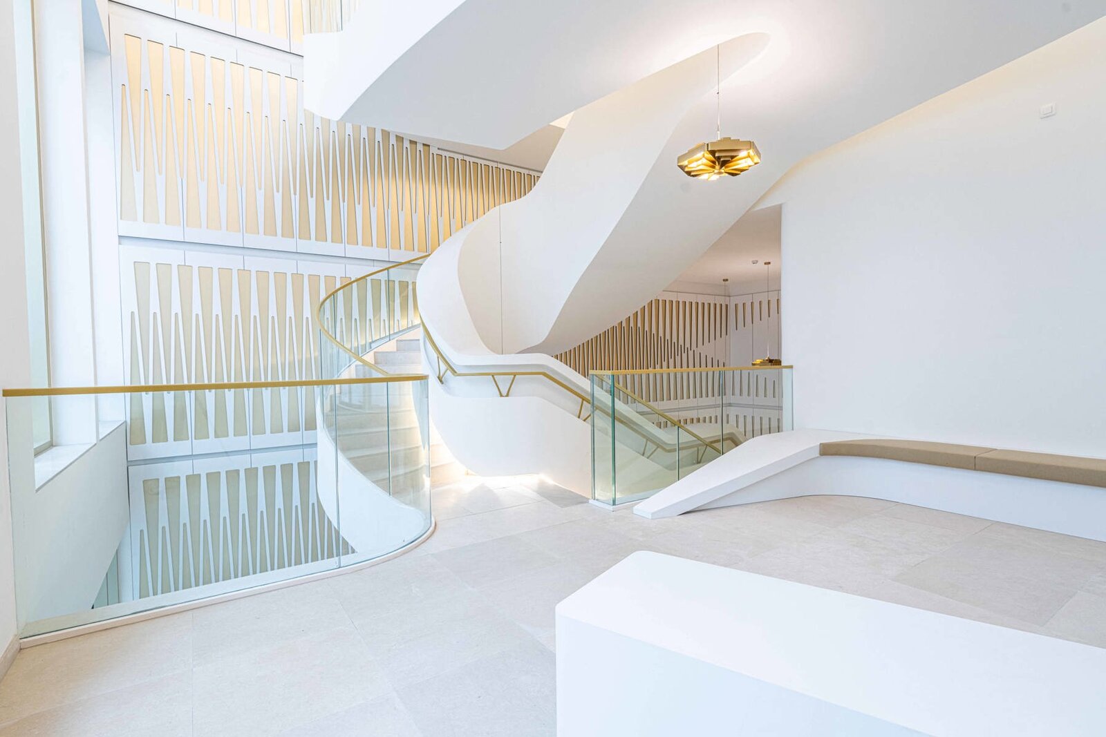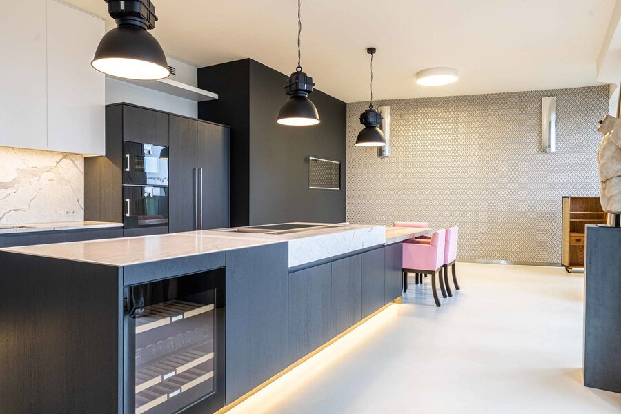 Het appartement bestaat uit een inkomhal met apart toilet, ruime ontvangstruimten waaronder een prachtige woonkamer met aangrenzend terras, een open keuken volledig uitgerust met luxe inbouwapparatuur, drie slaapkamers (waaronder een hoofdslaapkamer met dressing en aangrenzende badkamer en sauna), een doucheruimte, en de 3 slaapkamers hebben toegang tot het achterterras. Alle gebruikte materialen zijn van de allerbeste kwaliteit en de woning voldoet aan de huidige energienormen.