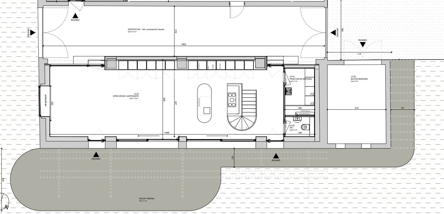 Gelijkvloers: Buitenberging, imposante wintertuin, inkomhal met unieke trap, technisch lokaal/berging, apart toilet, zeer ruime living met veel lichtinval en prachtige open keuken. Aanpalend een studio met kitchenette , toilet en douche.