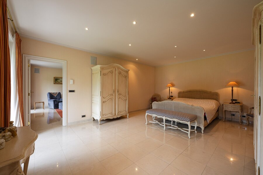 Het centrale gedeelte van de villa bestaat uit een inkomhal met vestiaire en gastentoiletten, een dubbele woonkamer met open haard, een eetkamer, een aparte keuken met kookeiland, een veranda met open haard, een bureau met ingebouwd meubilair en een ontvangstruimte. Op de verdieping bevinden zich 4 slaapkamers, elk met een badkamer, waaronder een master suite met dressing, salon en terras. De zijvleugels herbergen een verwarmd binnenzwembad, een sauna, een jacuzzi, kleedkamers, een fitnessruimte, een biljartkamer, drie garages, multifunctionele ruimtes en een zolder. Volledige kelder toegankelijk vanuit elke vleugel.