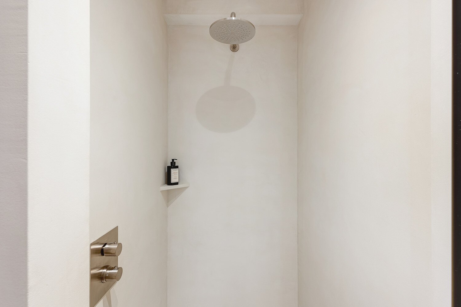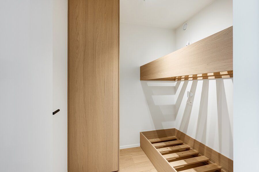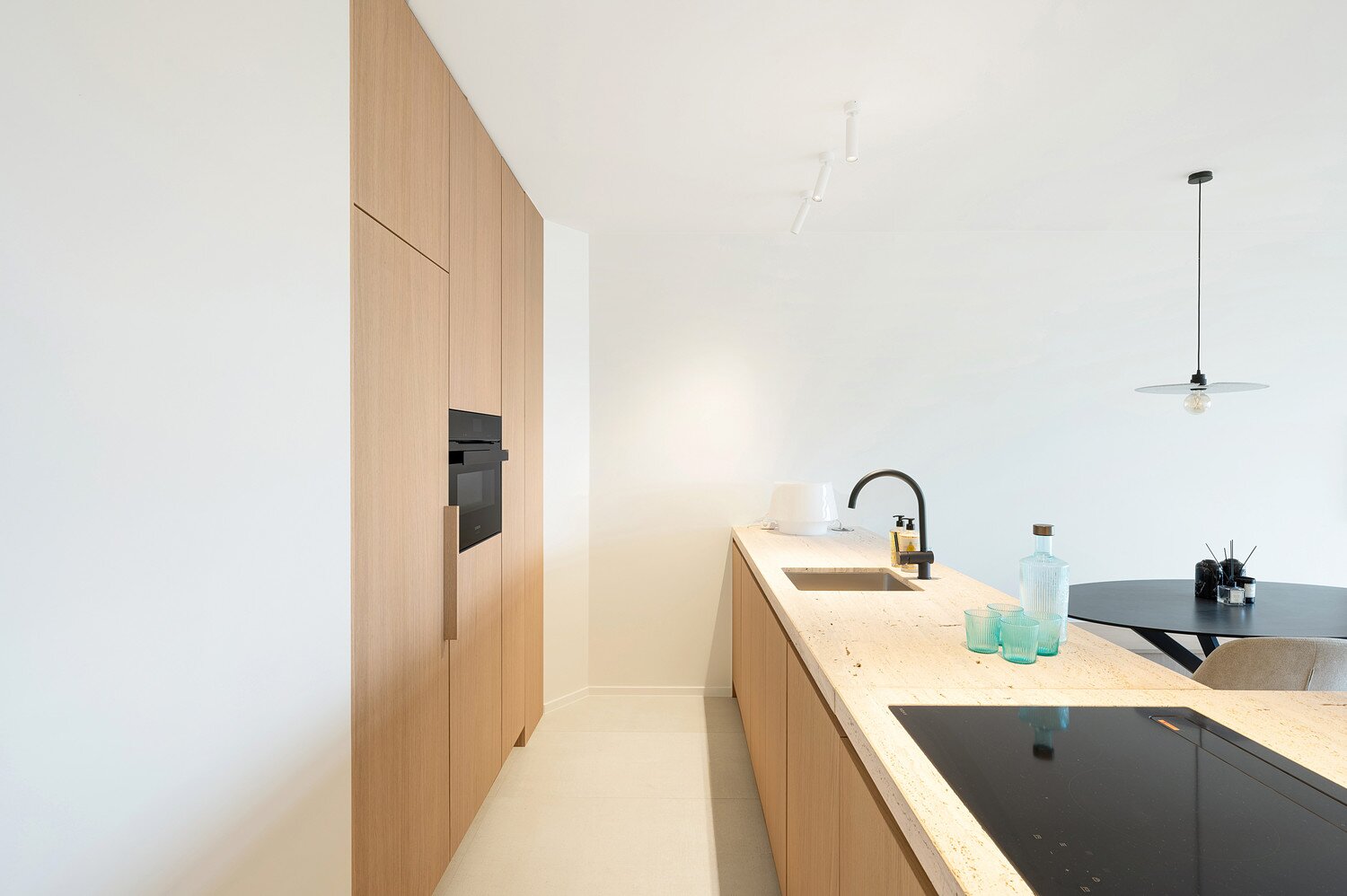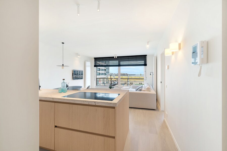 De inkomhal met vestiaire en bergruimte leidt naar een ruime en lichtrijke leefruimte met zicht op zee. De open keuken is uitgerust met een groot kookeiland in natuursteen en hedendaagse toestellen. Voorin bevindt zich een slaapkamer met zicht op zee en eigen badkamer met inloopdouche en toilet. Daarnaast is er een praktische kinderkamer met ingemaakte kast en stapelbed. De masterbedroom ligt achteraan en beschikt eveneens over een ensuite badkamer.