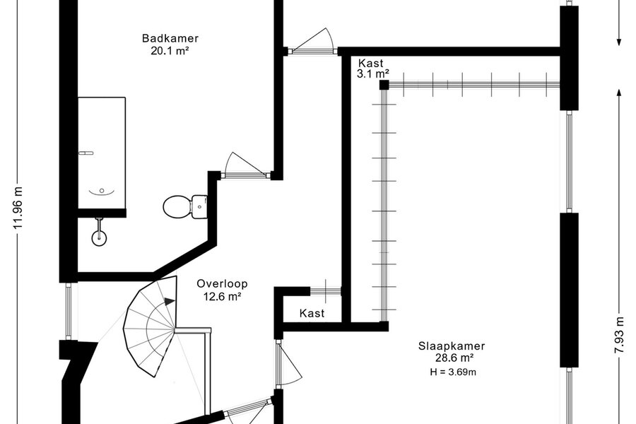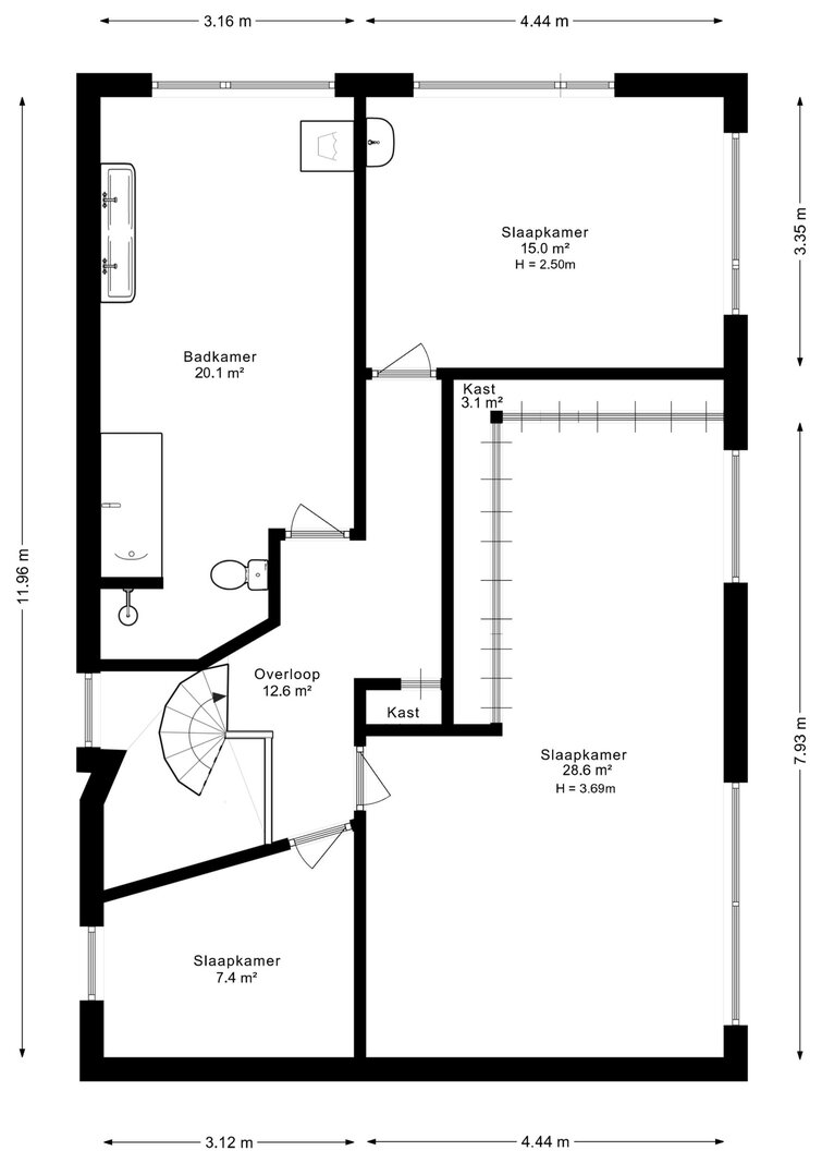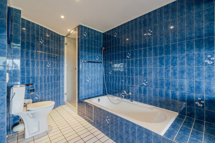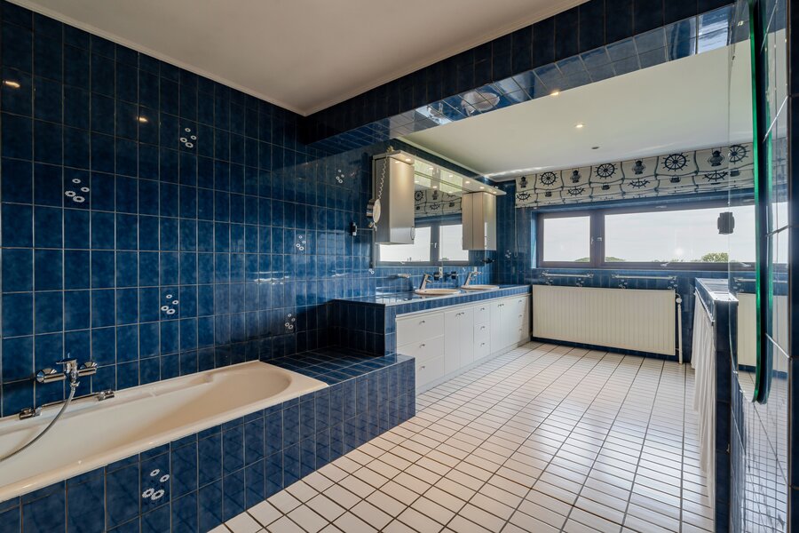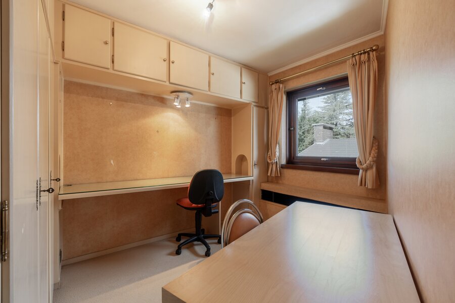 1ste verdiep : Bureel, 2 kamers waarvan 1 met grote dressing (mogelijkheid voor 3 kamers) en badkamers voorzien van ligbad, douche, toilet en wastafel.
