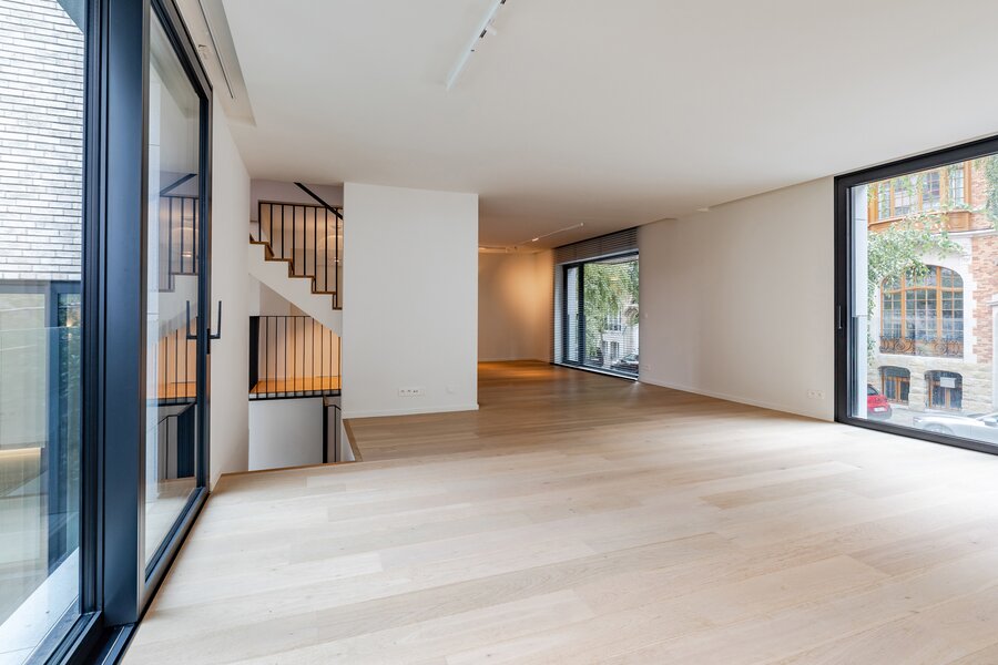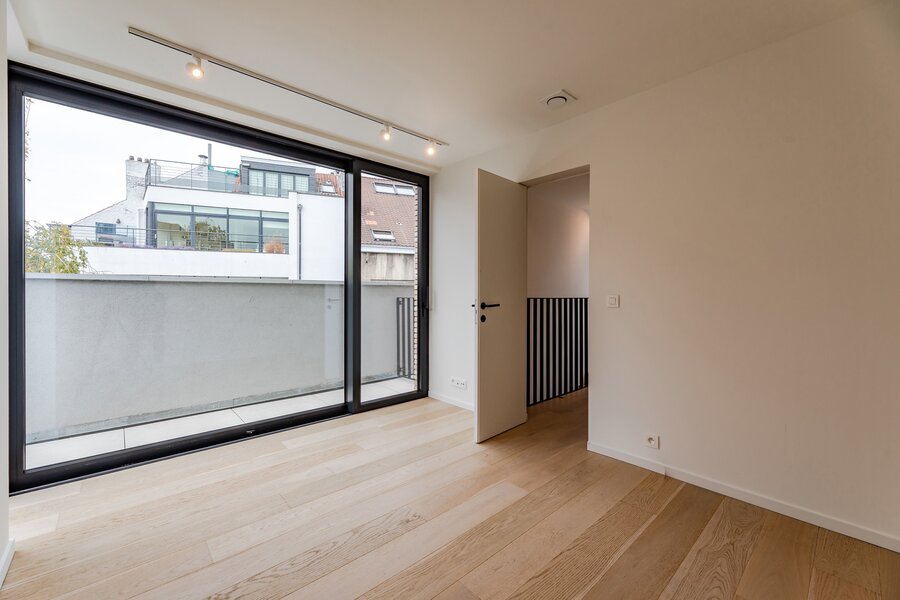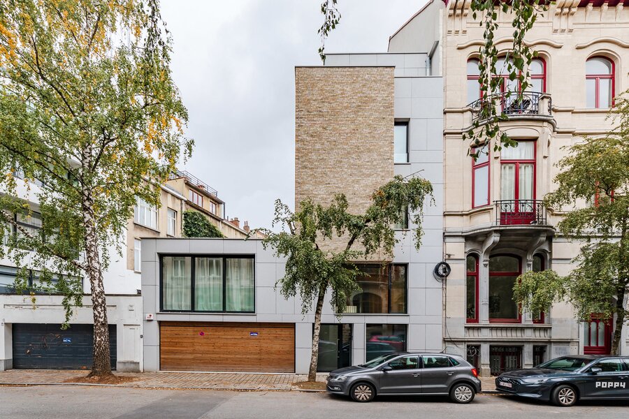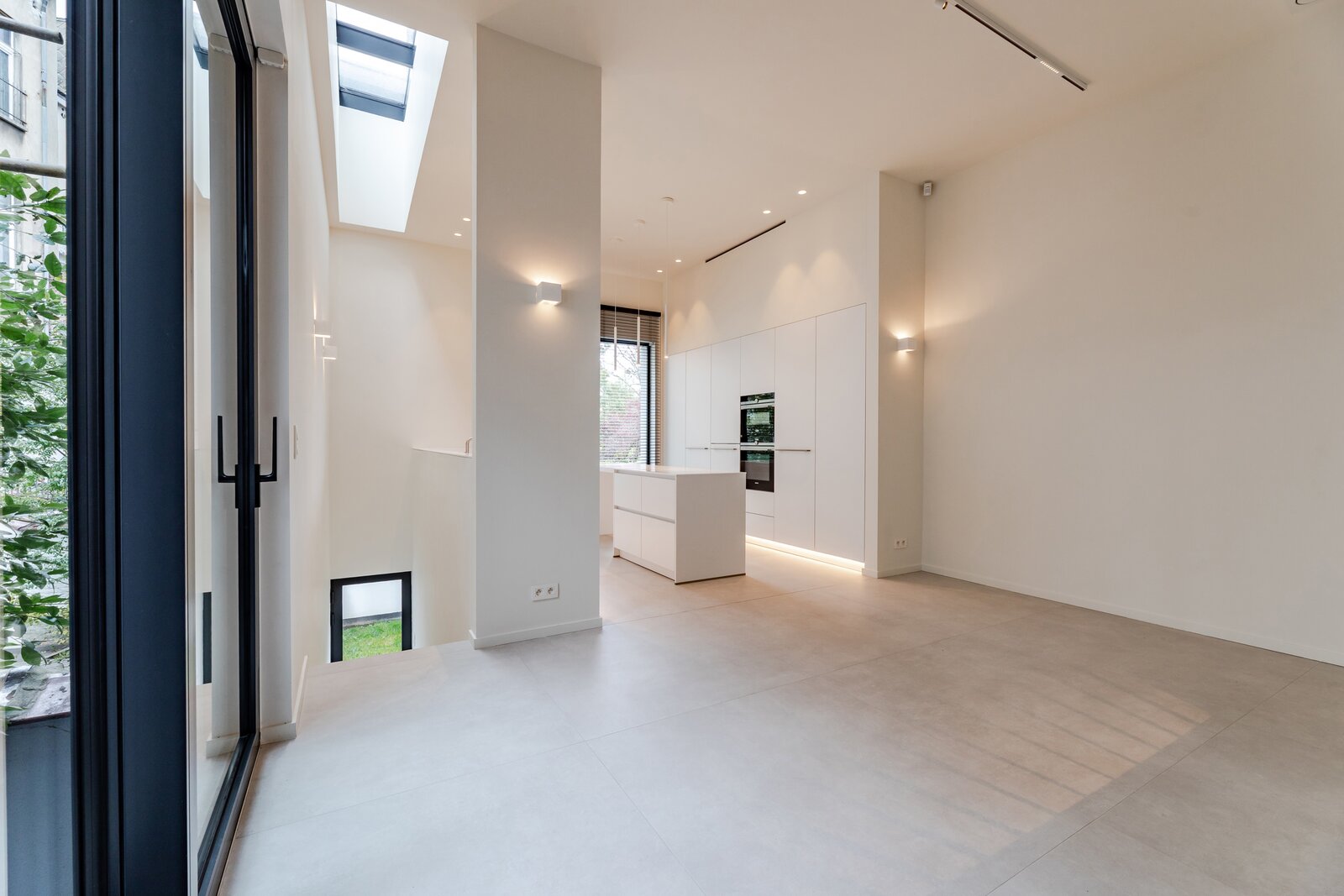 Op loopafstand van het Brugmannplein, prachtige nieuwe moderne woning met een gevel van 11 meter. Zeer licht dankzij de drie gevels. Met een bruto oppervlakte van 467 m², 4 complete suites, een ruimte voor de uitoefening van een vrij beroep, een wellnessruimte met sauna (optionele uitrusting), verschillende terrassen en een charmante tuin (terrein +/- 160 m²). Mogelijkheid om een vijfde slaapkamer in te richten in de ruimte voor de vrije beroepsuitoefening. Lift, garages voor 2 auto's + fiets- en motorparking. EPB A