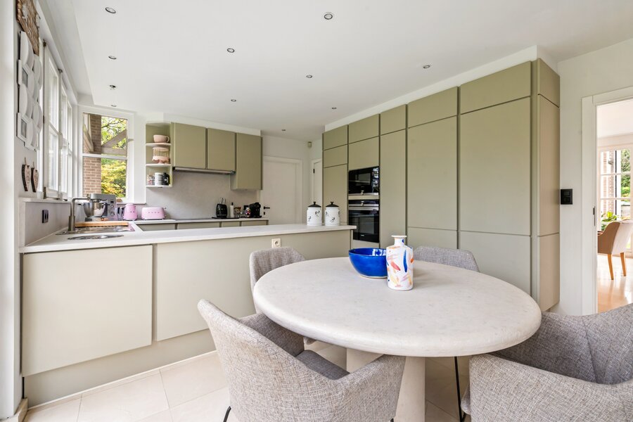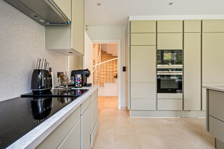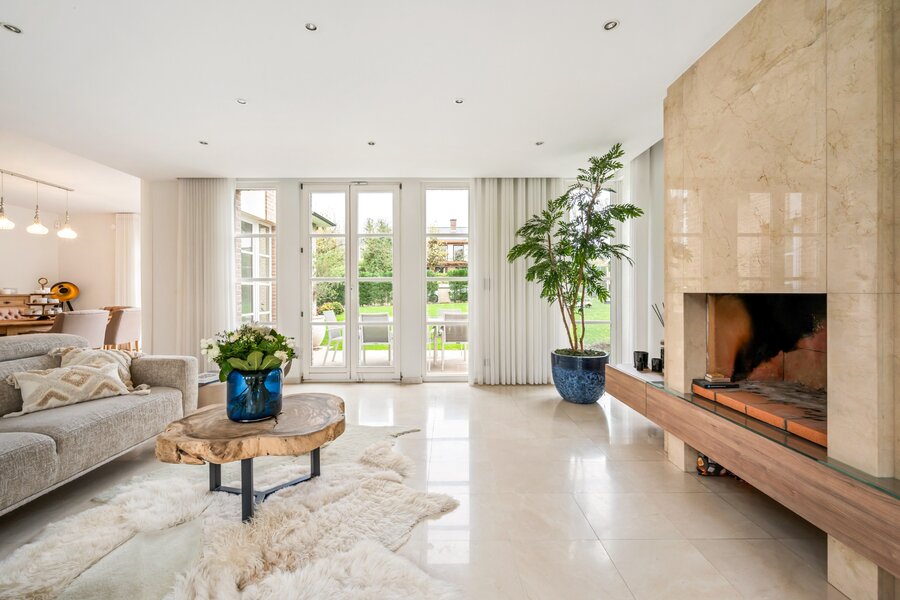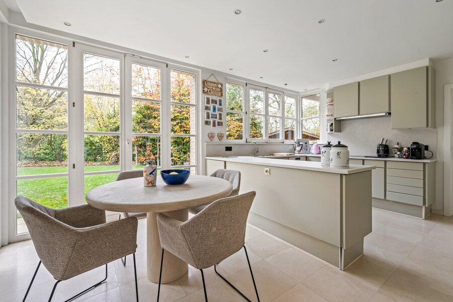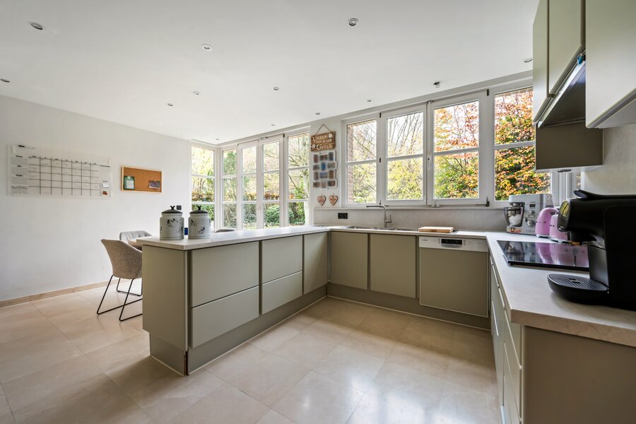 De prachtige leefruimte is smaakvol ingericht en is heel aangenaam vertoeven dankzij de vloerverwarming en open haard. Aansluitend bevindt zich de praktische, volledig uitgeruste keuken met toestellen van A-merken, ideaal voor wie houdt van koken in een stijlvolle, functionele omgeving en geniet dankzij de grote raampartijen van overvloedige lichtinval.