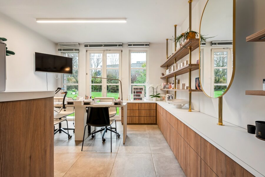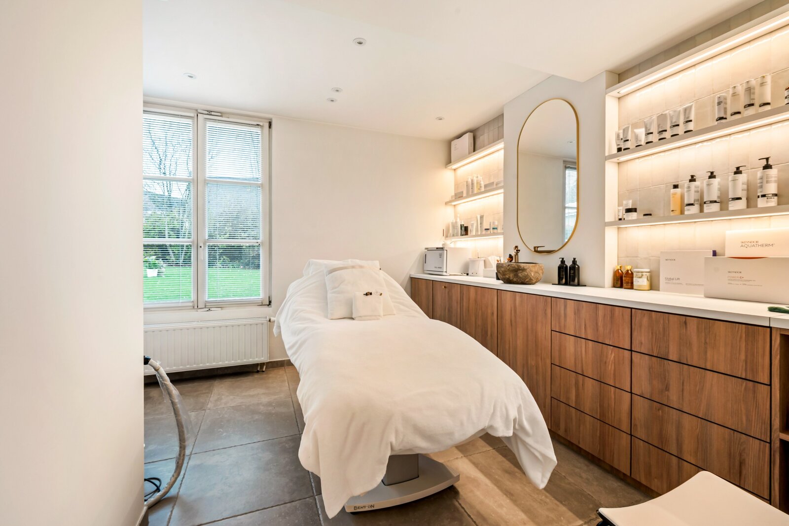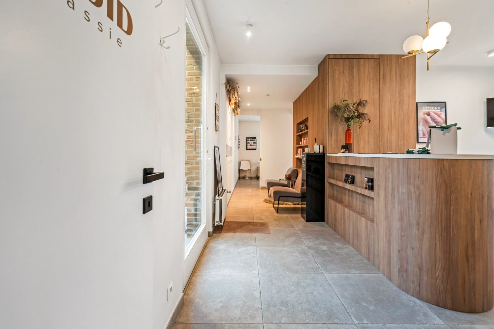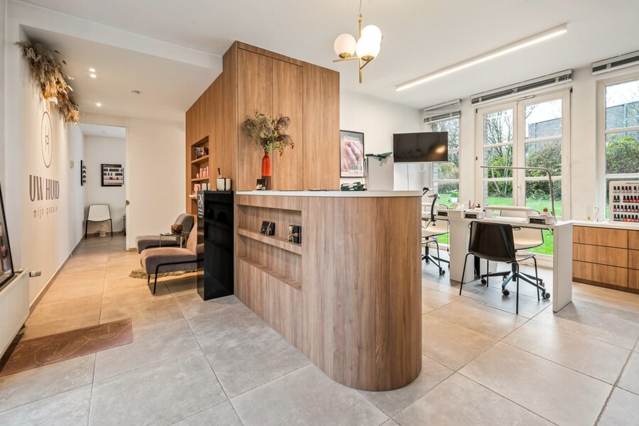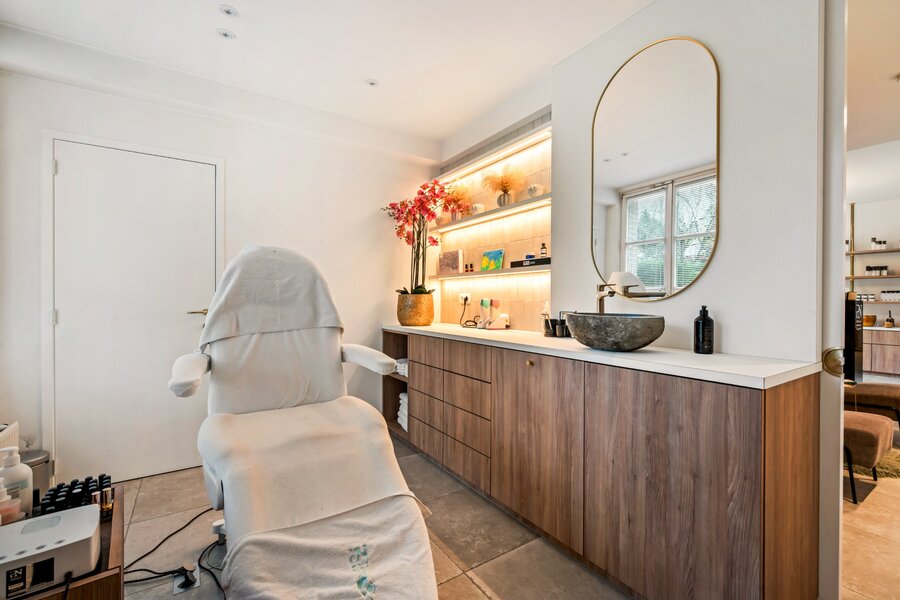 Op het gelijkvloers bevindt zich een volledig ingerichte schoonheidssalon. Deze kan naar wens eenvoudig omgevormd worden tot: kantoor of praktijkruimte voor vrij beroep, gastenverblijf, hobbyruimte, studio voor au pair,...