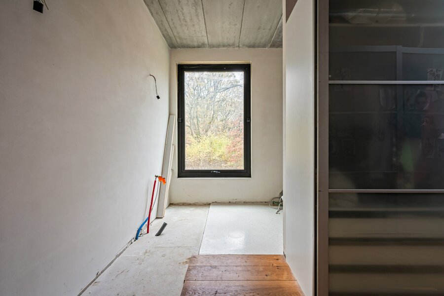 Verder bevindt er zich de master bedroom met aansluitend een badkamer die naar eigen smaak te voltooien is. De overige verdieping bestaat uit 2 slaapkamers met ingemaakte kasten en een badkamer met douche en lavabomeubel.