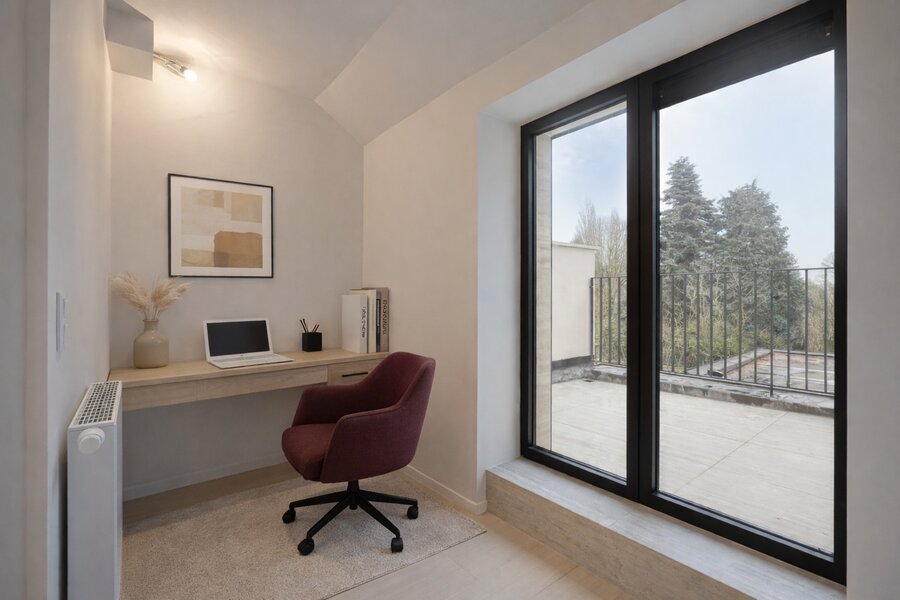 Op het gelijkvloers bevindt zich een aangename leefruimte die uitgeeft op een gezellig terras, ruimte die zowel als slaapkamer of als bureauruimte kan ingericht worden, ruime douche en apart toilet.