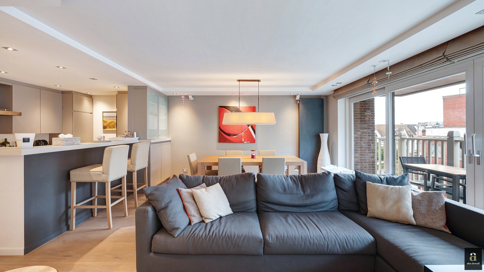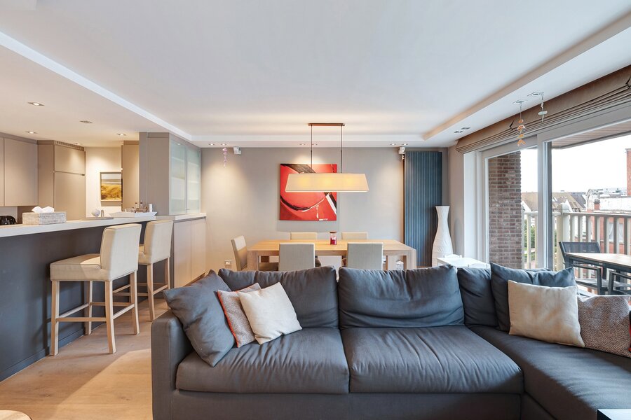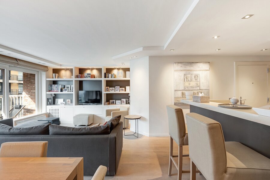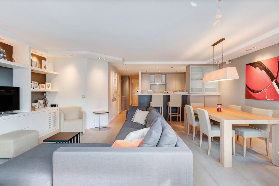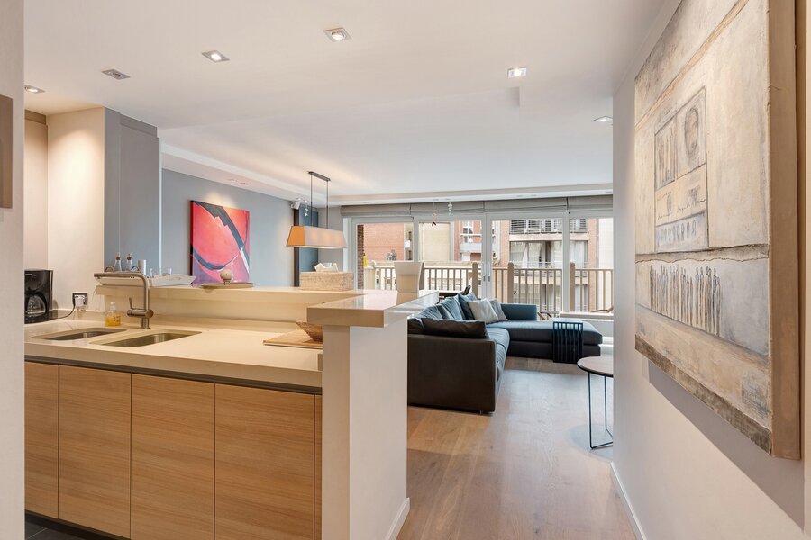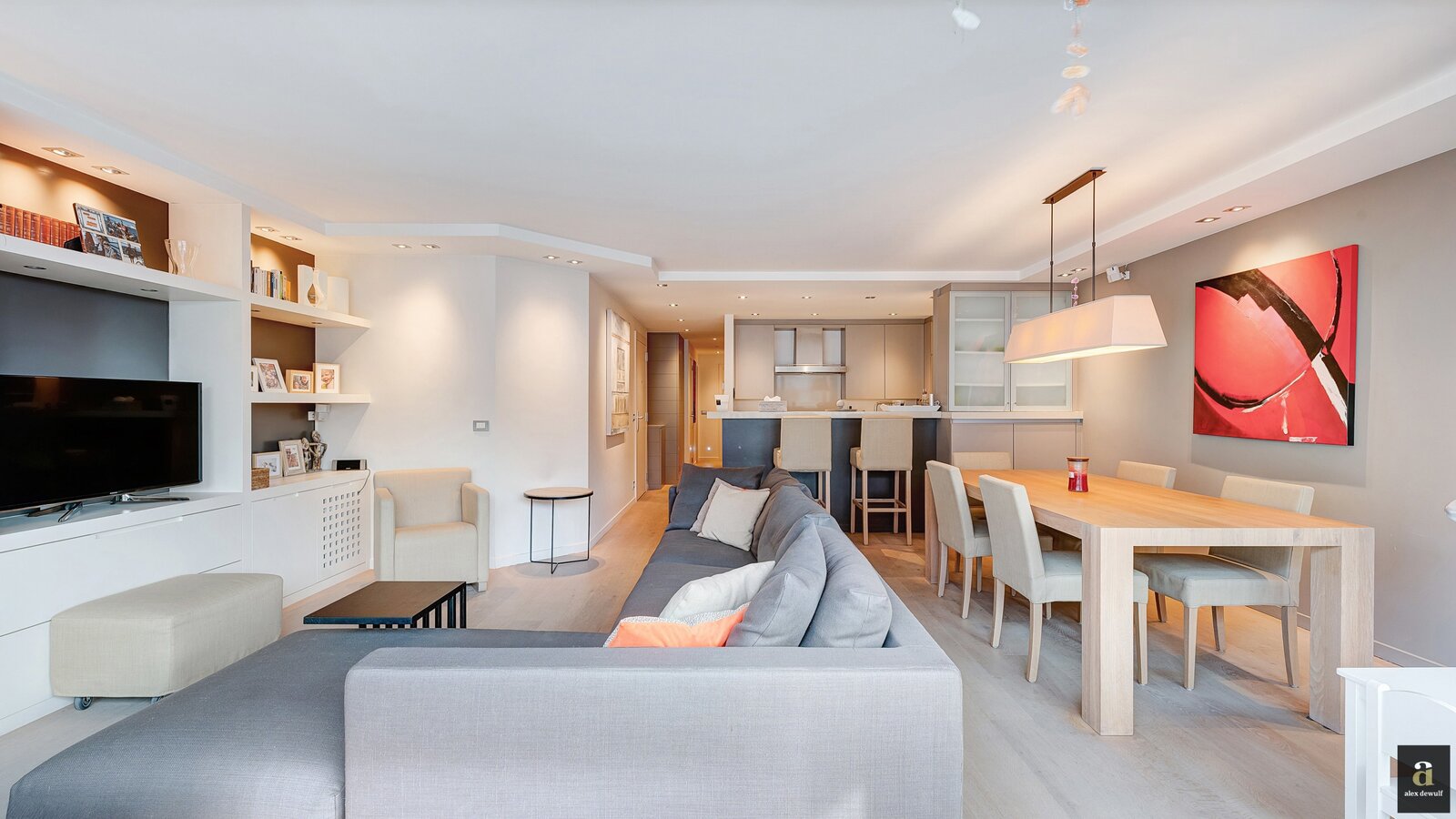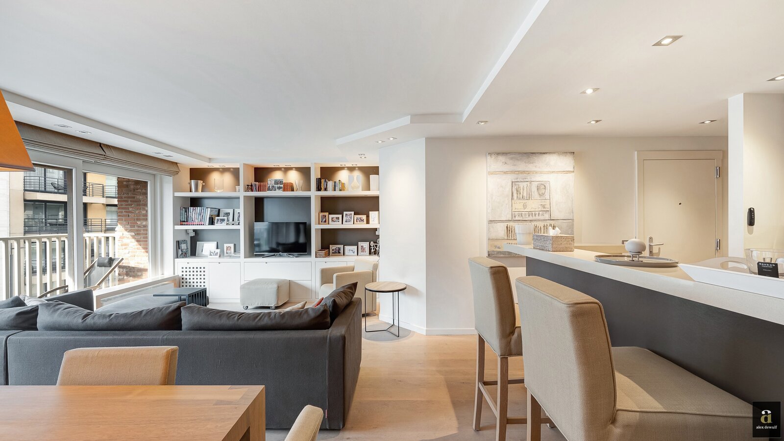 De woonkamer is voorzien van vier elektrische stores met afstandsbediening, en het volledige appartement kreeg in 2024 een nieuwe LED-verlichting met talrijke dimmers voor een warme, regelbare sfeer. De open keuken met keukeneiland sluit harmonieus aan bij de eet- en zithoek.