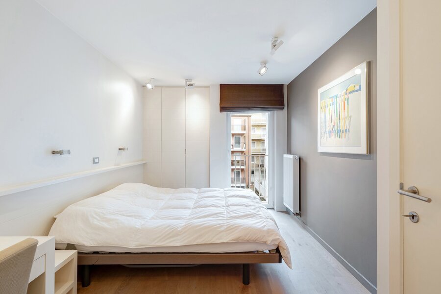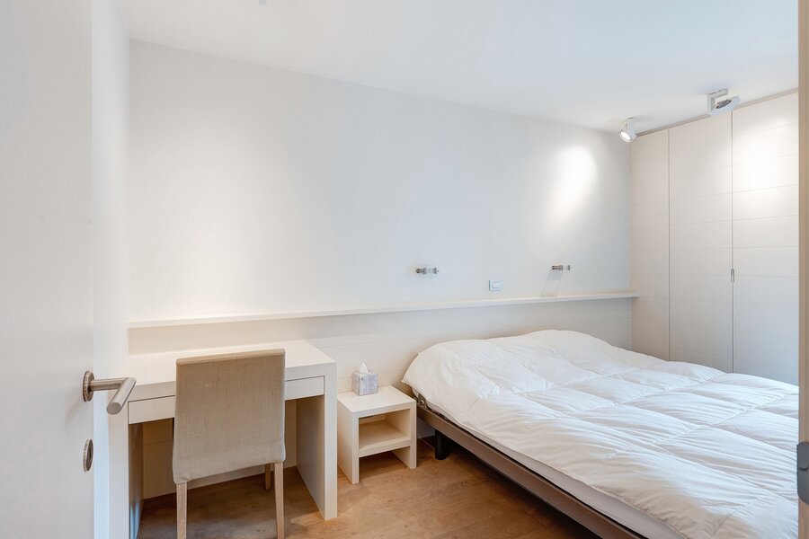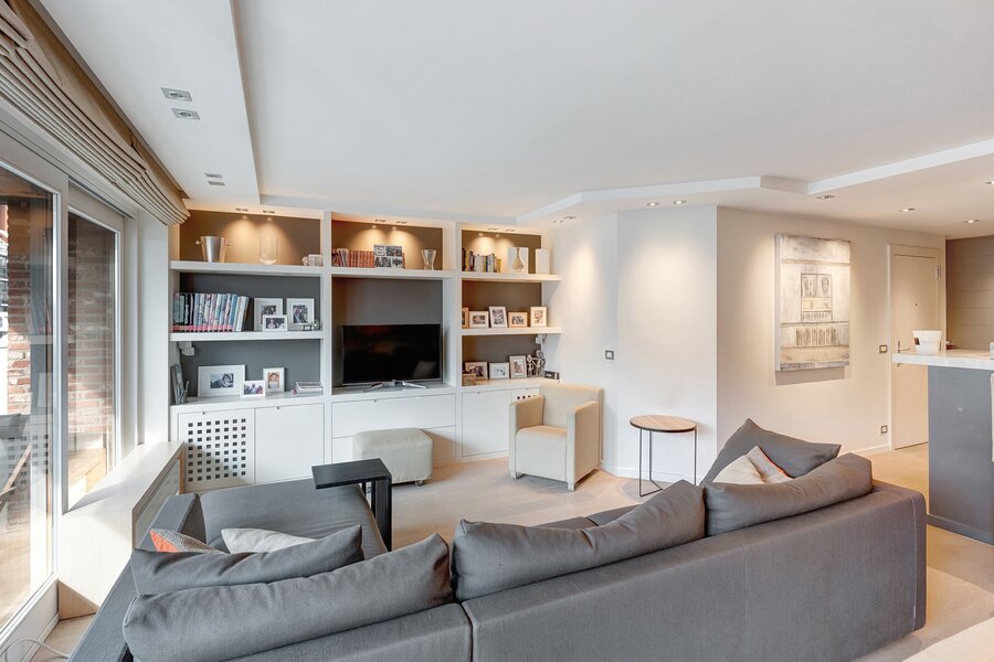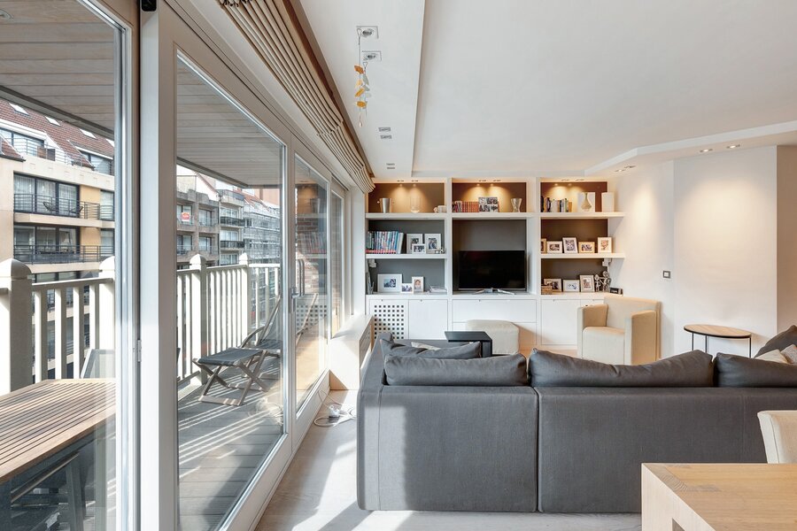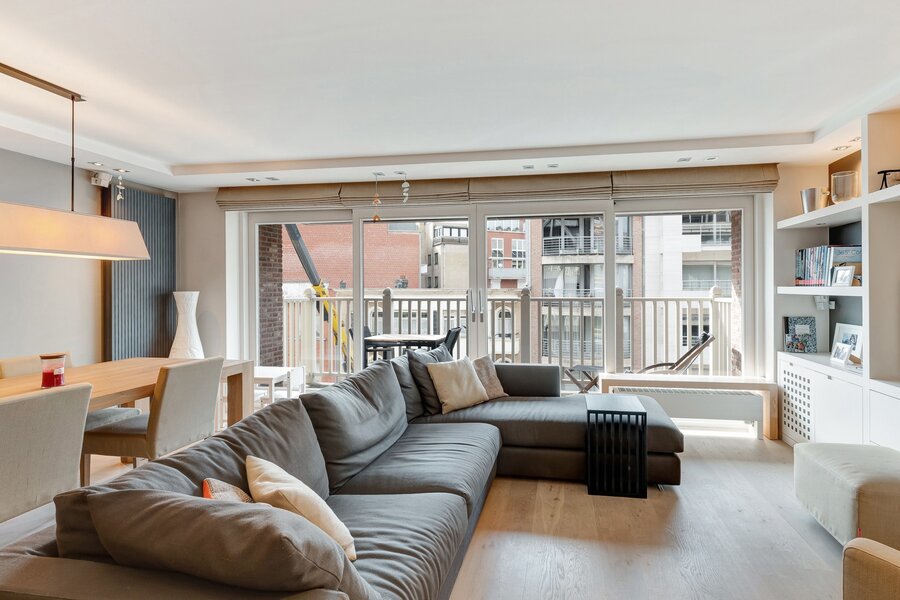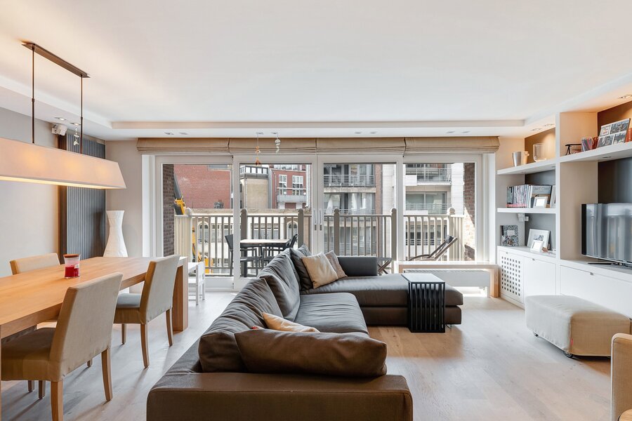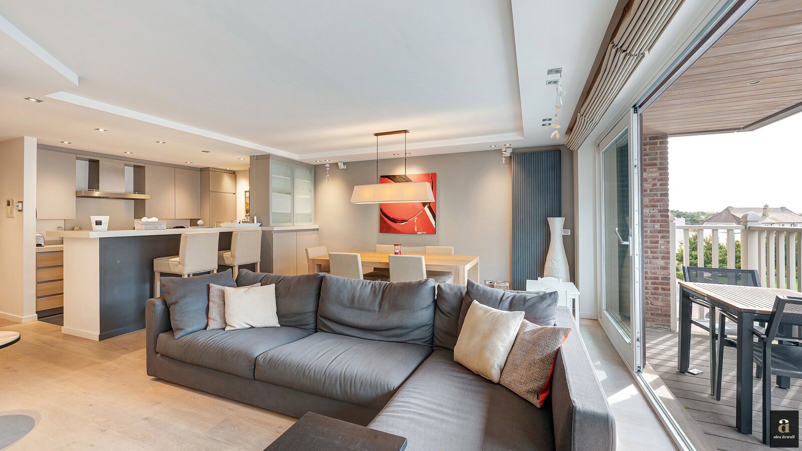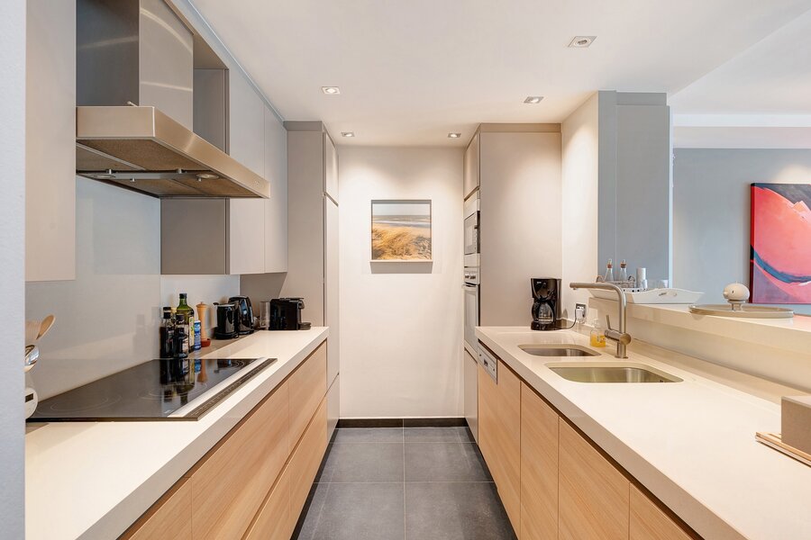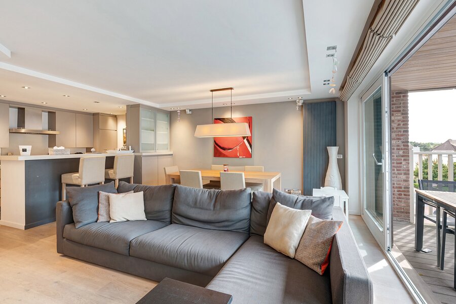 De woonkamer is voorzien van vier elektrische stores met afstandsbediening, en het volledige appartement kreeg in 2024 een nieuwe LED-verlichting met talrijke dimmers voor een warme, regelbare sfeer. De open keuken met keukeneiland sluit harmonieus aan bij de eet- en zithoek.