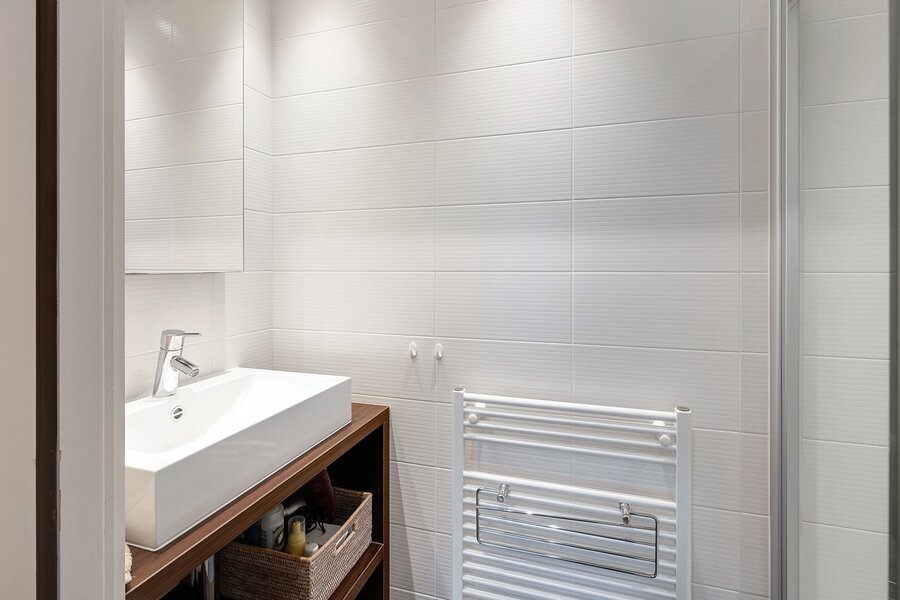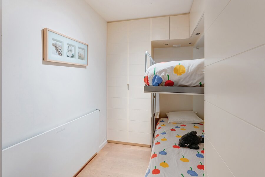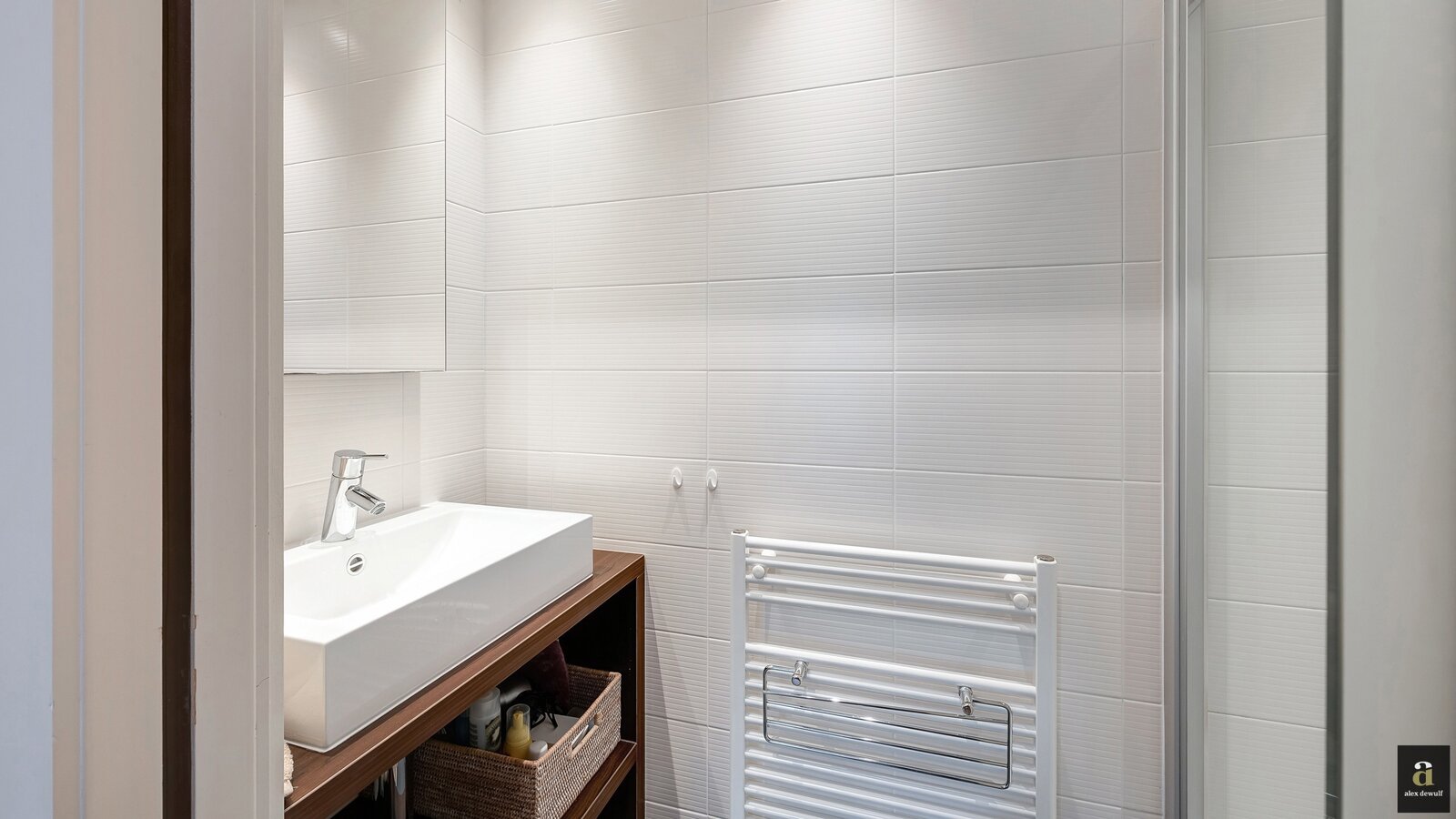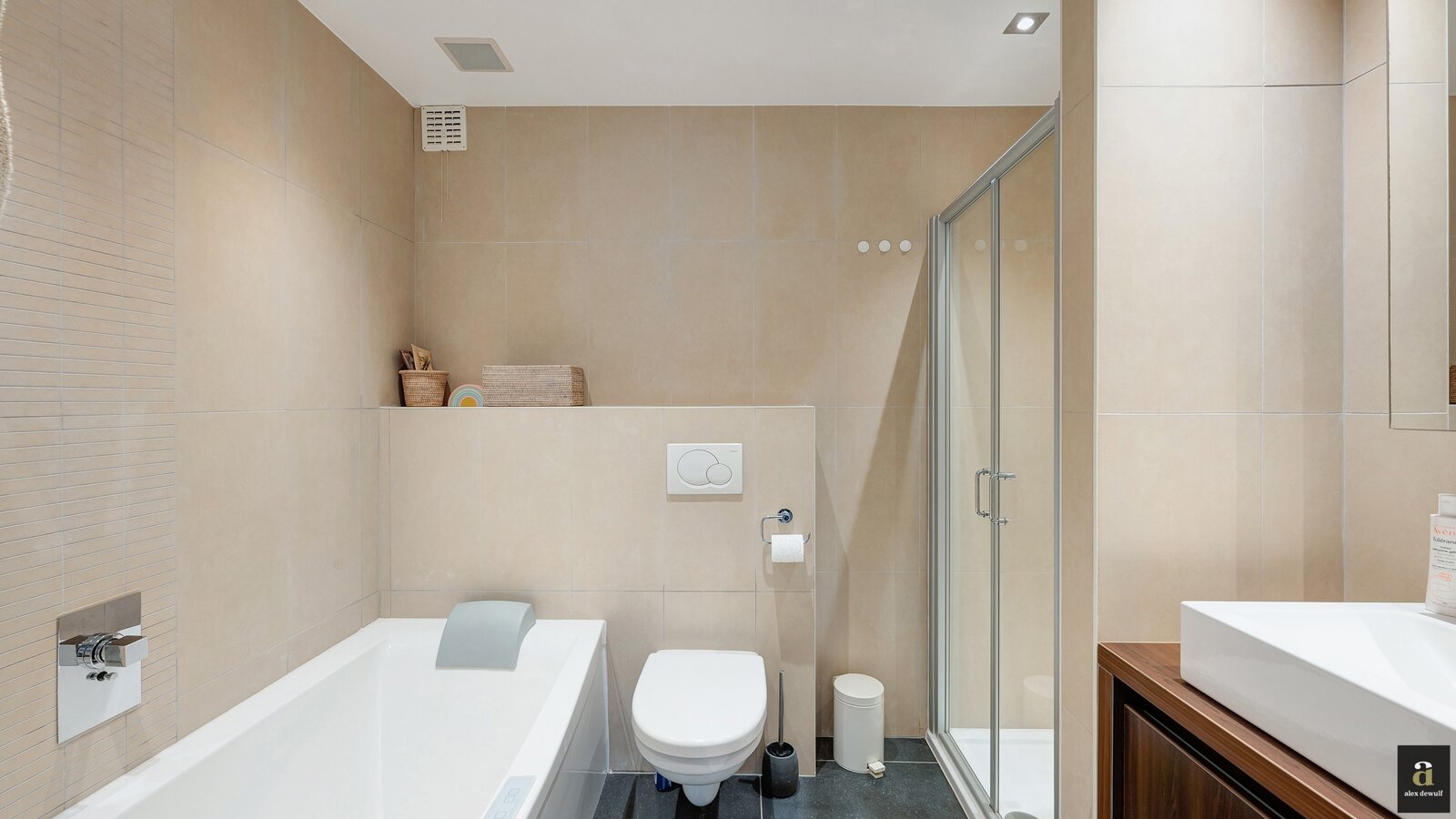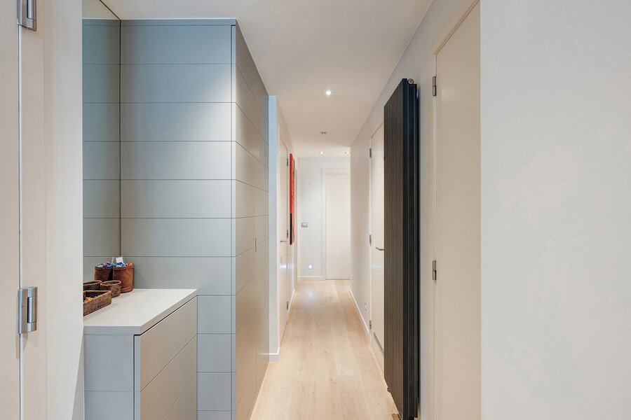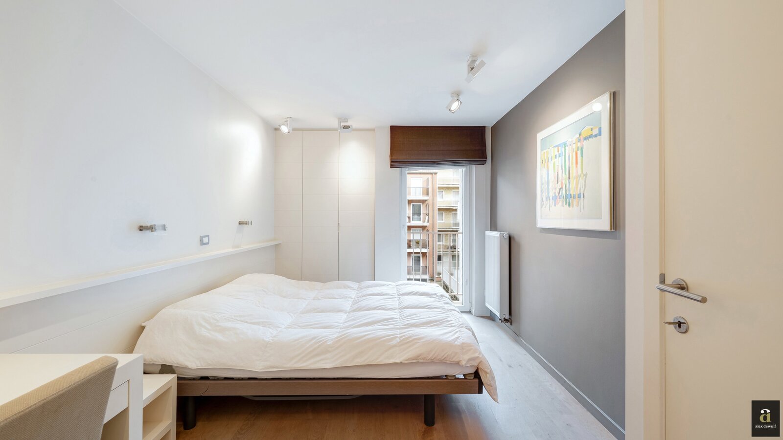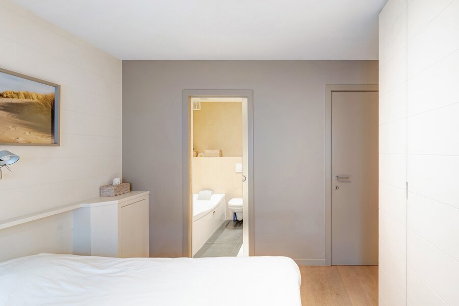 De woonkamer is voorzien van vier elektrische stores met afstandsbediening, en het volledige appartement kreeg in 2024 een nieuwe LED-verlichting met talrijke dimmers voor een warme, regelbare sfeer. De open keuken met keukeneiland sluit harmonieus aan bij de eet- en zithoek.