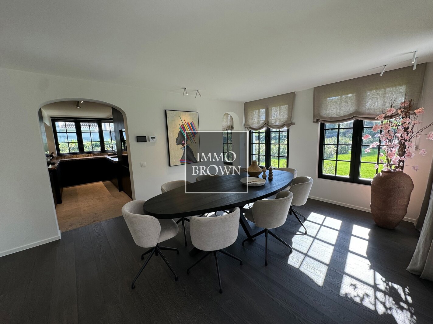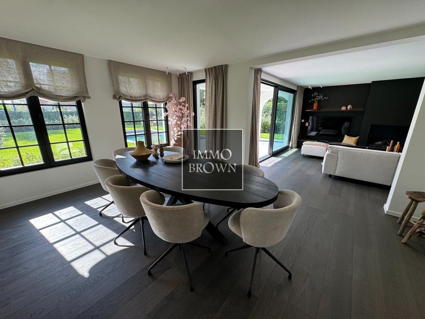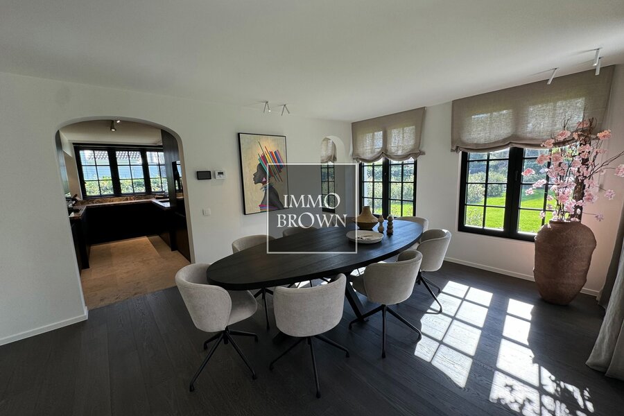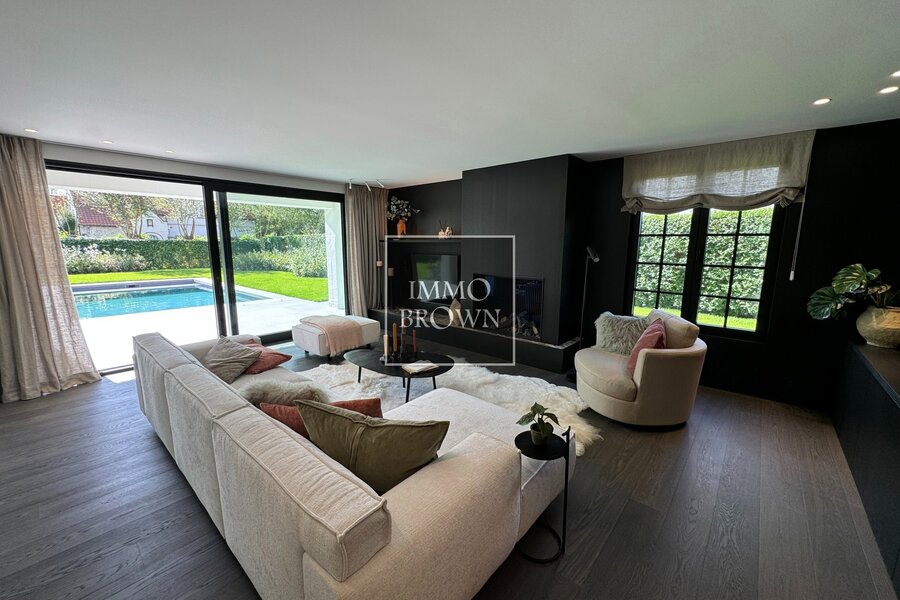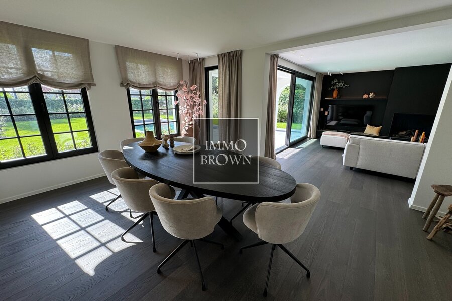 De royale living met sfeervolle openhaard en de aansluitende eetkamer baden in het licht dankzij de grote raampartijen die een prachtig zicht bieden op het zuidgerichte terras en de stijlvol aangelegde tuin met verwarmd zwembad. Deze ruimtes vloeien harmonieus in elkaar over en creëren een warme, luxueuze woonbeleving.