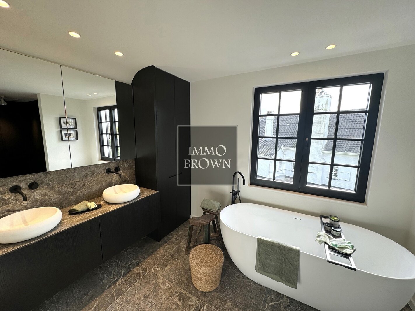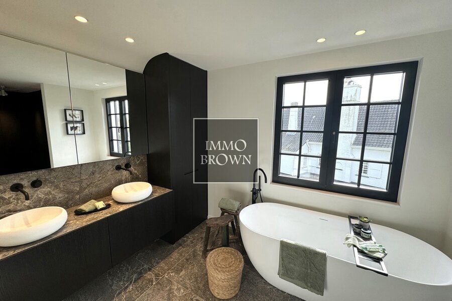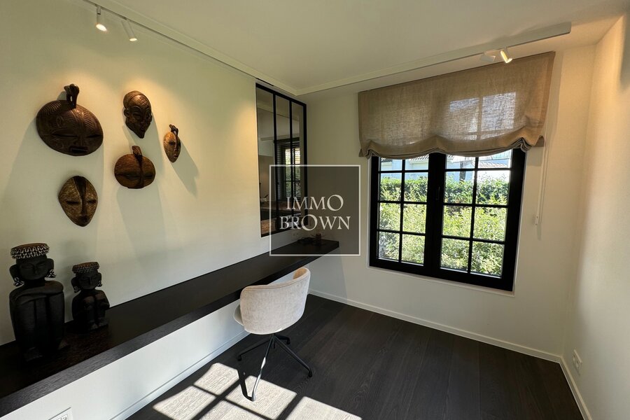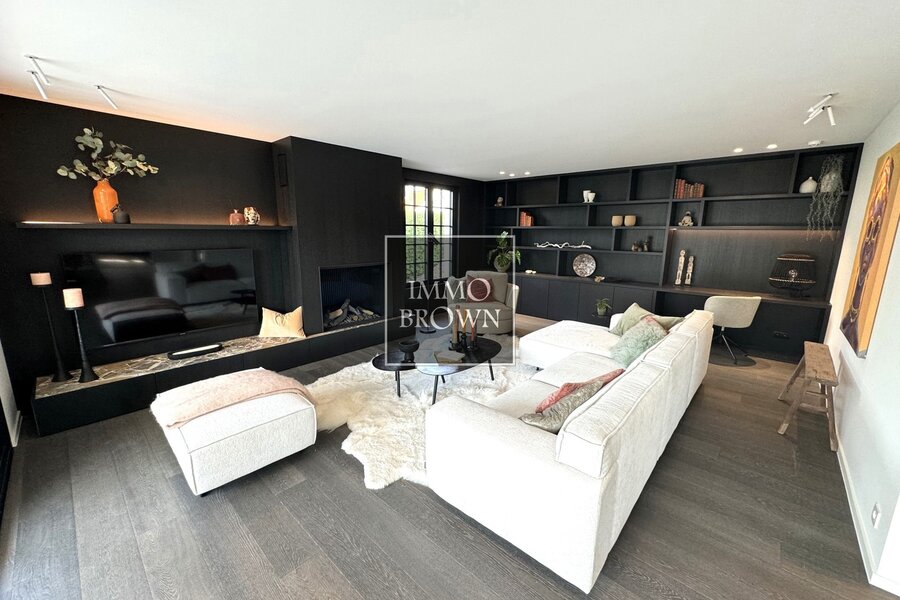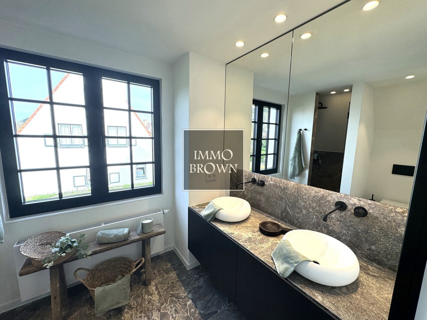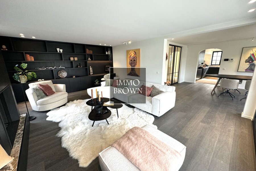 Bij het binnenkomen wordt u verwelkomd in een elegante inkomhal, voorzien van een vestiaireruimte en een stijlvol gastentoilet. De hoogwaardige afwerking zet zich meteen door in de rest van de woning.