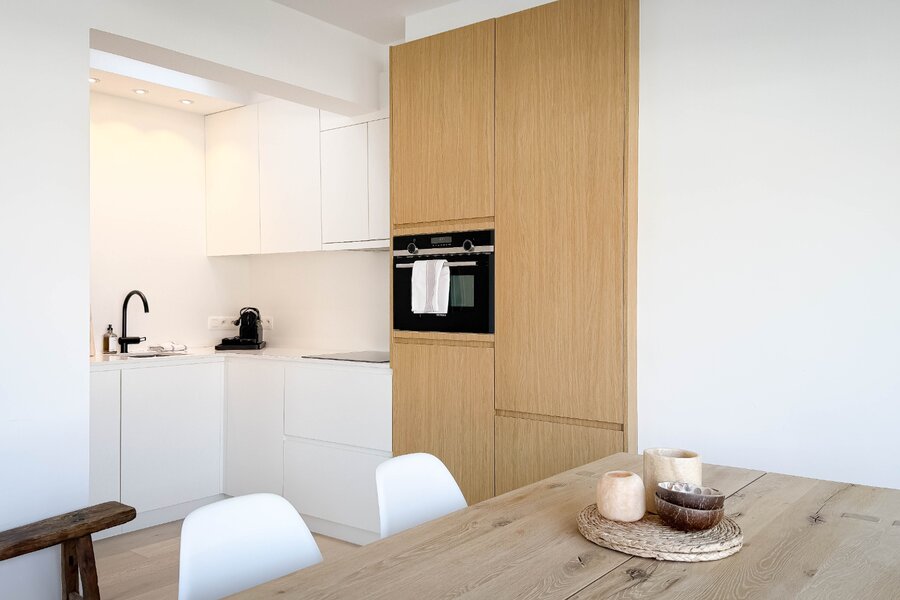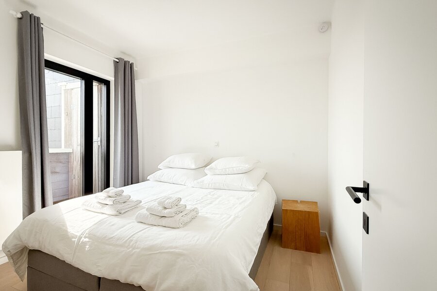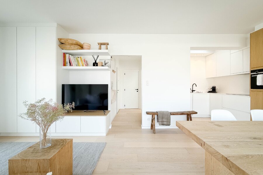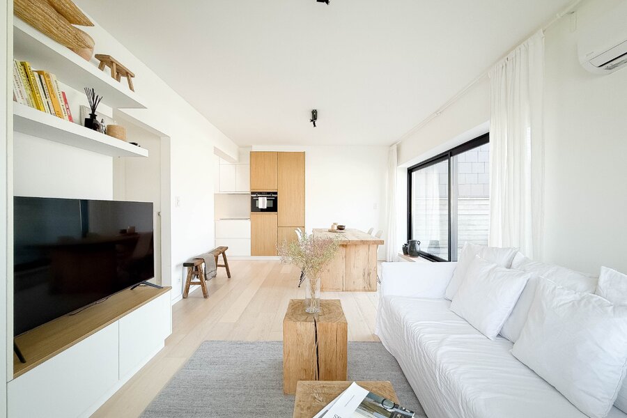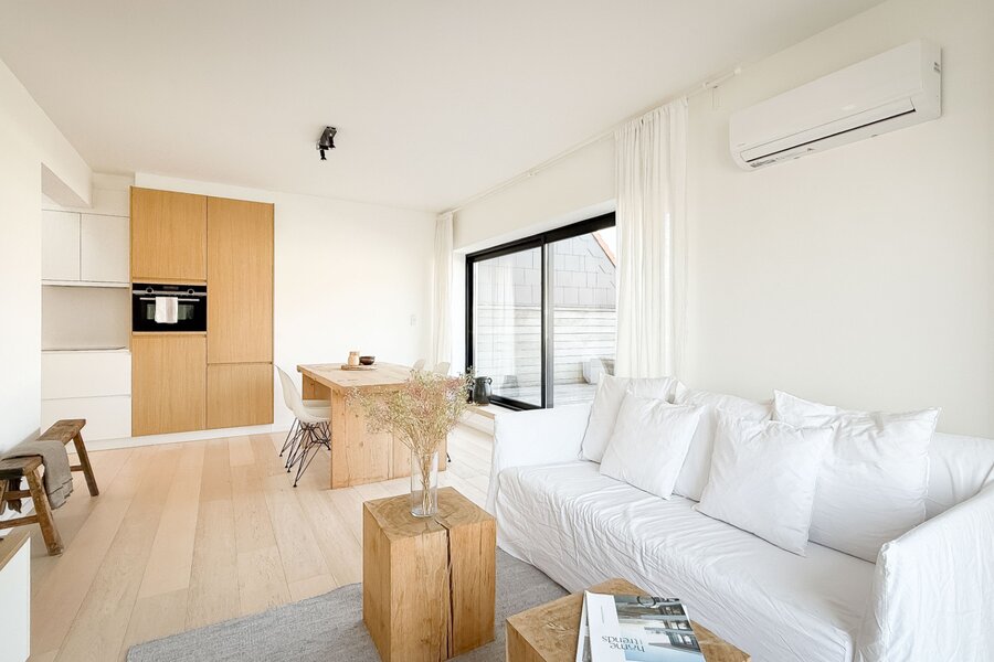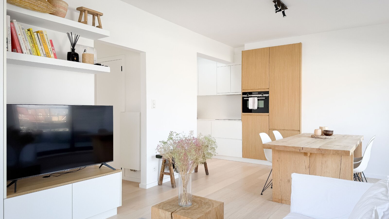 De indeling omvat een lichtrijke leefruimte dankzij de vele raampartijen, een open keuken, één ruime slaapkamer en een moderne badkamer. Het hoekappartement geniet van maximale lichtinval en biedt een panoramisch zicht over het centrum van Knokke.