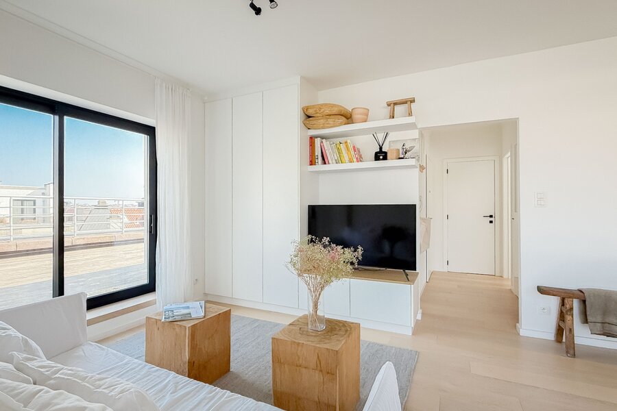 Deze unieke penthouse bevindt zich op de bovenste verdieping. Deze penthouse combineert luxe, comfort en een uitzonderlijke buitenruimte met een royaal terras van maar liefst 120 m², ideaal om in alle privacy te genieten van zon en zicht.