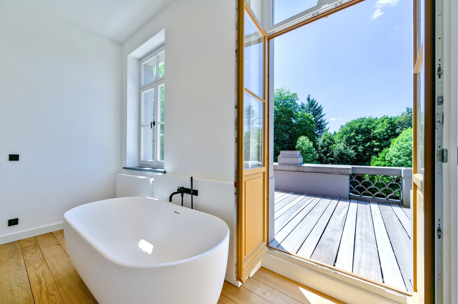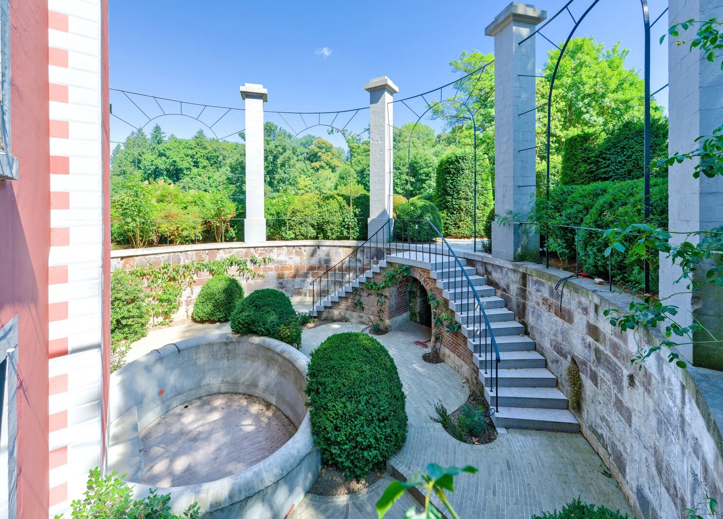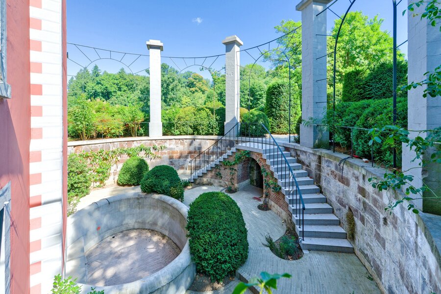 Privéterras in een park met bomen, tuin, kelder, wasruimte, 2 buitenparkings.