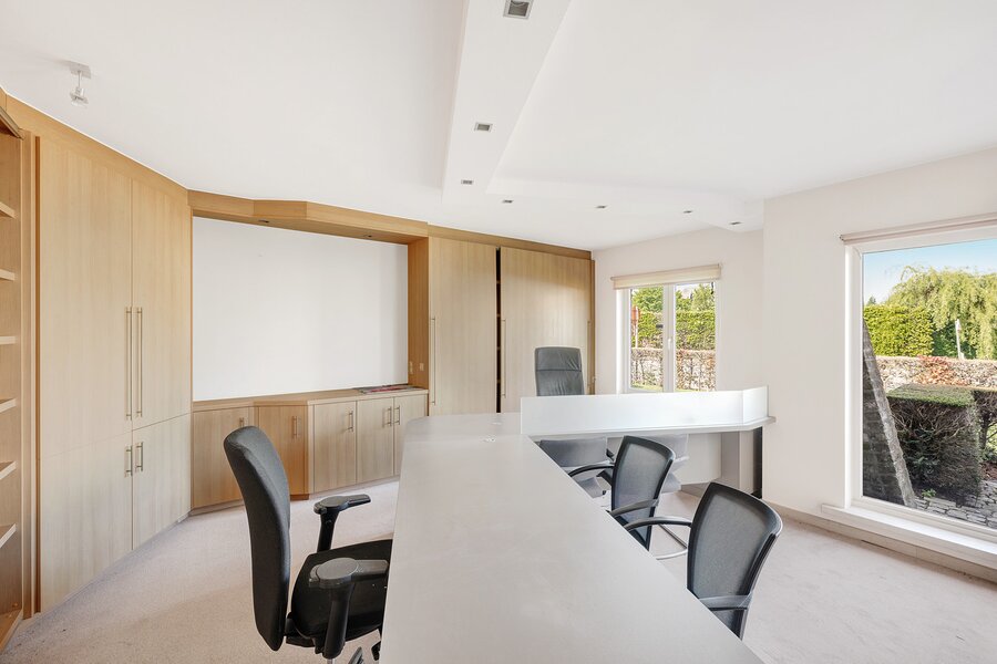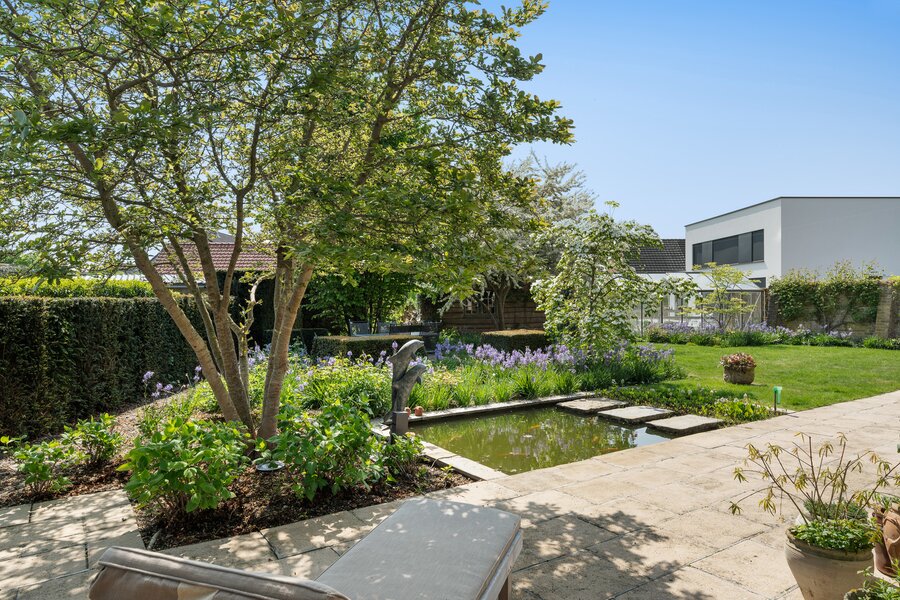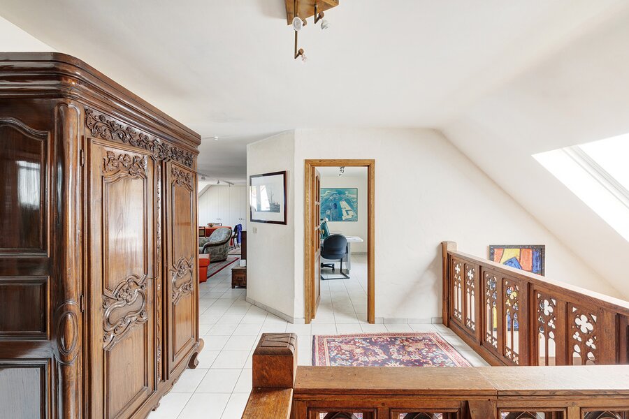 Grote inkomhall, gastentoilet, koeleberging en grote bijkeuken, afzonderlijk ingerichte keuken, grote leefruimte met toegang tot tuin en terras. Op de verdieping een grote overloop ( extra slaapkamers mogelijk of bureauruimte, zitruimte,...), 3 slaapkamers en een badkamer. Grote oprit met plaats voor meerdere wagens, dubbele garage en prachtig aangelegde zongerichte tuin met tuinhuis.