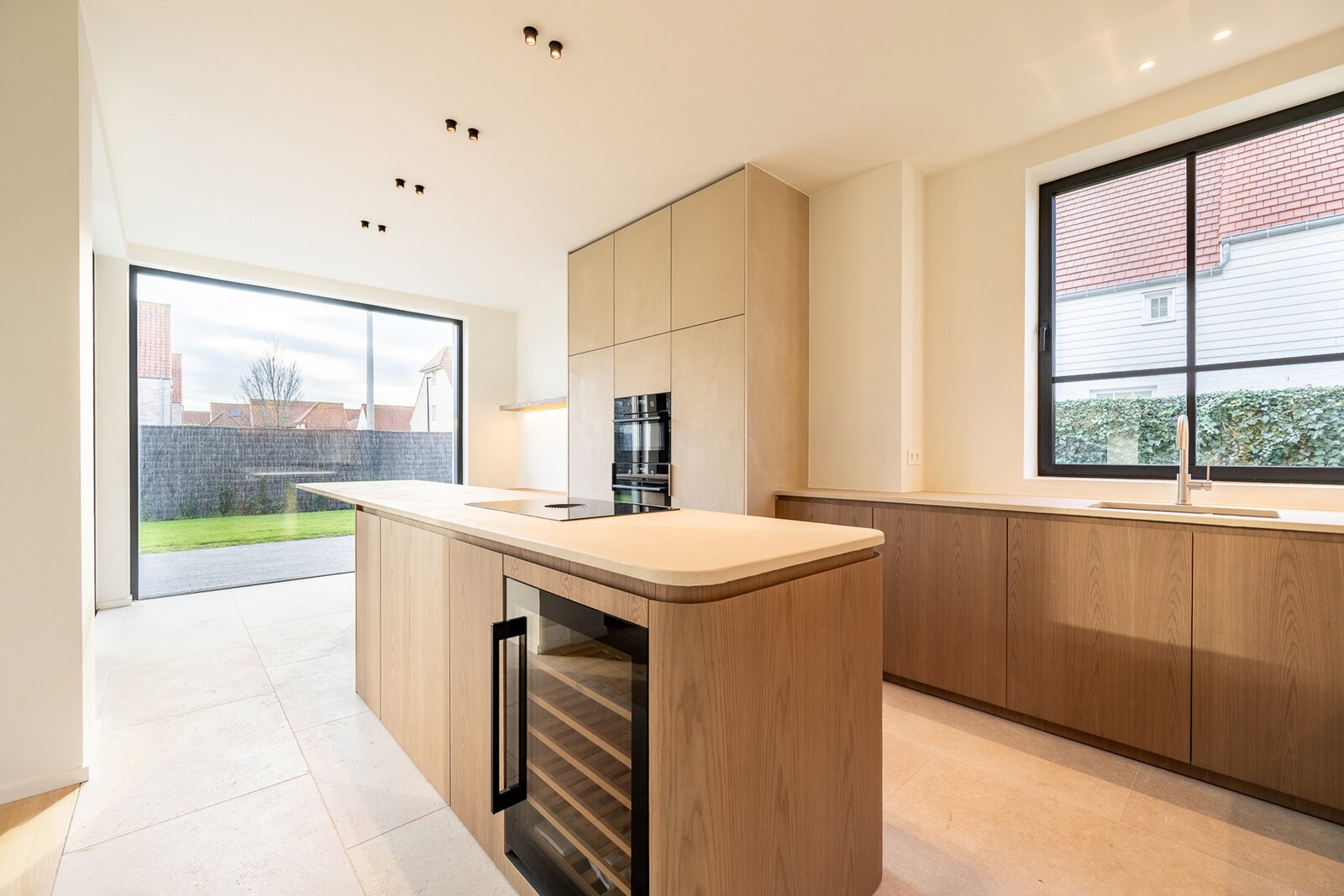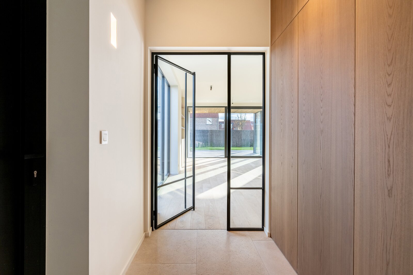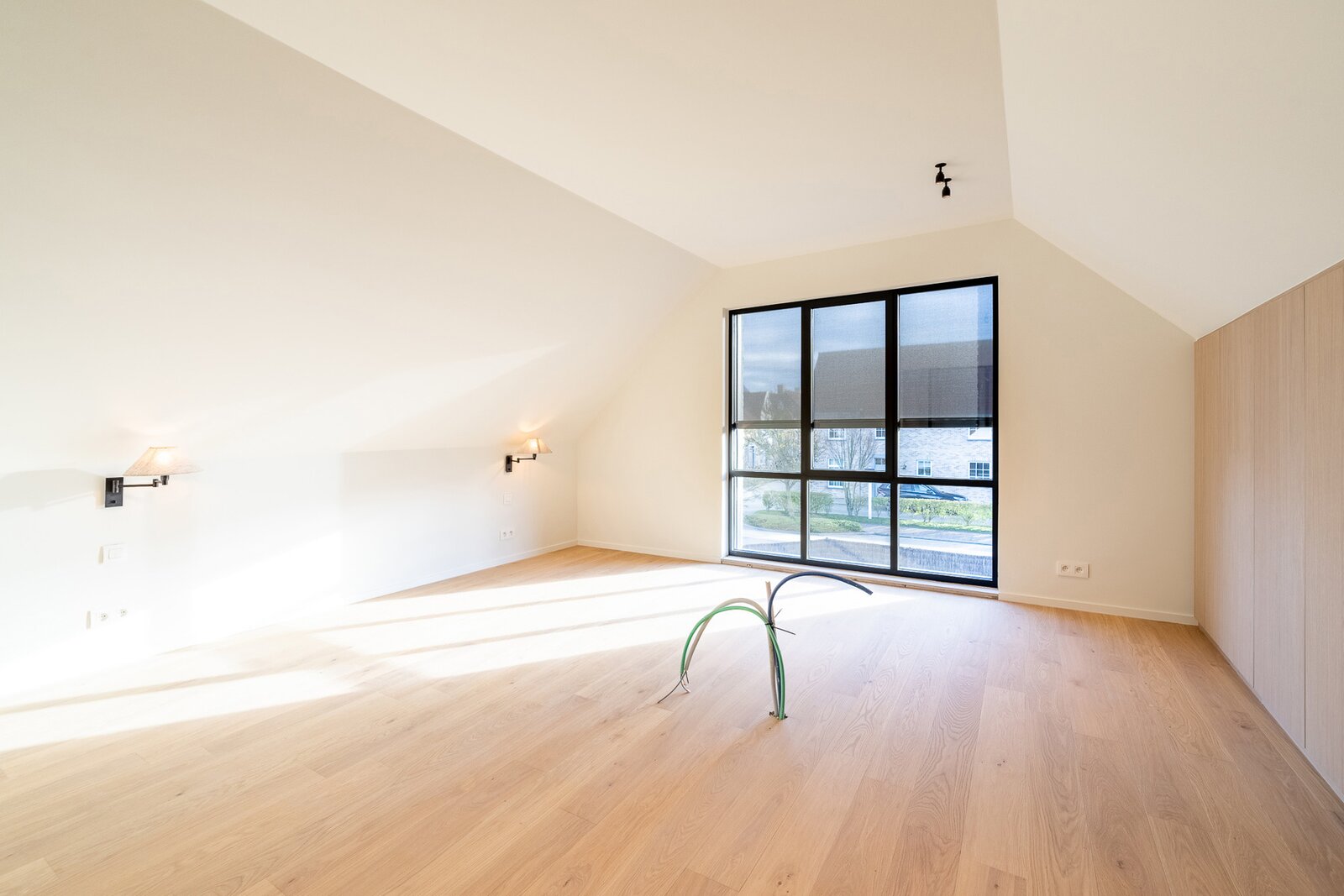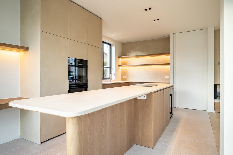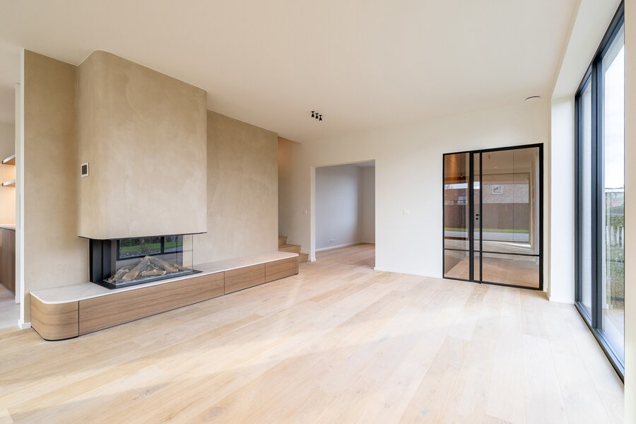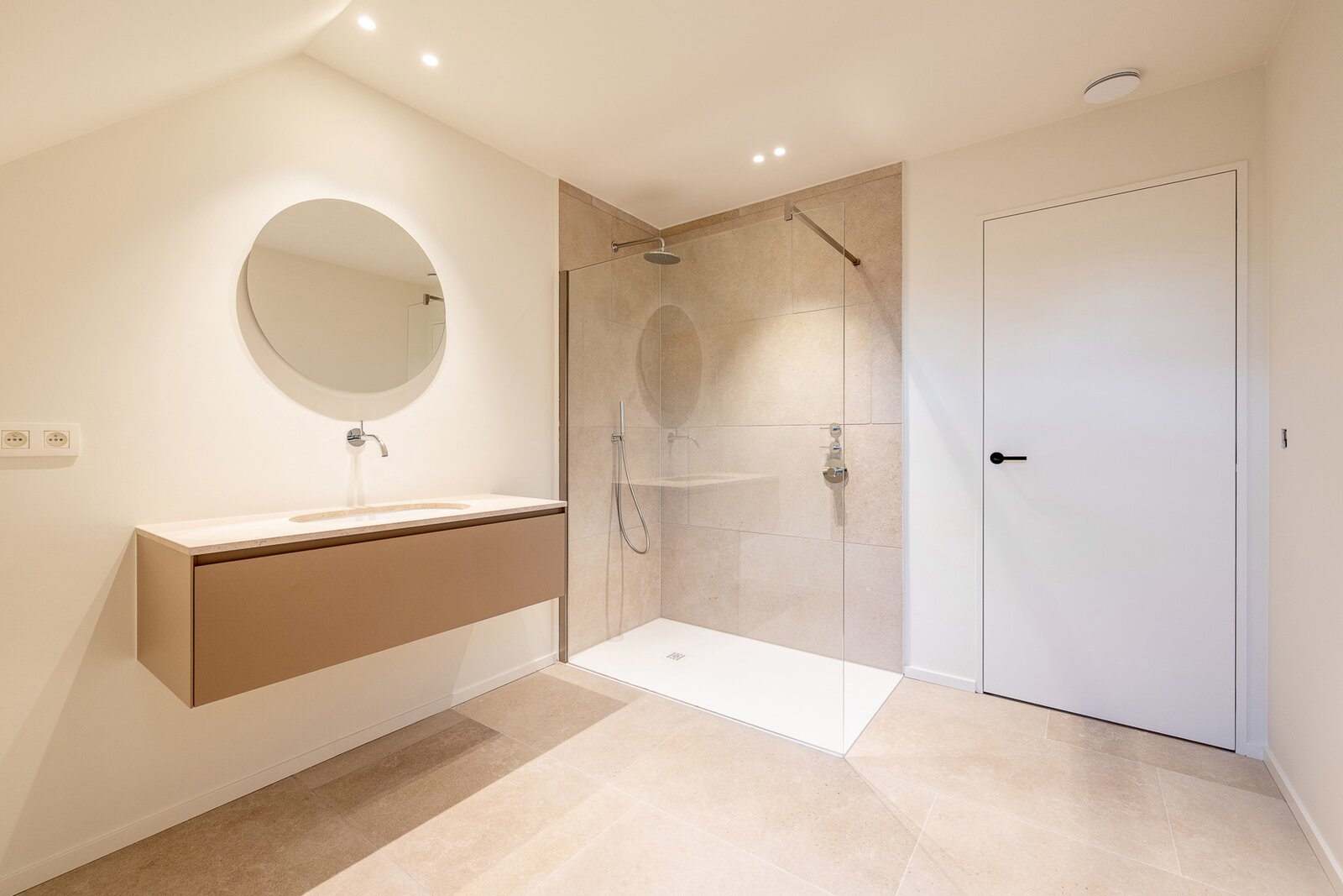 Op het gelijkvloers bevindt zich een stijlvolle inkomhal met gastentoilet en vestiaire, gevolgd door een ruime, lichtrijke woonkamer met gashaard die uitkijkt op het zonnige terras. Aansluitend vindt u een gezellige tv-hoek en een prachtige leefkeuken met praktische bijkeuken. Verder zijn er nog een aparte wasruimte en extra berging aanwezig.