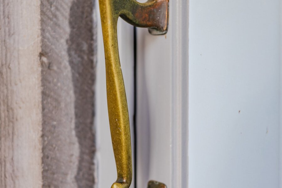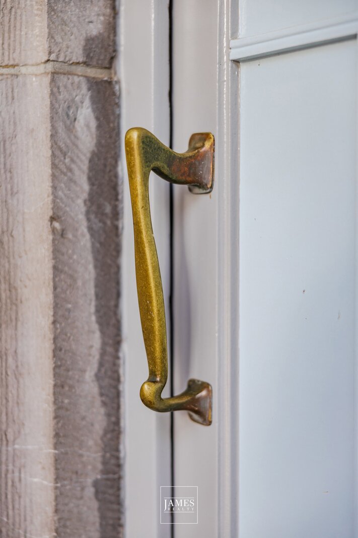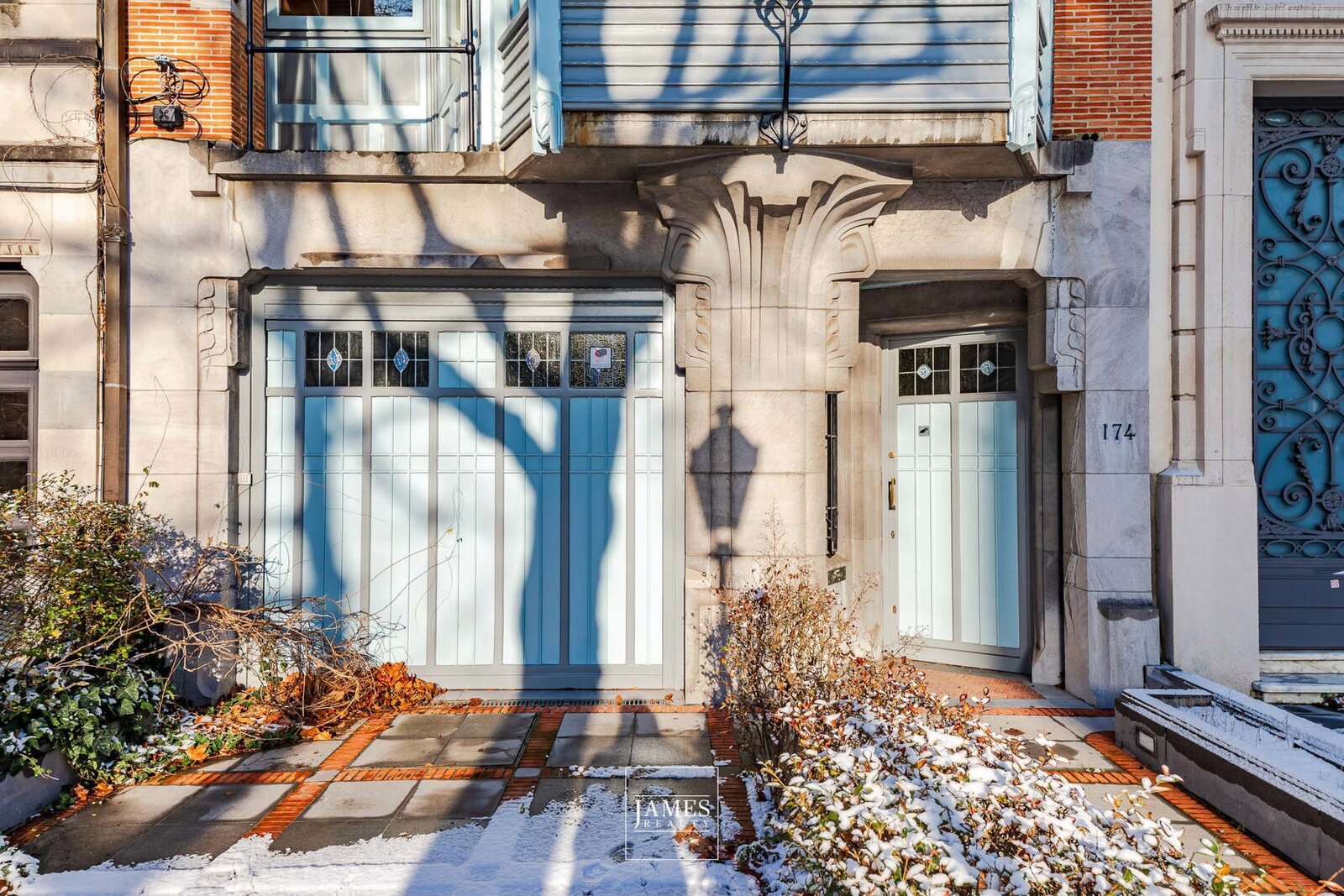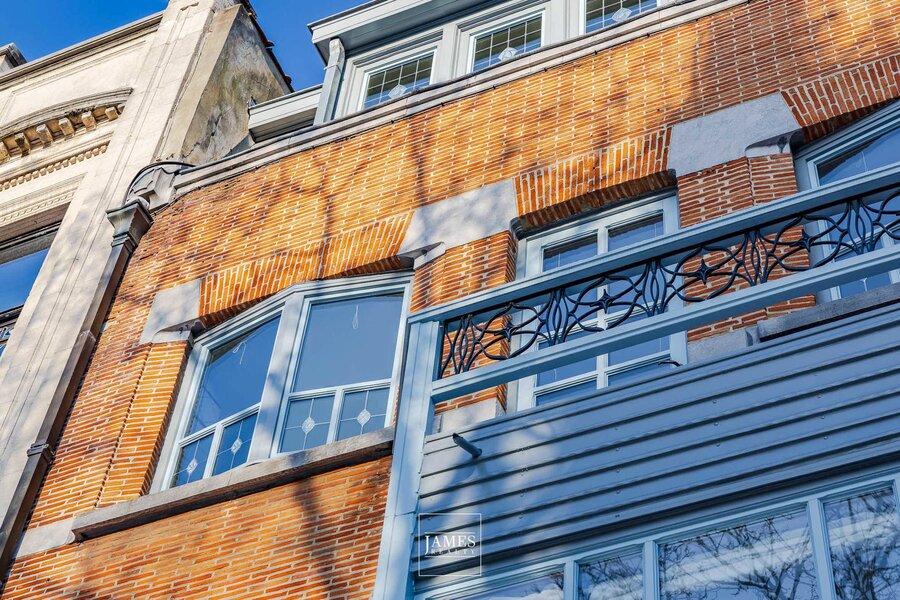 De gevel wordt gekenmerkt door een evenwichtige compositie van rode baksteen en blauwe hardsteen, een hangende erker, grote raampartijen en originele, lichtblauw geschilderde schrijnwerken. Tal van waardevolle elementen uit de bouwperiode zijn bewaard gebleven en vormen een authentieke basis voor een zorgvuldige restauratie met respect voor het oorspronkelijke ontwerp.