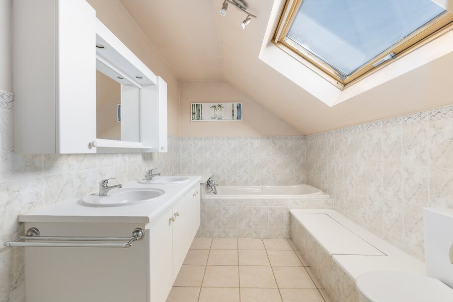 • 2 badkamers: één met douche, één met ligbad, toilet, dubbele wastafel en ingemaakte kasten.