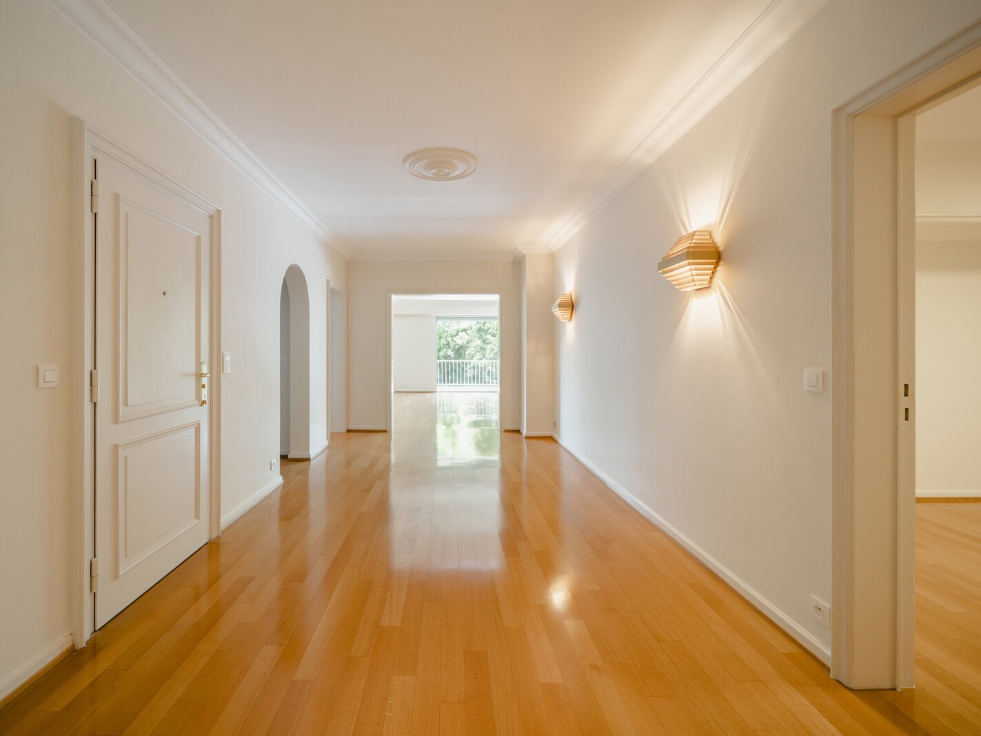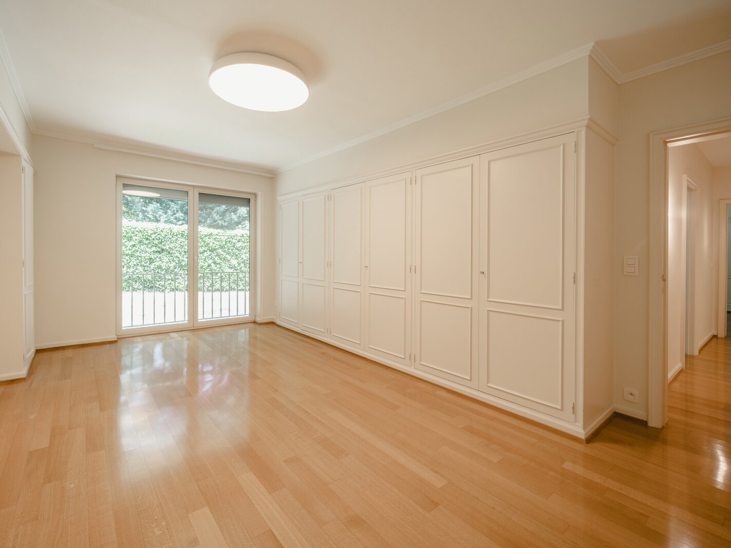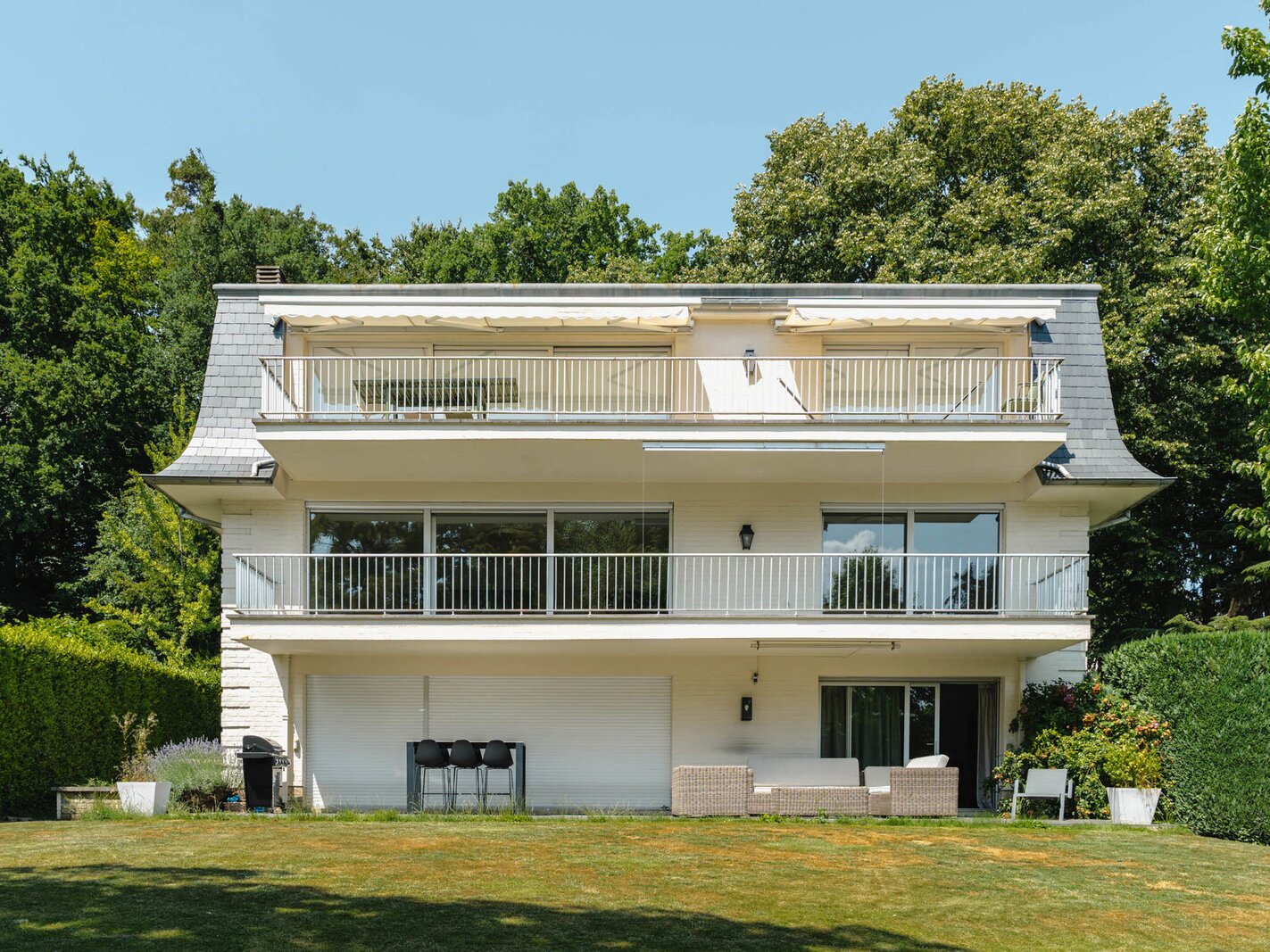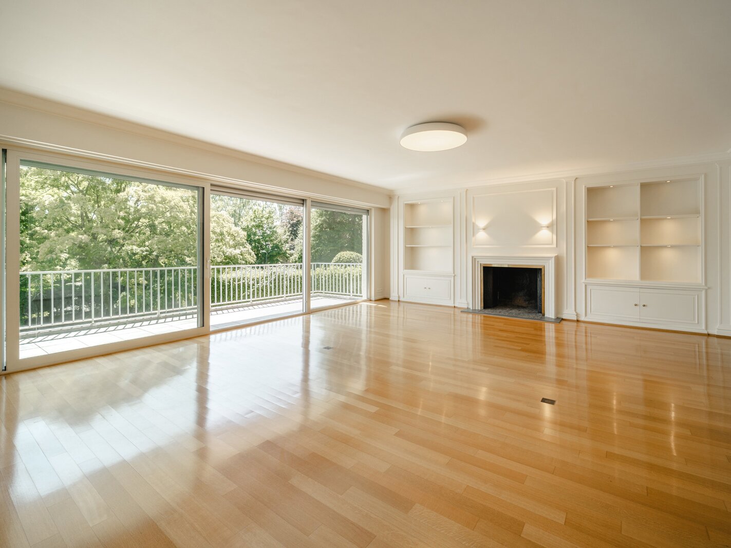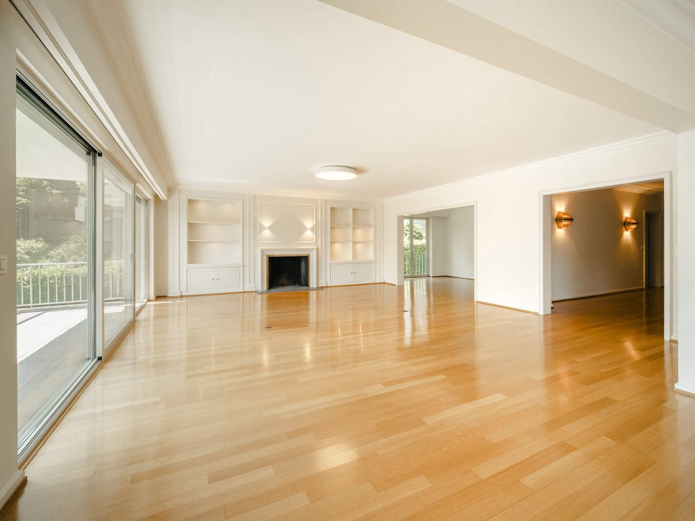 Het appartement, gelegen op de tweede verdieping van een kleinschalig gebouw met drie verdiepingen, heeft hoge plafonds. Het komt uit op een ruime hal die leidt naar de volledig uitgeruste keuken en de ± 77 m² grote woon-/eetkamer, die baadt in het licht dankzij grote erkers die toegang bieden tot het ± 25 m² grote terras op het zuiden met vrij uitzicht op het omliggende groen. De woonkamer is voorzien van een decoratieve open haard en loopt door in een tv-lounge/werkkamer. Een nachthal met een ruime dressing leidt naar de hoofdslaapkamer van circa 25 m² (circa 270 m²) met een eigen badkamer en een extra slaapkamer of kantoor, die verbonden is met de hoofdslaapkamer. Twee extra slaapkamers met dressings en een eigen badkamer maken de woning compleet.
