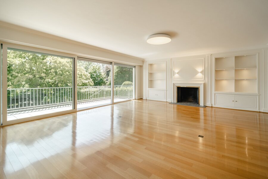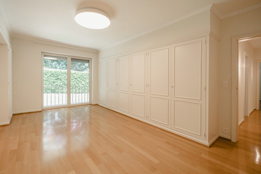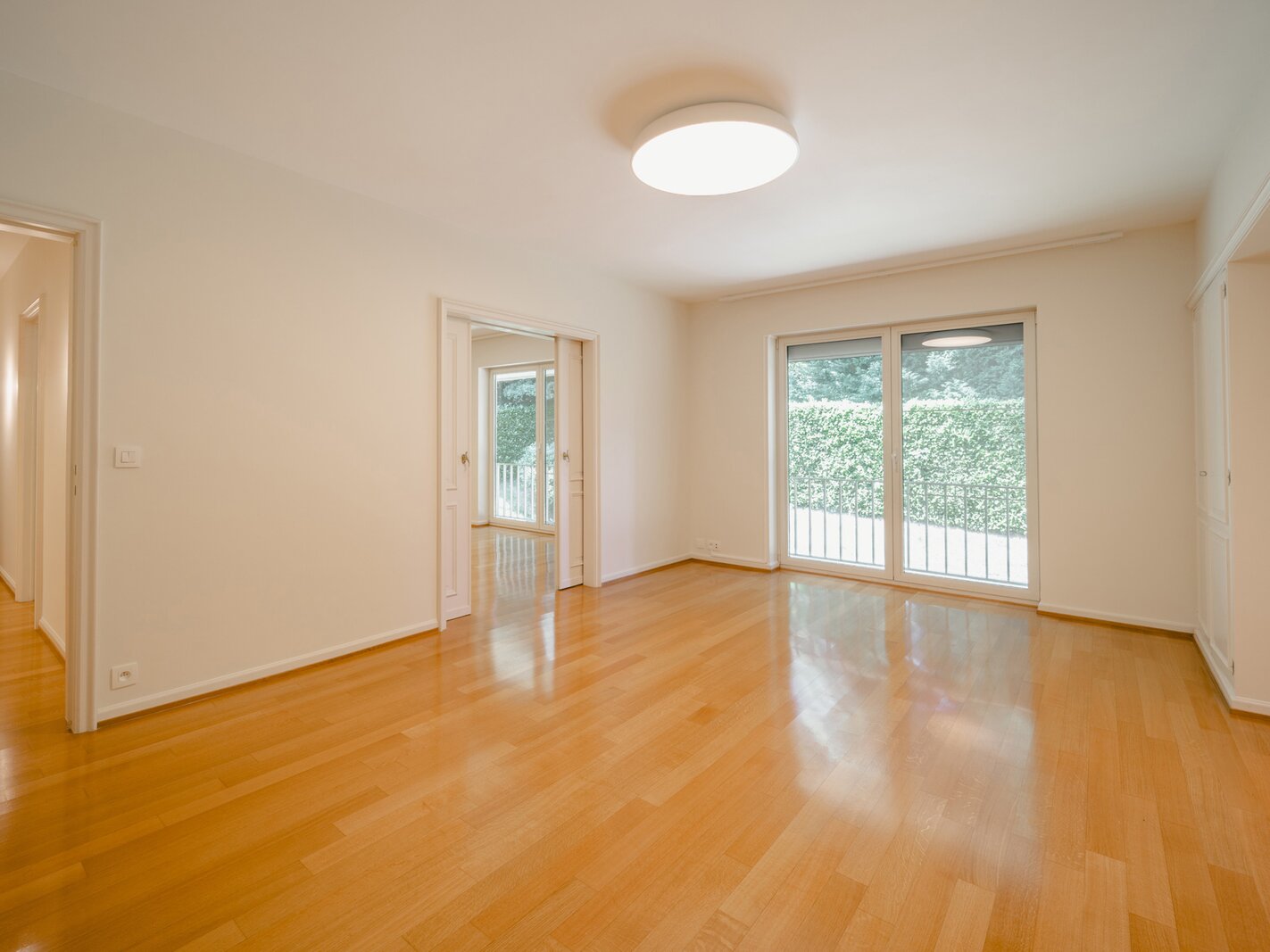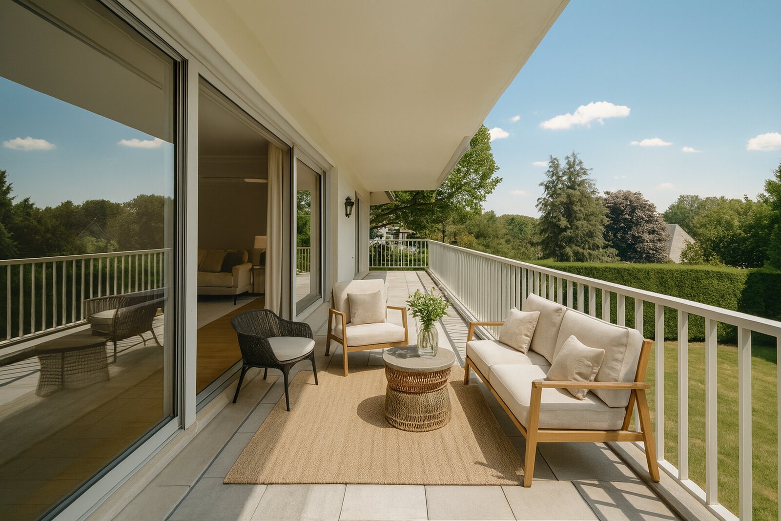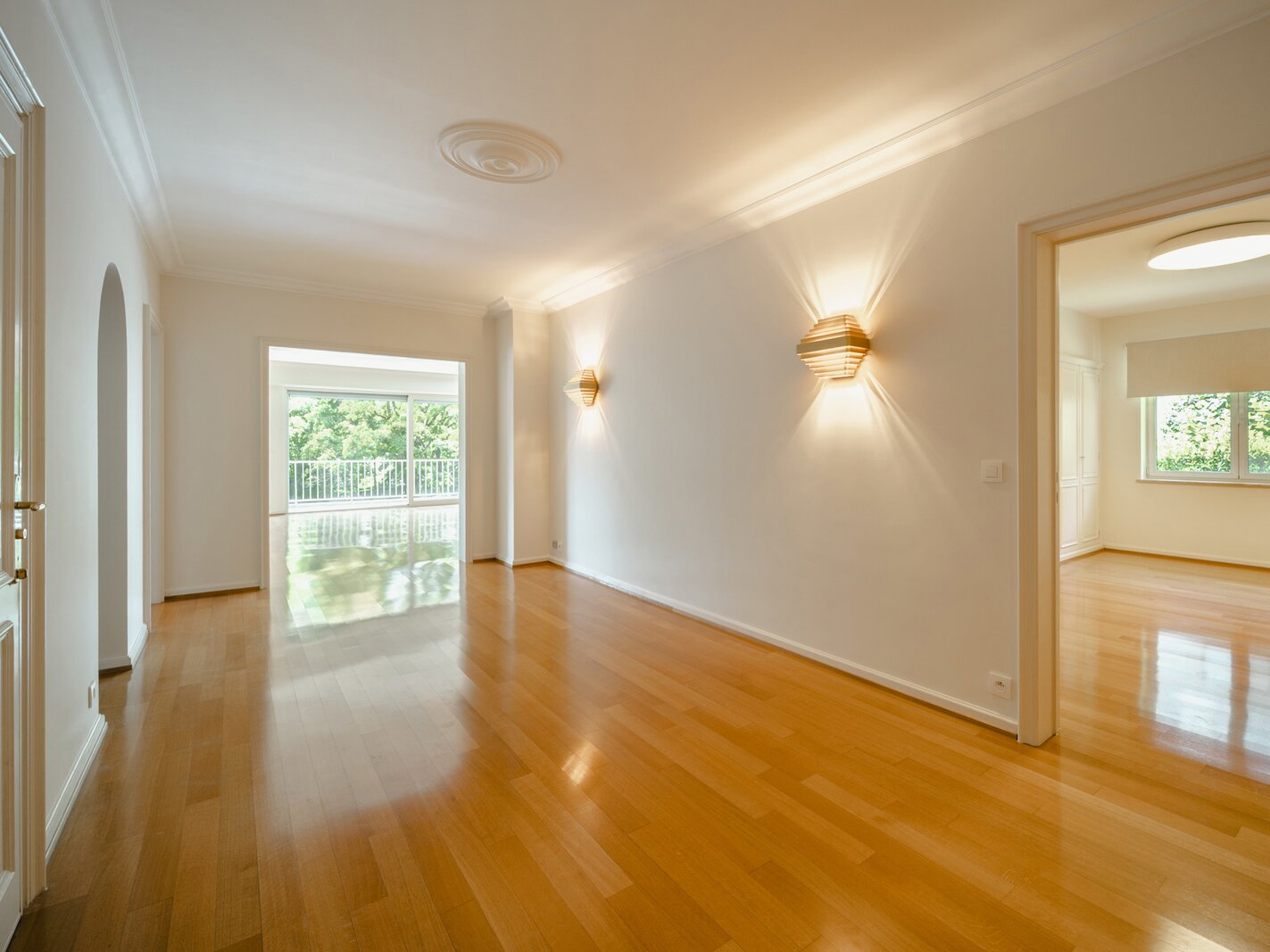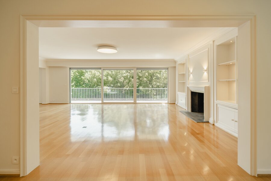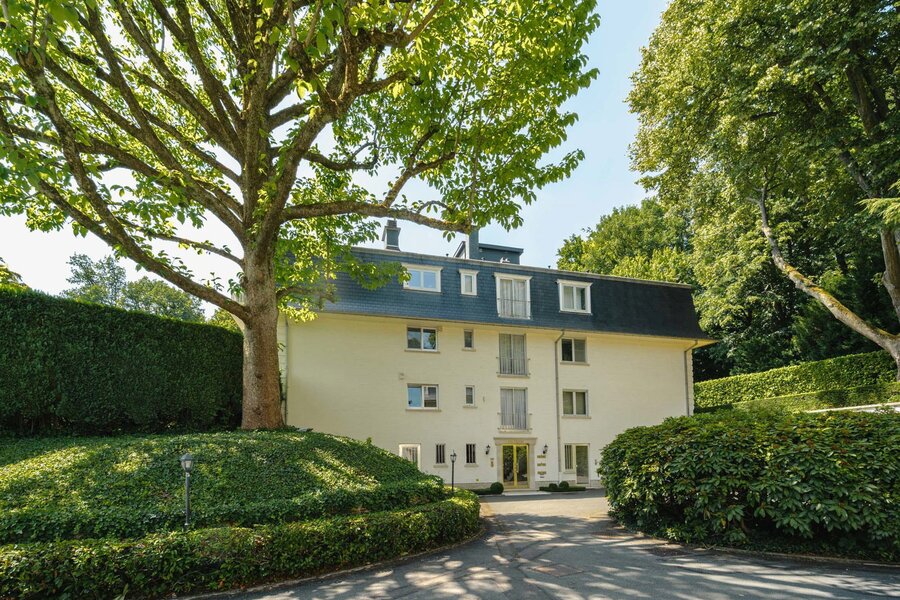 Het appartement, gelegen op de tweede verdieping van een kleinschalig gebouw met drie verdiepingen, heeft hoge plafonds. Het komt uit op een ruime hal die leidt naar de volledig uitgeruste keuken en de ± 77 m² grote woon-/eetkamer, die baadt in het licht dankzij grote erkers die toegang bieden tot het ± 25 m² grote terras op het zuiden met vrij uitzicht op het omliggende groen. De woonkamer is voorzien van een decoratieve open haard en loopt door in een tv-lounge/werkkamer. Een nachthal met een ruime dressing leidt naar de hoofdslaapkamer van circa 25 m² (circa 270 m²) met een eigen badkamer en een extra slaapkamer of kantoor, die verbonden is met de hoofdslaapkamer. Twee extra slaapkamers met dressings en een eigen badkamer maken de woning compleet.