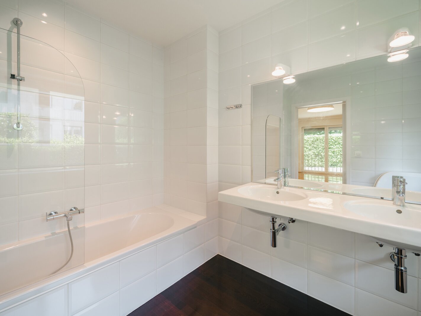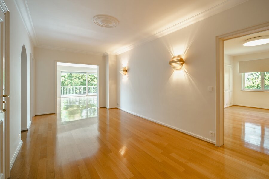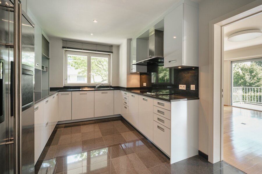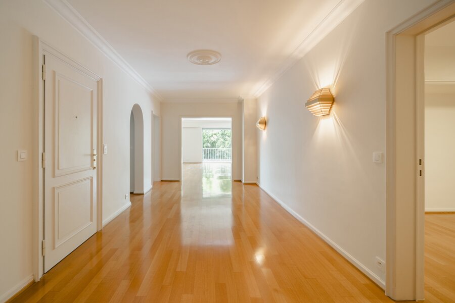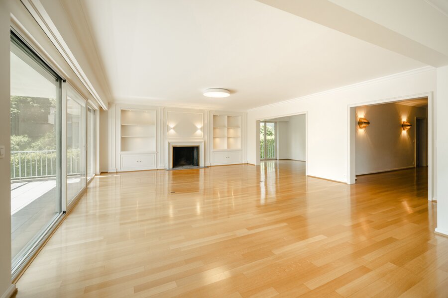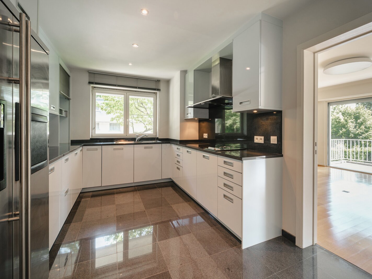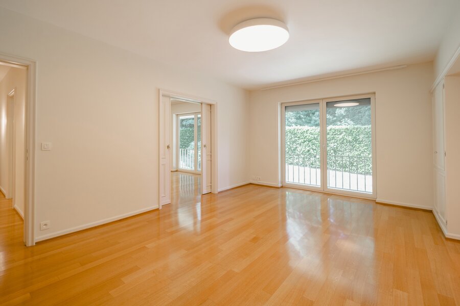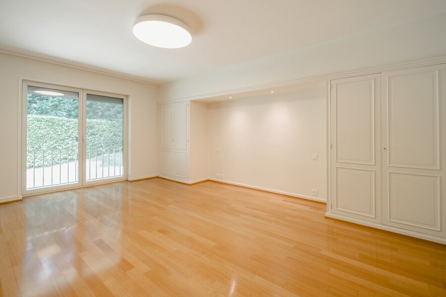Het appartement, gelegen op de tweede verdieping van een kleinschalig gebouw met drie verdiepingen, heeft hoge plafonds. Het komt uit op een ruime hal die leidt naar de volledig uitgeruste keuken en de ± 77 m² grote woon-/eetkamer, die baadt in het licht dankzij grote erkers die toegang bieden tot het ± 25 m² grote terras op het zuiden met vrij uitzicht op het omliggende groen. De woonkamer is voorzien van een decoratieve open haard en loopt door in een tv-lounge/werkkamer. Een nachthal met een ruime dressing leidt naar de hoofdslaapkamer van circa 25 m² (circa 270 m²) met een eigen badkamer en een extra slaapkamer of kantoor, die verbonden is met de hoofdslaapkamer. Twee extra slaapkamers met dressings en een eigen badkamer maken de woning compleet.