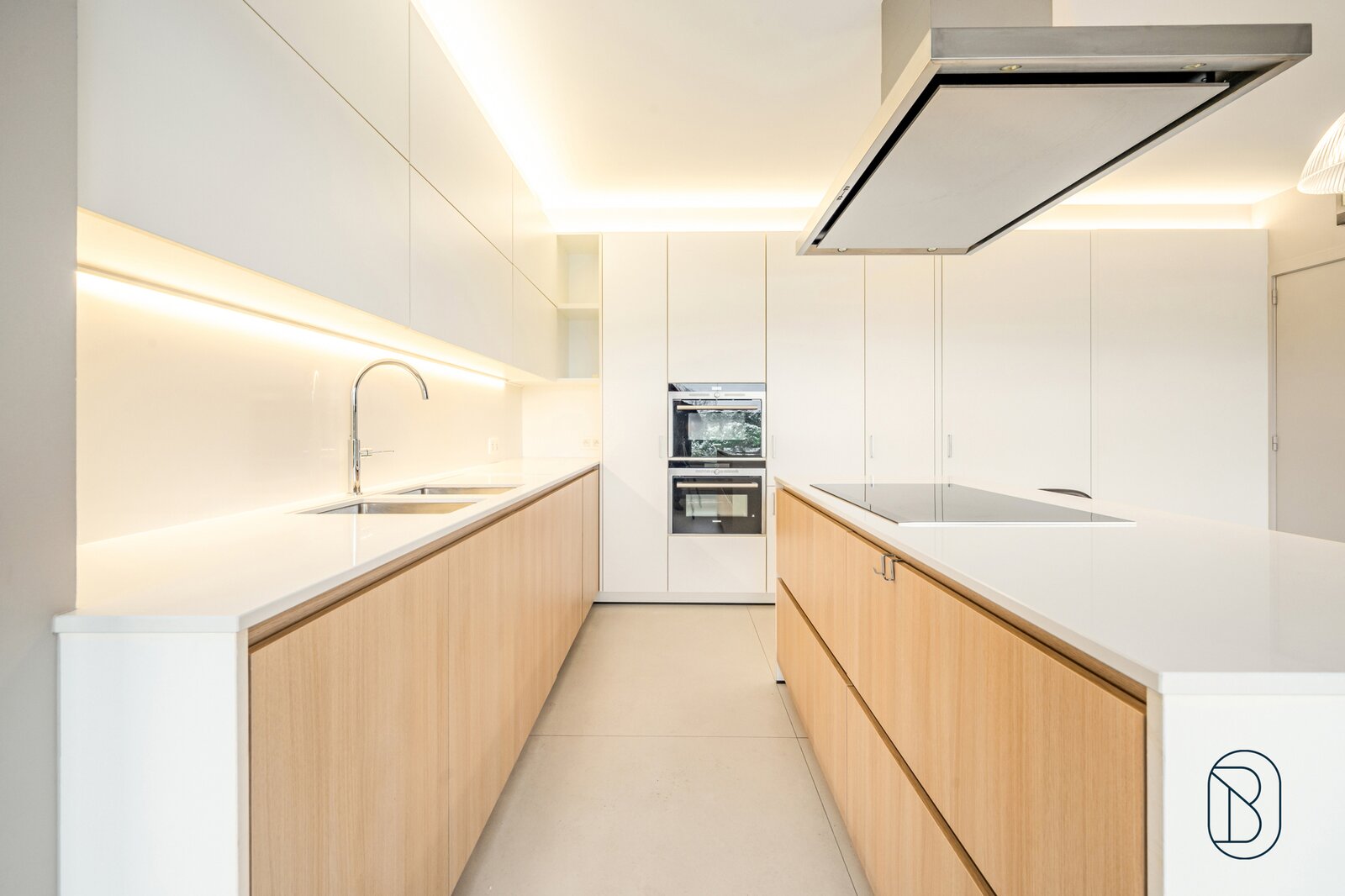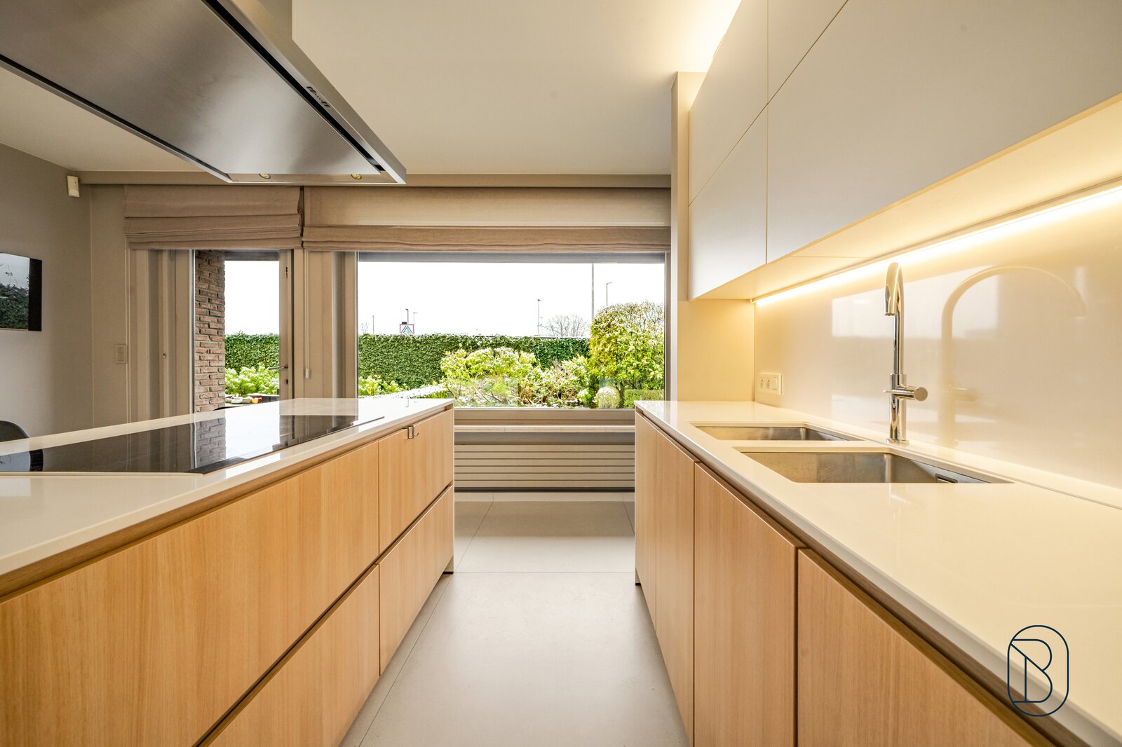 Op het gelijkvloers verwelkomt de inkomhal met gastentoilet je in de ruime, lichtrijke leefruimte met zicht op de tuin. De moderne, volledig geïnstalleerde keuken sluit aan op een praktische bijkeuken/berging en de inpandige garage.