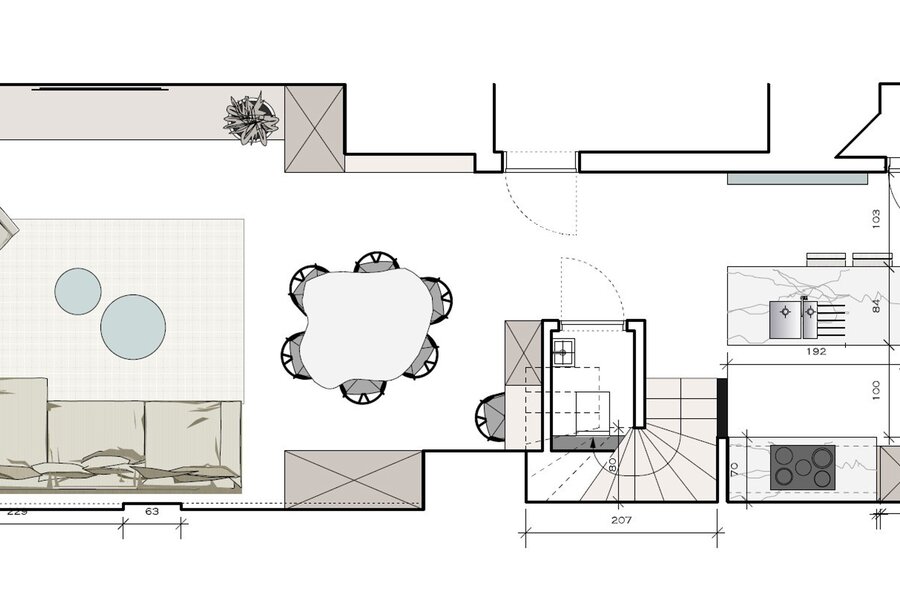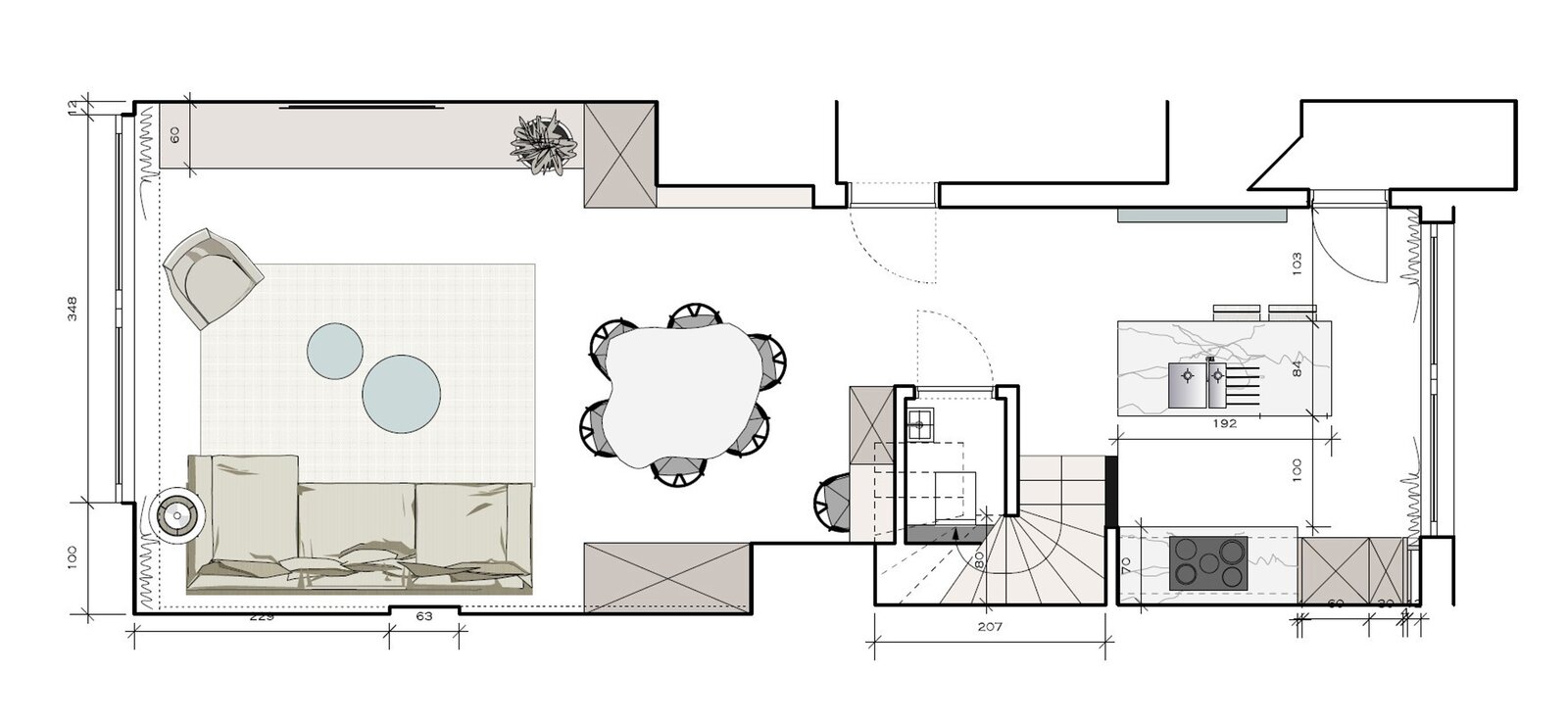 Op het leefniveau is er een prachtige, nieuwe open keuken met fineer eikenhouten kasten en met marmeren keukenblad, voorzien van alle toestellen (vaatwas, koelkast, diepvries, inductie kookplaat). De keuken is gelegen aan een oostgericht terras waar ruimte is voor een eettafel of lounge. Daarnaast is de keuken voorzien van een bergruimte met aansluiting voor wasmachine en opbergplaats.