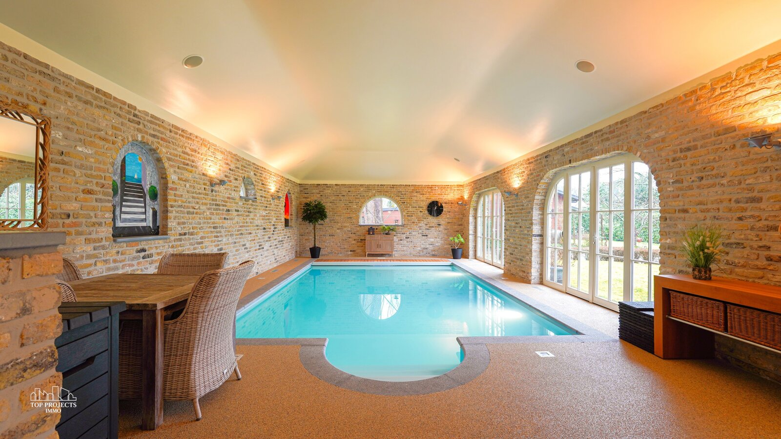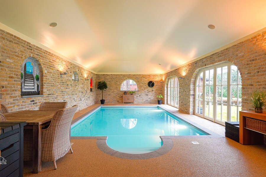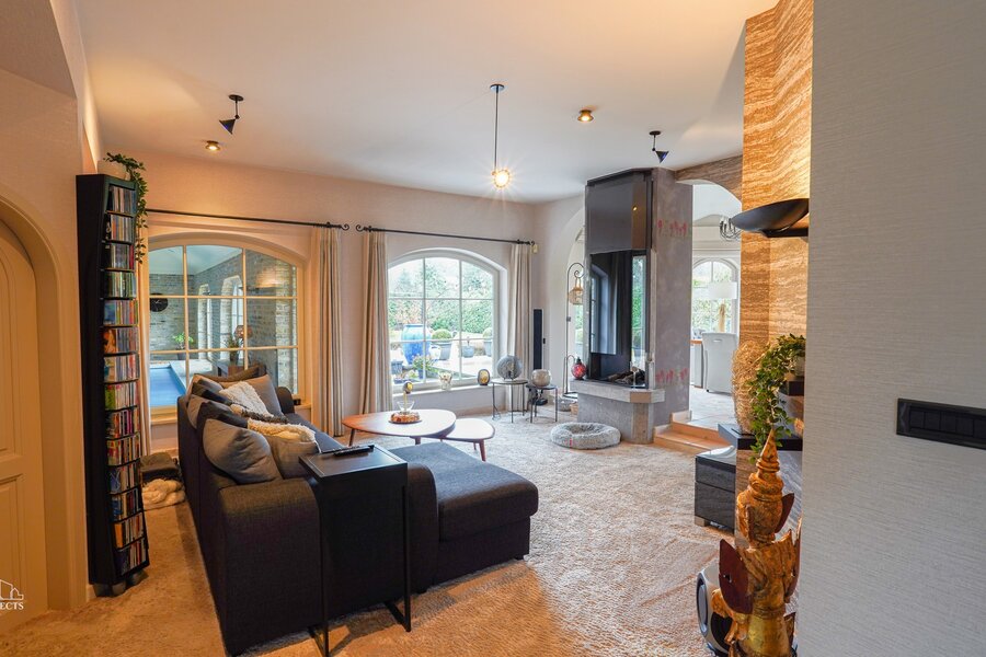 Loopt u door bereiken we het overdekte binnenzwembad volledig afgewerkt met steentapijtvloer en biedt meteen een unieke spa-beleving in eigen huis.
