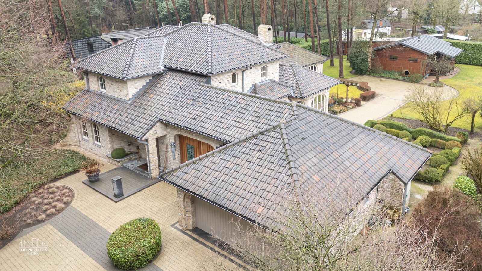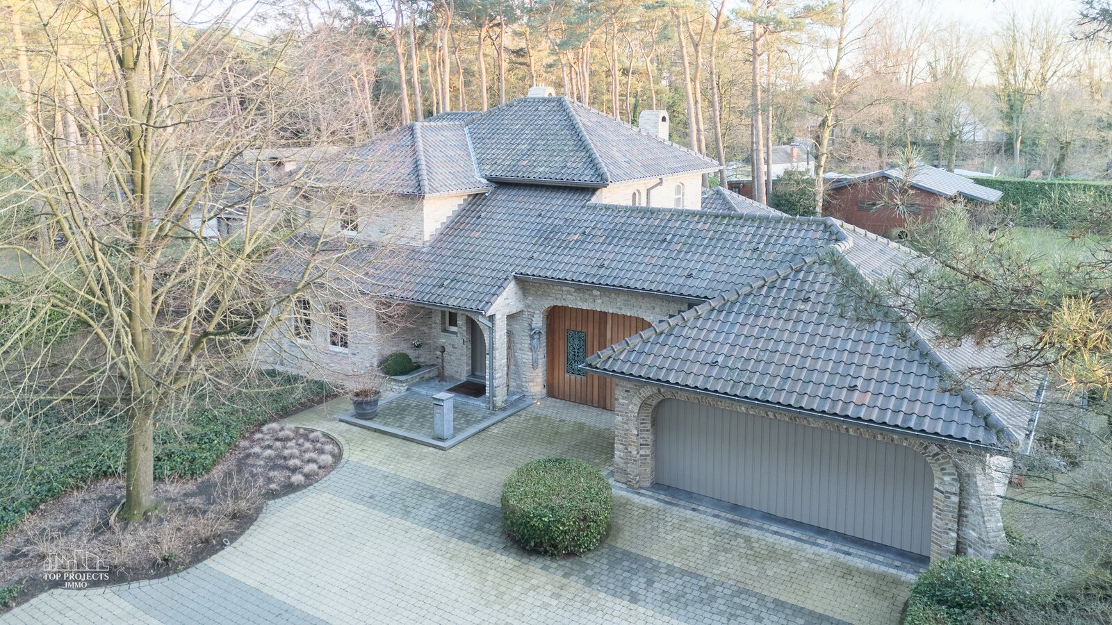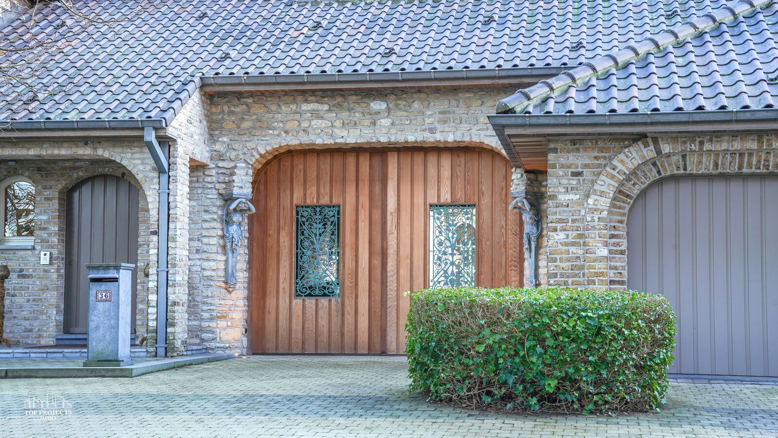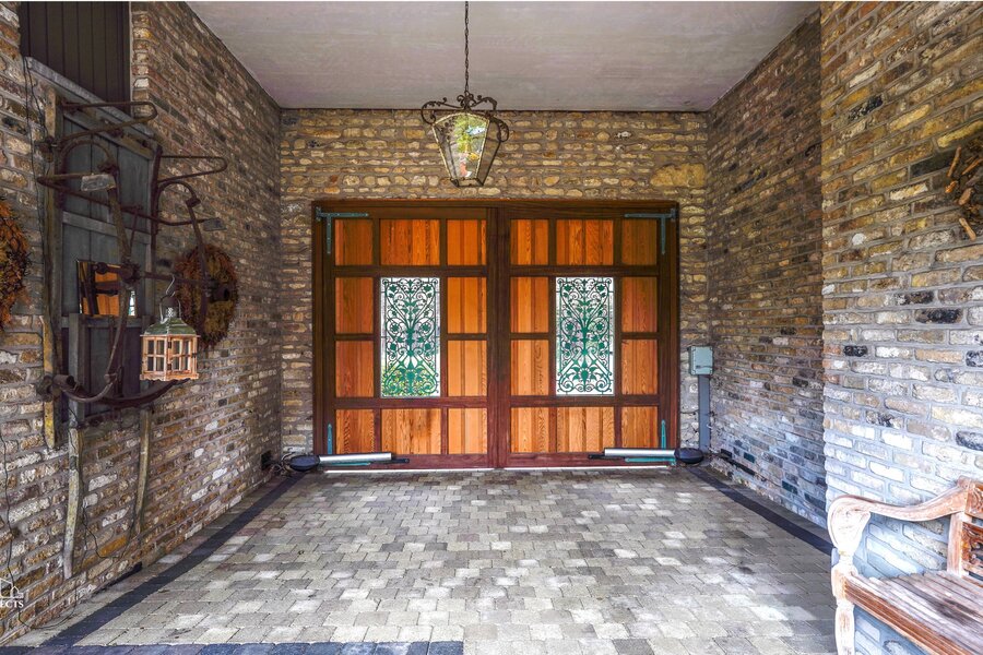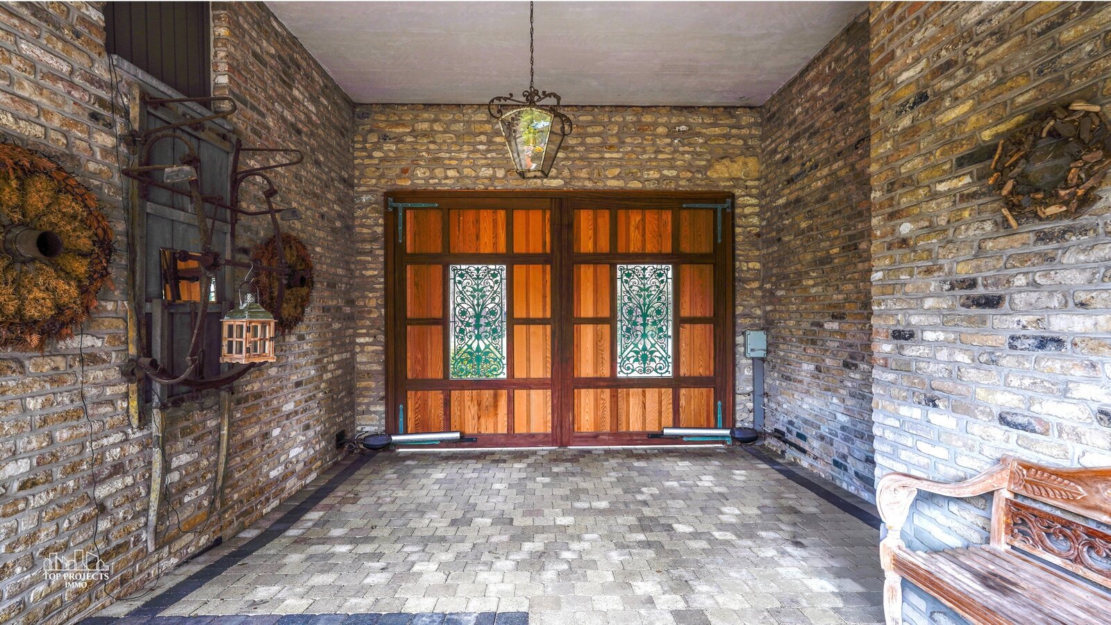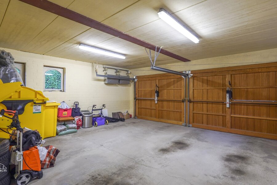 Het perceel is volledig omheind en is toegankelijk via een automatische poort. Vooraan de woning is er parkeergelegenheid voor minstens vier wagens. Daarnaast beschikt de woning over een dubbele garage met automatische poorten en een ruime bijkomende bergruimte. Tevens is de achtertuin eveneens bereikbaar met de wagen.