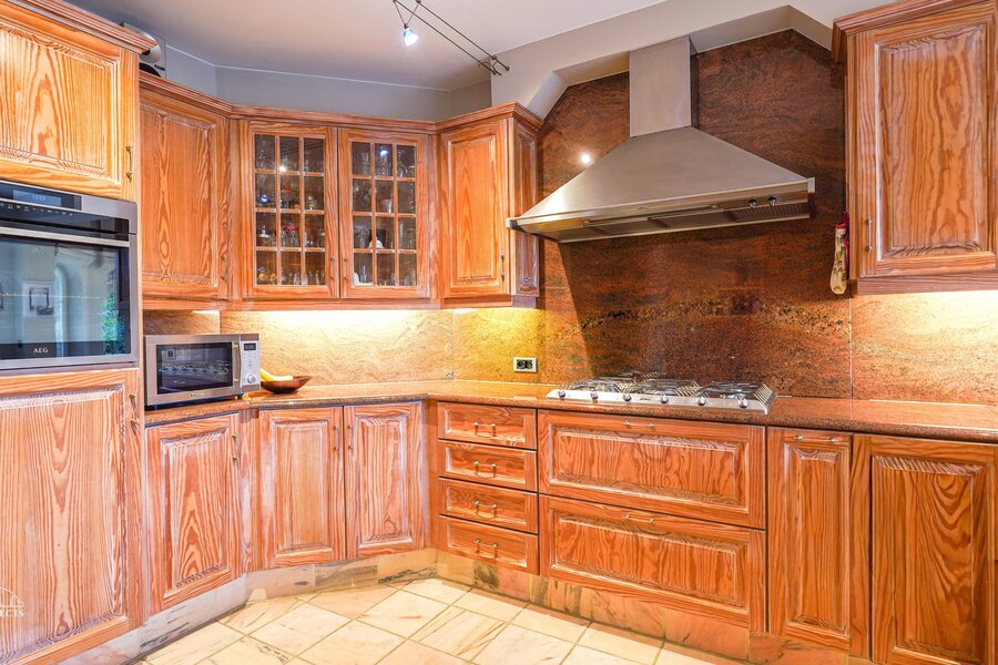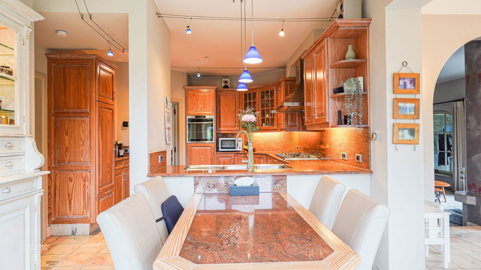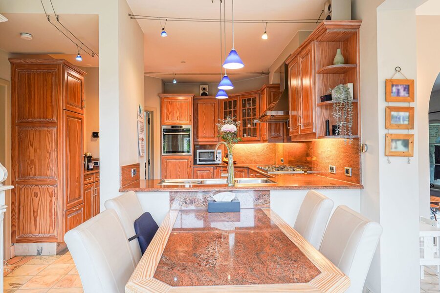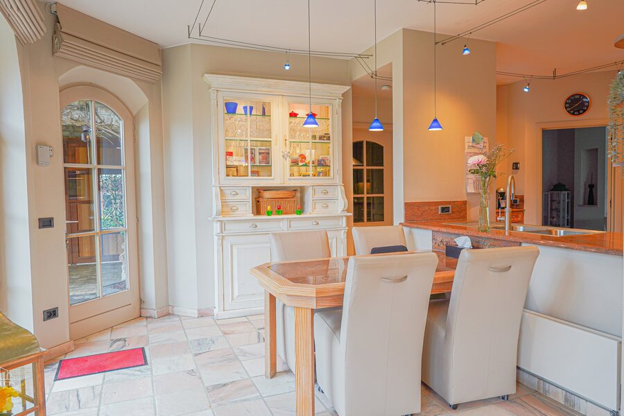 Via de royale inkomhal met afzonderlijk gastentoilet en imposante marmeren trap wordt u verwelkomt in deze prachtige woning. Van hieruit heeft u directe toegang tot de volledig uitgeruste keuken met gezellige ontbijthoek en tot de sfeervolle relaxruimte. De keuken beschikt onder meer over een koelkast, ingebouwde vriezer, oven, gasfornuis, dampkap, vaatwasser, en een dubbele spoelbak met Quooker-kraan. De keuken is volledig afgewerkt in stijlvol marmer en beschikt bovendien over voldoende kastruimte wat geen overbodige luxe is.