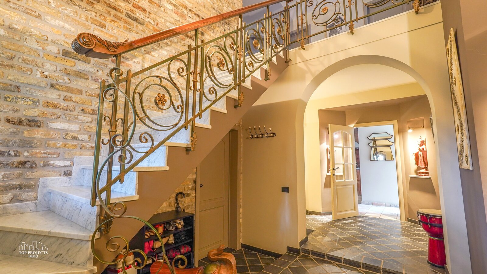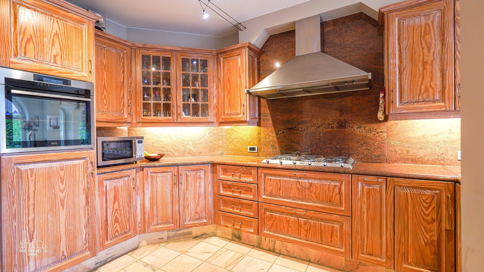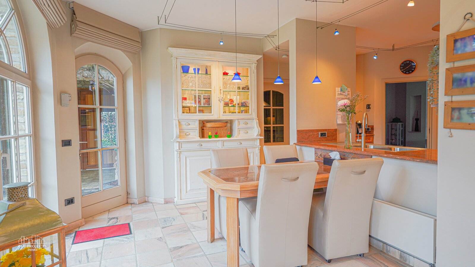Via de royale inkomhal met afzonderlijk gastentoilet en imposante marmeren trap wordt u verwelkomt in deze prachtige woning. Van hieruit heeft u directe toegang tot de volledig uitgeruste keuken met gezellige ontbijthoek en tot de sfeervolle relaxruimte. De keuken beschikt onder meer over een koelkast, ingebouwde vriezer, oven, gasfornuis, dampkap, vaatwasser, en een dubbele spoelbak met Quooker-kraan. De keuken is volledig afgewerkt in stijlvol marmer en beschikt bovendien over voldoende kastruimte wat geen overbodige luxe is.