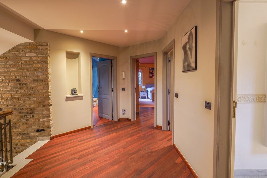 Op de eerste verdieping verbindt een ruime nachthal alle vertrekken. Hier bevinden zich drie volwaardige slaapkamers, waarvan 2 uitgerust met dressing. Verder treffen we de badkamer uitgerust met douche, hoekbad en dubbele wastafel in meubel. Daarnaast is er nog een afzonderlijk toilet aanwezig in de nachthal.