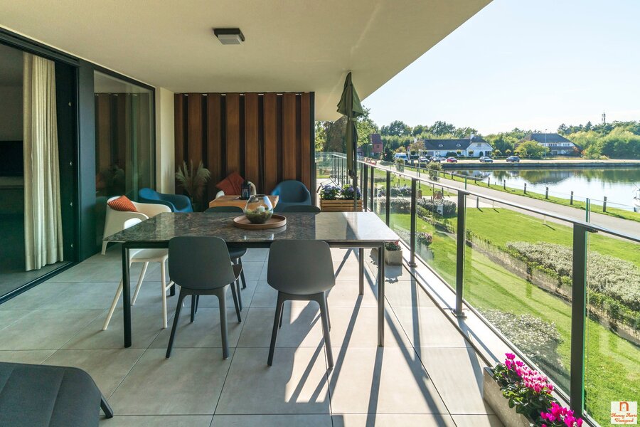 Dit prachtig appartement aan de kanaalkom verbindt modern wonen met de rust en schoonheid van het water. Zodra je de woonkamer binnenkomt, trekken de grote schuiframen van vloer tot plafond meteen de aandacht. Ze brengen het licht royaal naar binnen en leiden je blik naar het ruime, overdekte terras van 30 m². Hier word je elke avond getrakteerd op een adembenemende zonsondergang boven het water, een uitzicht dat blijft verrassen.