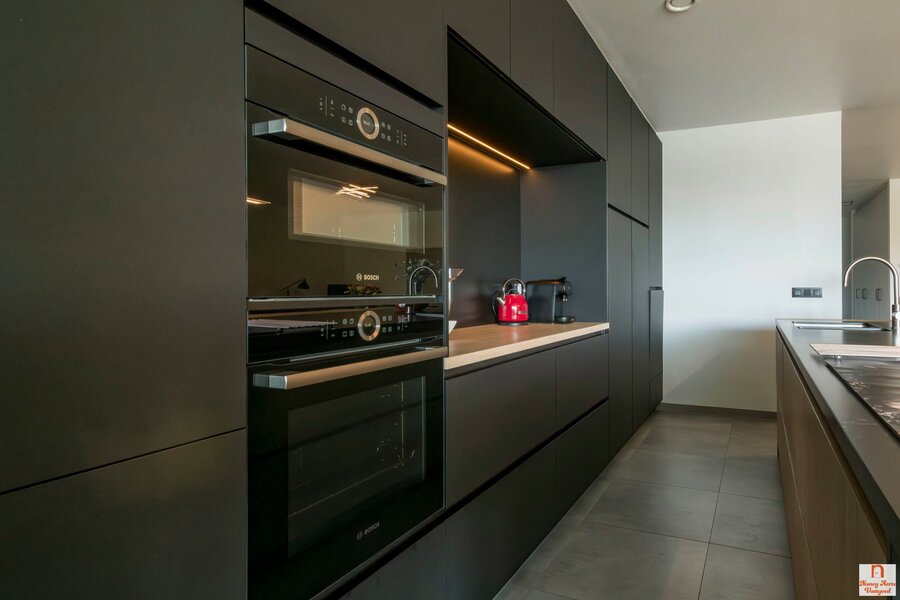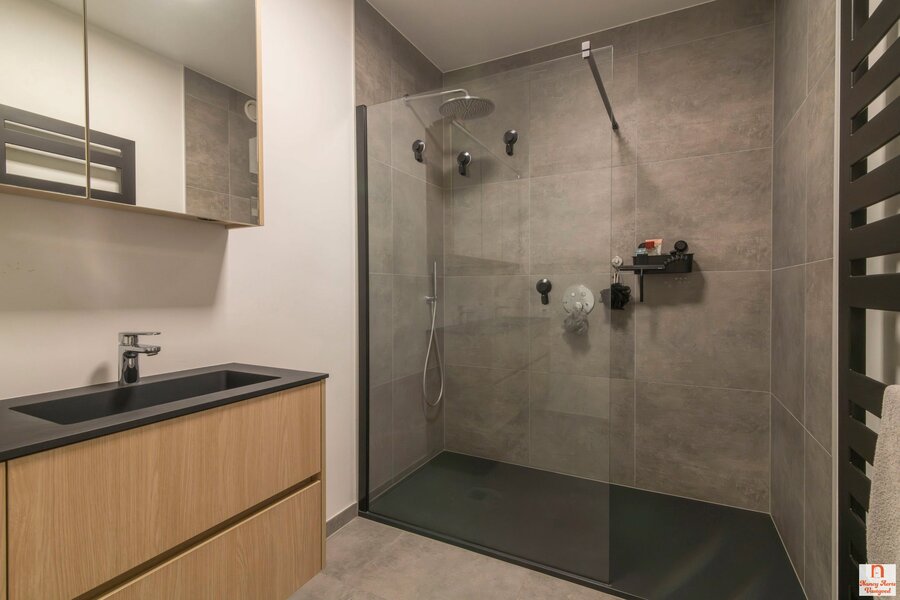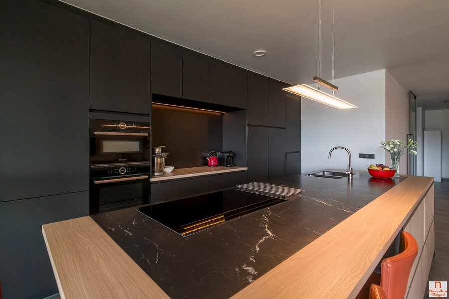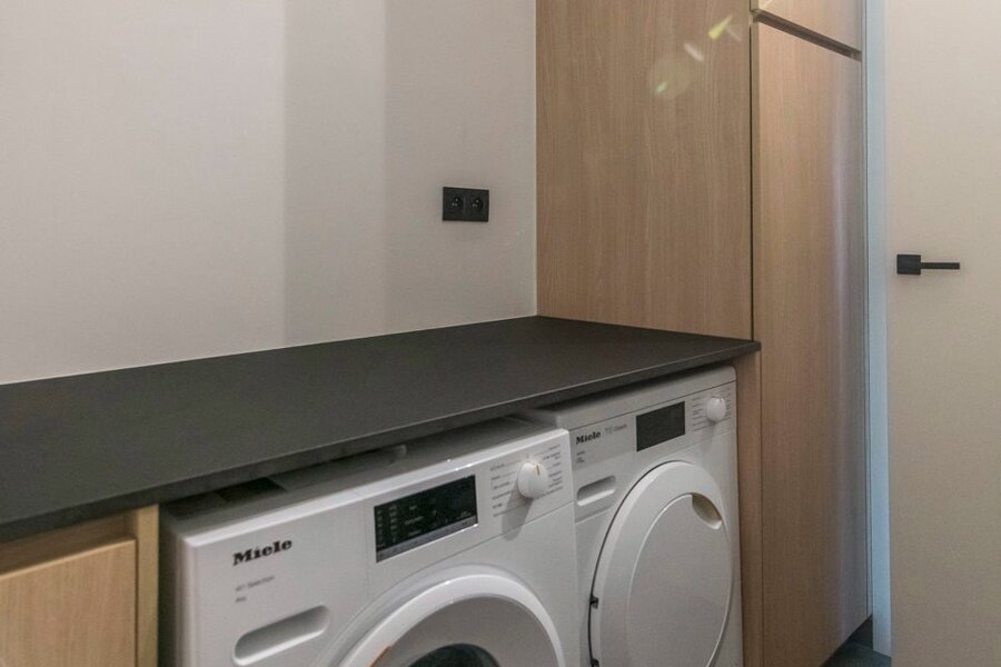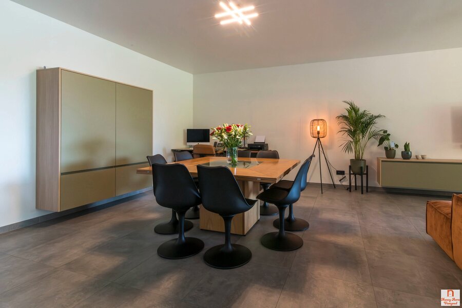 De leefruimte is uitnodigend ruim en laat zich moeiteloos indelen met een gezellige zithoek, een royale eettafel en zelfs een hoek voor een bureau. De keuken vormt een stijlvolle blikvanger, met een strak eiland waarin de kookplaat met geïntegreerd afzuigsysteem en de spoelbak zijn verwerkt. Aan het uiteinde nodigt een ontbijtbar uit voor een kop koffie in de ochtend of een glas wijn in de avond. De inkomhal wordt met een elegante zwart stalen deur van de woonkamer gescheiden, wat meteen een moderne toets geeft.