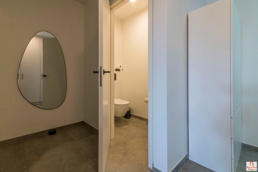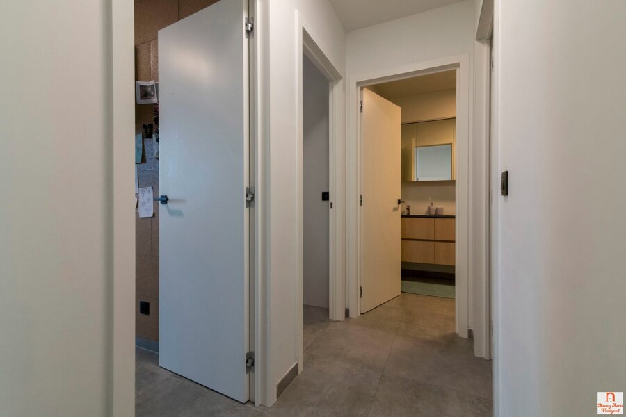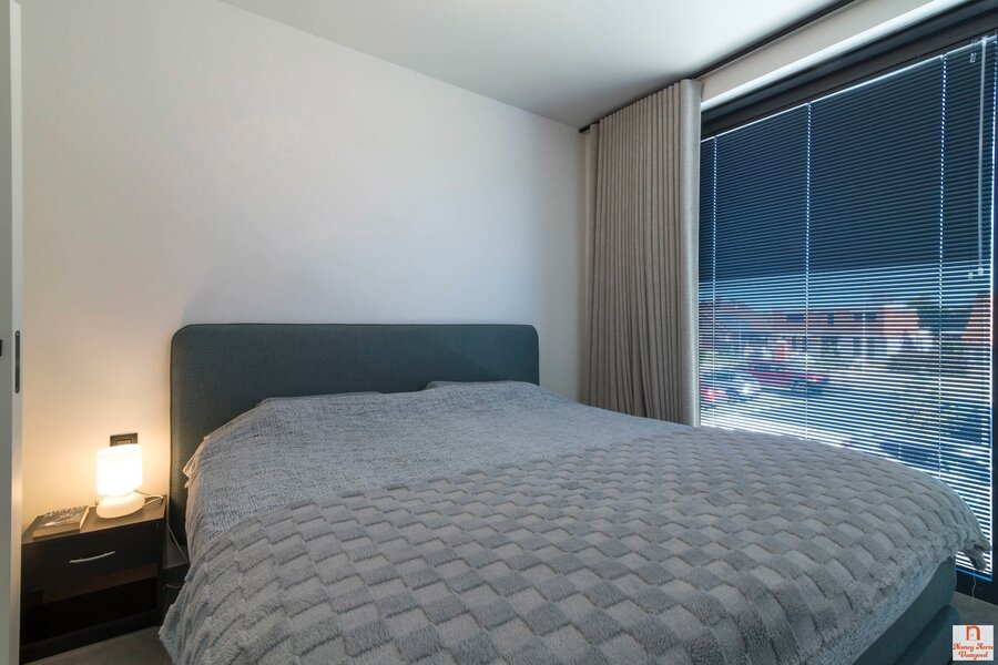 Het appartement beschikt over twee slaapkamers, waarvan één met ingebouwde kasten. De slaapkamers zijn rustig aan de oostzijde gelegen, terwijl de leefruimte uitkijkt naar het westen. De badkamer straalt verfijning uit met een grote inloopdouche en een dubbel lavabomeubel met handige opbergruimte. Daarnaast is er een aparte wasruimte met aansluitingen voor wasmachine en droogkast, een spoelbak en ingebouwde kasten. Ook de inkomhal biedt praktische ingemaakte kasten en een apart toilet.