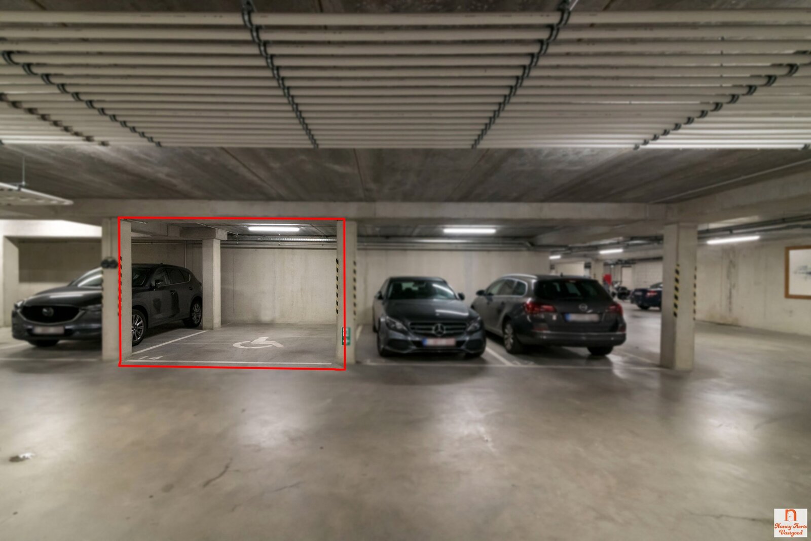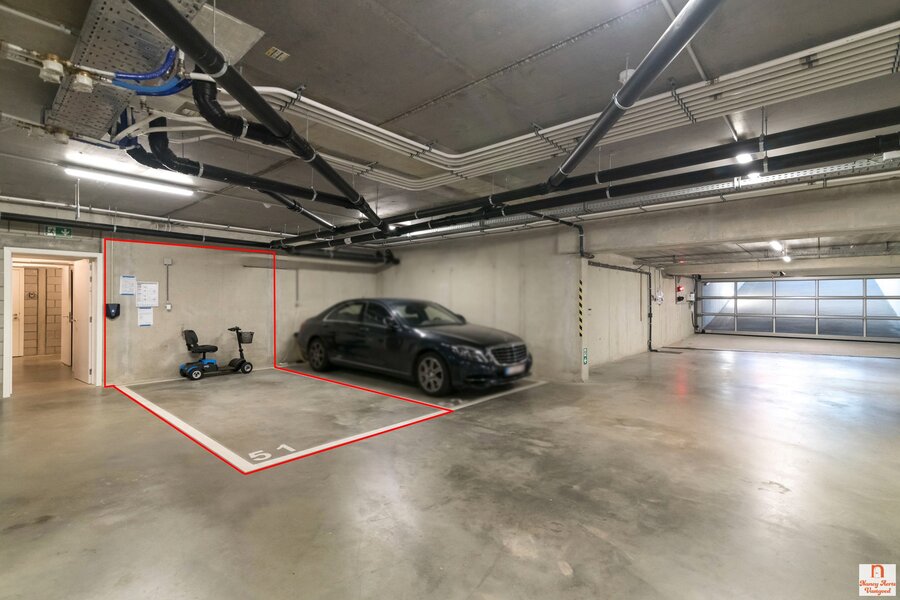 Een van de grote troeven bevindt zich ondergronds: twee privé autostaanplaatsen in de garage, waarvan één uitgerust is met een laadpunt voor de elektrische wagen. Beide zijn gunstig gelegen en daardoor eenvoudig om te parkeren. Daarnaast beschikt het appartement nog over een private kelderberging en kan je je fiets kwijt in de gemeenschappelijke fietsenstalling.