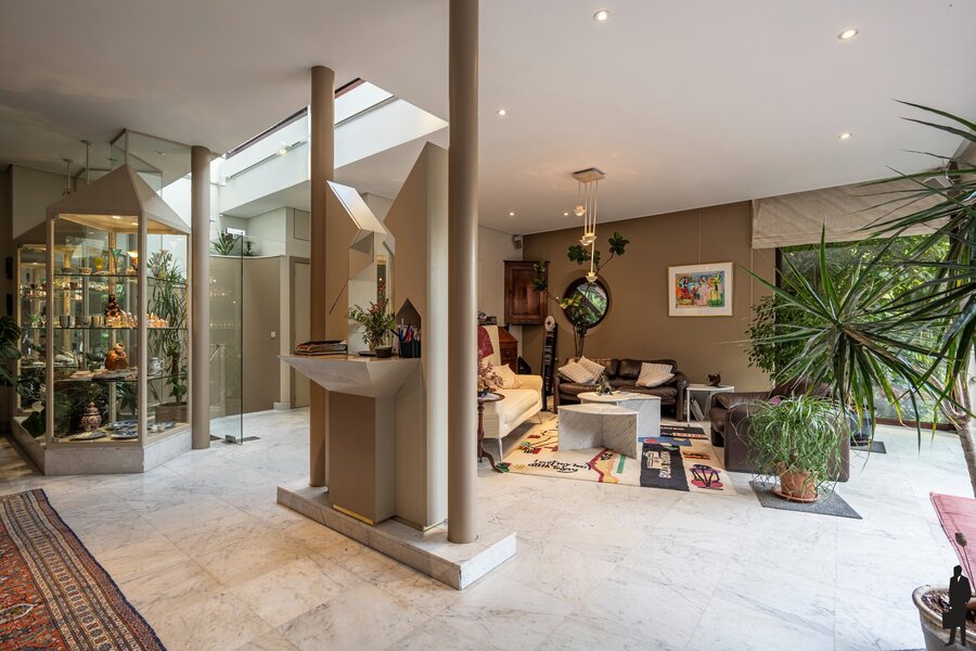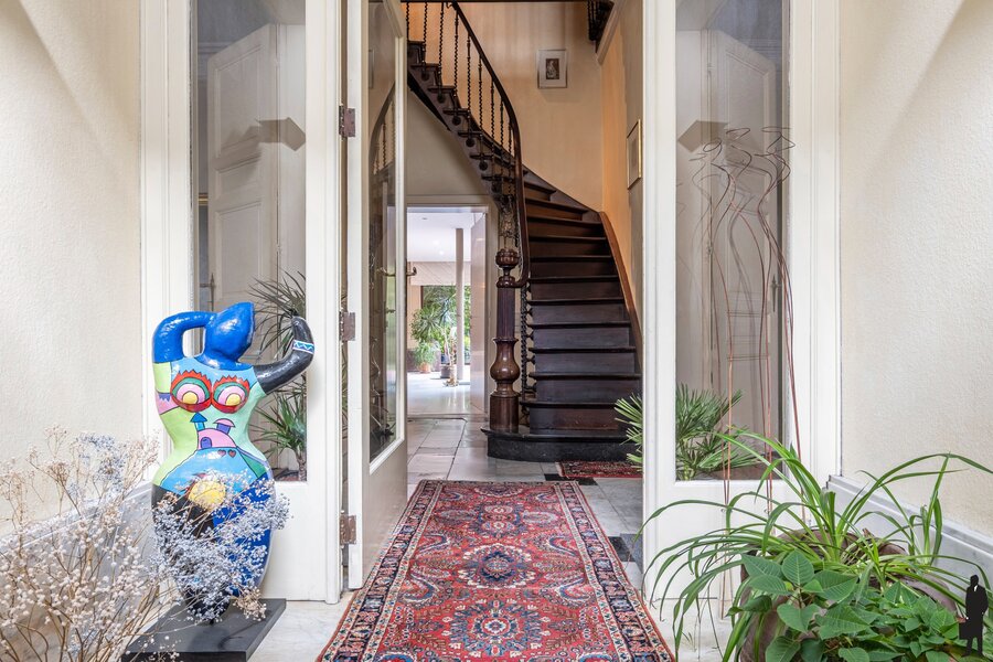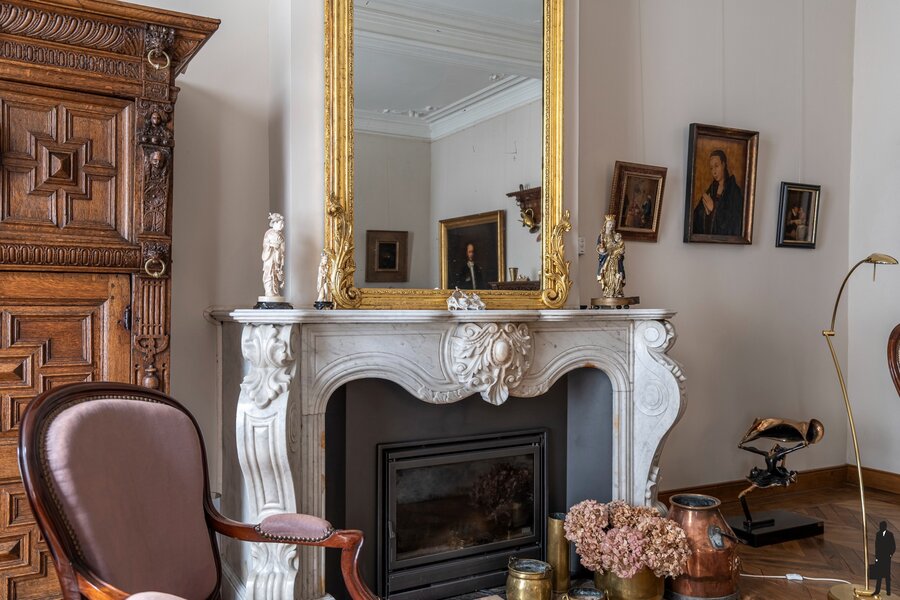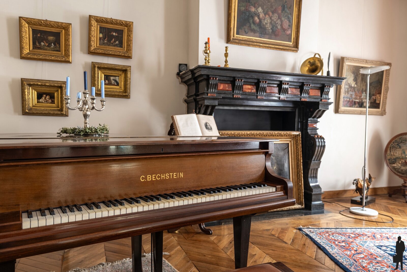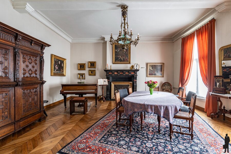 Gelijkvloerse verdieping: U wordt verwelkomd in een statige inkomhal met marmeren tegelvloer in dambordpatroon en een elegante houten Engelse trap. Zowel aan de linker- als aan de rechterzijde geeft de hal toegang tot een salon: vandaag ingericht als zithoek en muziekkamer, maar evengoed geschikt als ontvangst- of bureauruimtes.