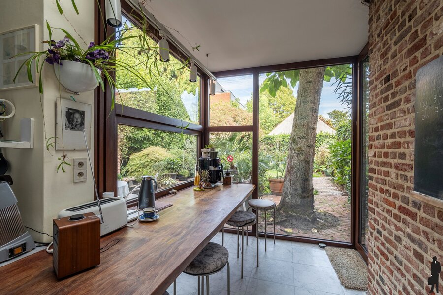 Achteraan bevindt zich een later aangebouwd gedeelte met een riante woonruimte die dankzij een groot schuifraam een prachtig zicht biedt op de tuin. Dit schuifraam kan volledig geopend worden, waardoor binnen en buiten naadloos in elkaar overvloeien. De aangrenzende eetkeuken is uitgerust met alle nodige toestellen en ruime opbergmogelijkheden. De keuken is bovendien voorzien van vloerverwarming.