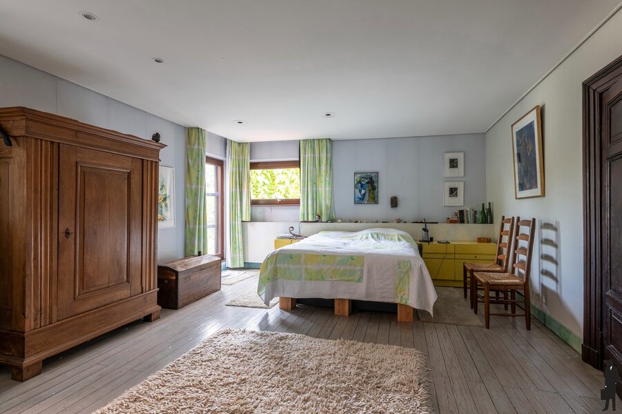Eerste verdieping: Op de verdieping bevinden zich 6 slaapkamers. De masterbedroom beschikt over een eigen volledig ingerichte badkamer met douche, toilet, ligbad, dubbele wastafel en aansluitingen voor wasapparatuur. Vanuit deze kamer heeft u toegang tot een royaal terras van maar liefst 40 m². Daarnaast zijn er nog 5 bijkomende slaapkamers, waarvan vier met eigen wastafel, bureel en ingemaakte kasten. Tot slot is er nog een tweede badkamer met douche, wastafel en toilet.