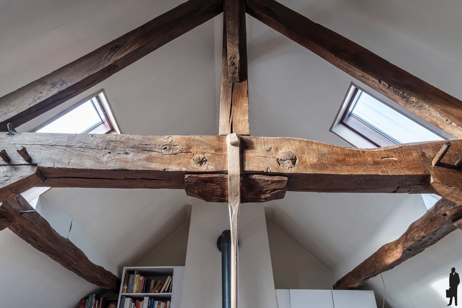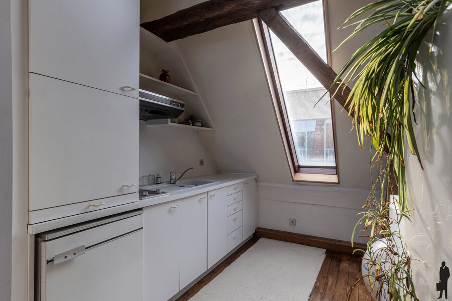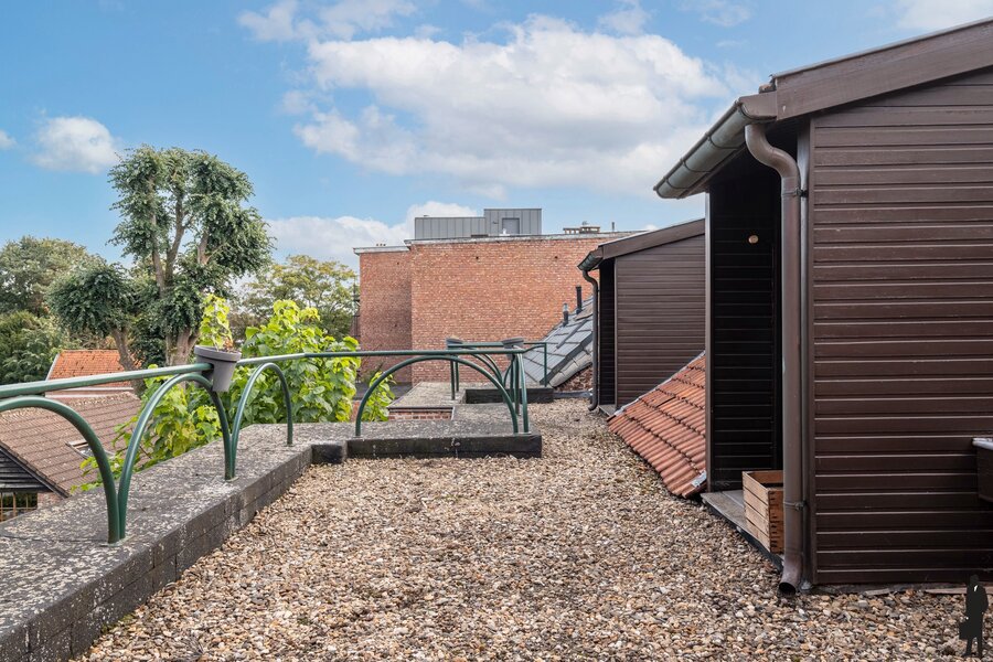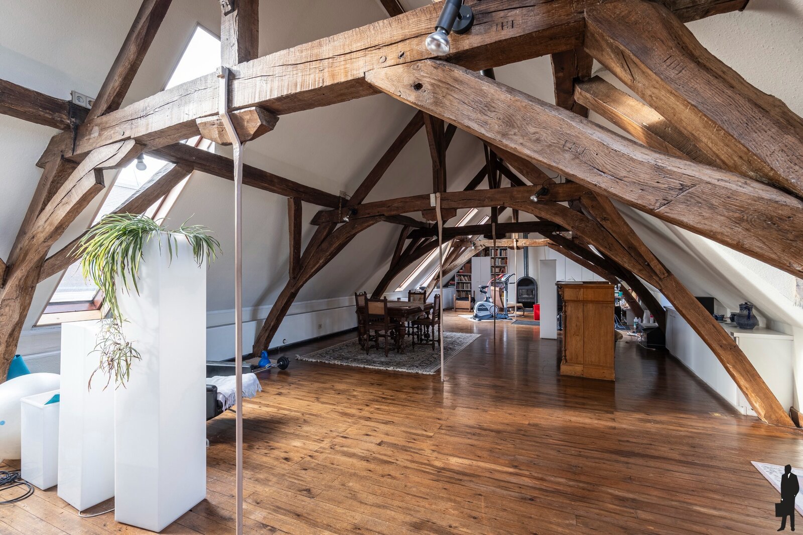 Tweede verdieping: Via een vaste trap bereikt u de volledig ingerichte zolderverdieping met aansluitend dakterras. U treft hier een royale loftkamer van ca. 96 m², bijzonder sfeervol door de prachtige houten balkenzoldering en de houtkachel. Deze verdieping is bovendien uitgerust met een eigen keuken en ingemaakte kasten, waardoor ze zich uitstekend leent als extra leefruimte, hobbykamer of privégedeelte.