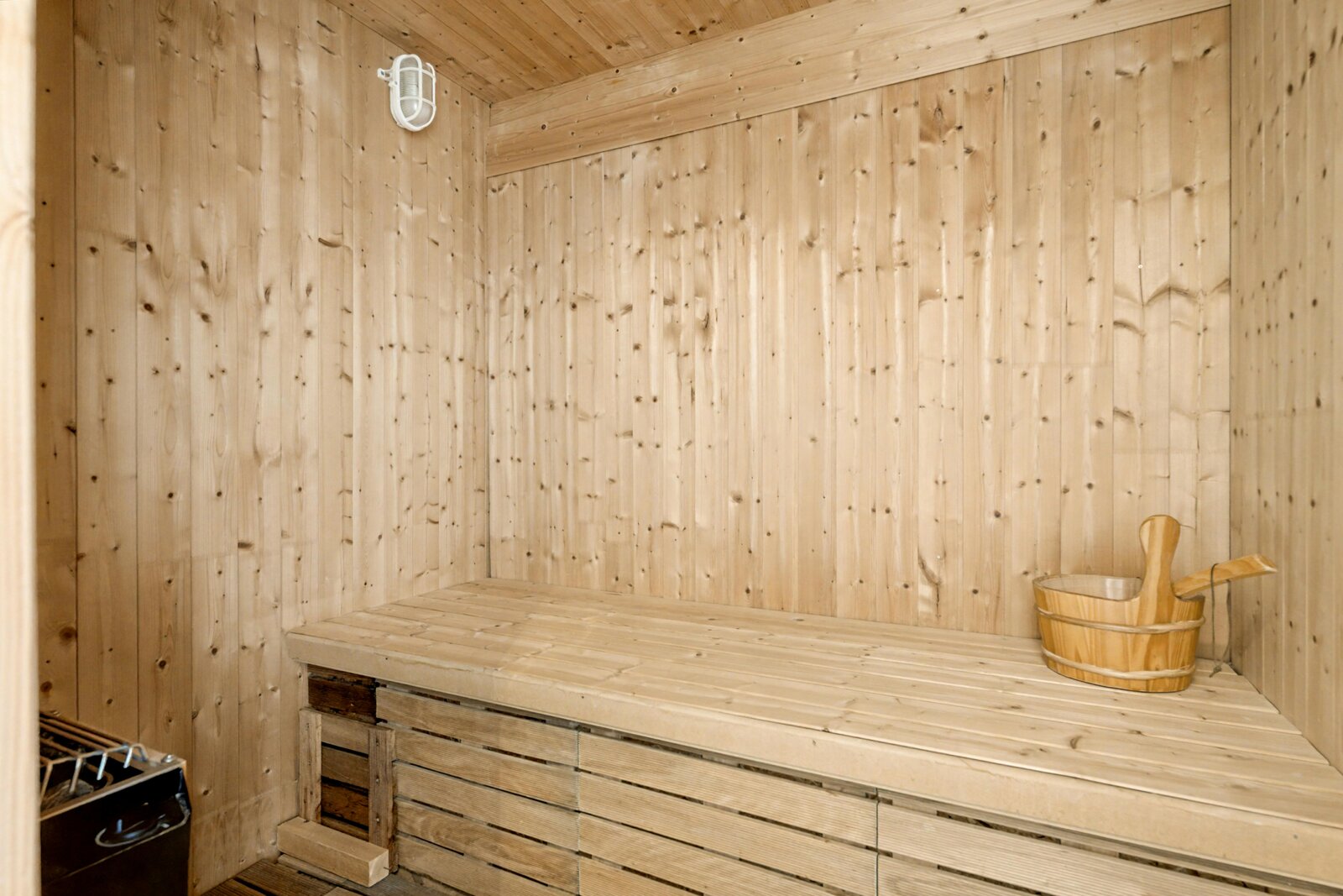 Op de bovenverdieping vind je een tweede, gezellige zitruimte, perfect als bar, ontspanningsruimte of home cinema — een plek om tot rust te komen of gasten in stijl te ontvangen. Hier is tevens ook een sauna voorzien.