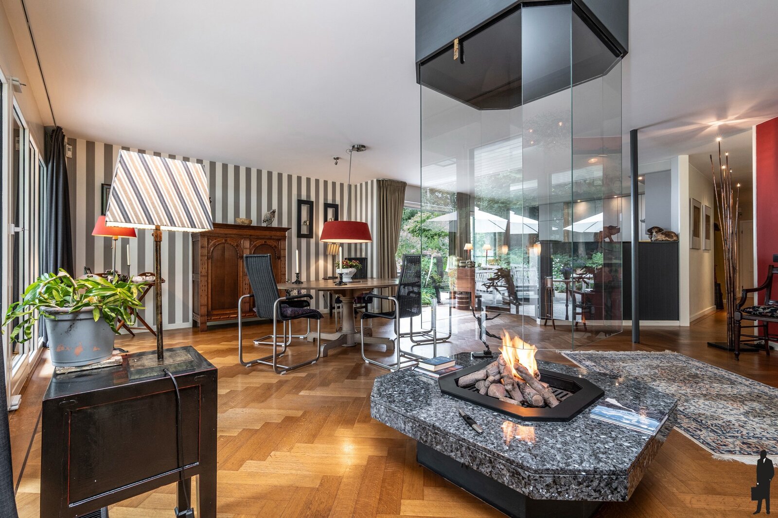 In de grote open woonkamer is nu een zithoek aan de straatzijde gecreëerd, waarbij de open gashaard, het eetgedeelte en de open keuken visueel van elkaar scheidt. De grote leefruimte laat echter vele indelingen toe.