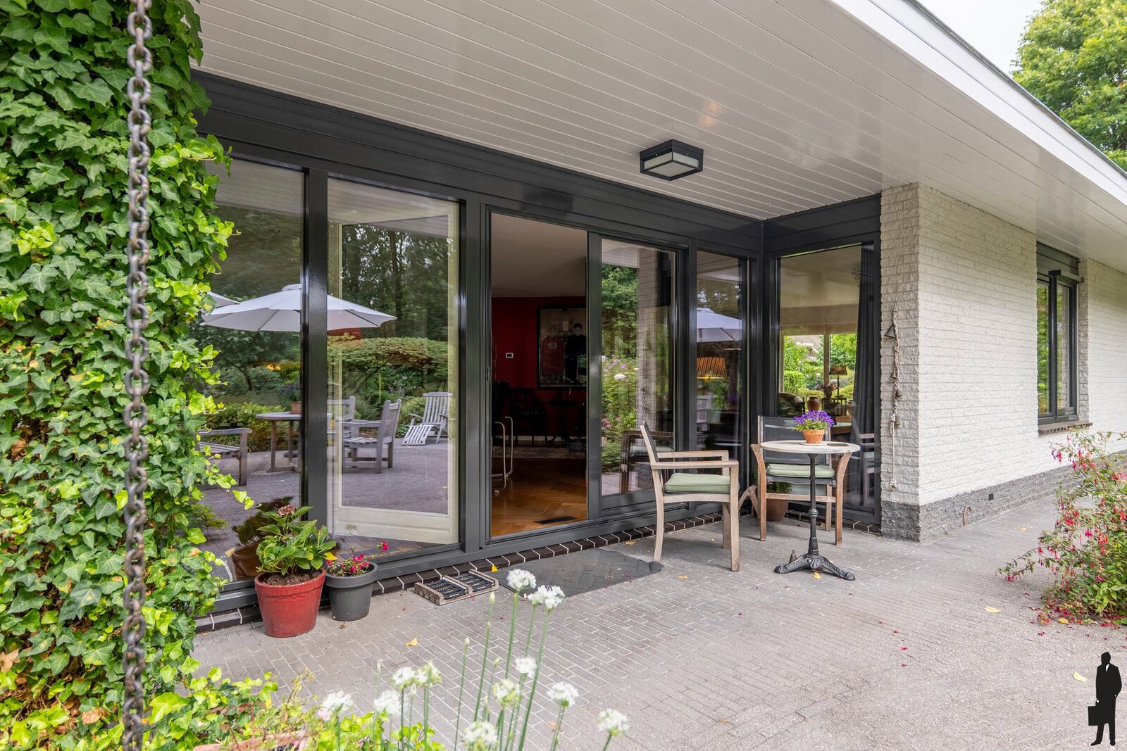 De vele ramen, openslaande deuren en schuifpui, zorgen voor een overvloed aan daglicht en brengen het groen van de omliggende tuin tot binnen. Bij de eethoek ligt de open keuken en is nu het hart van de woning. Door de grote schuifpui in de keuken ontstaat er met het terras buiten een gezellige 2e eethoek.