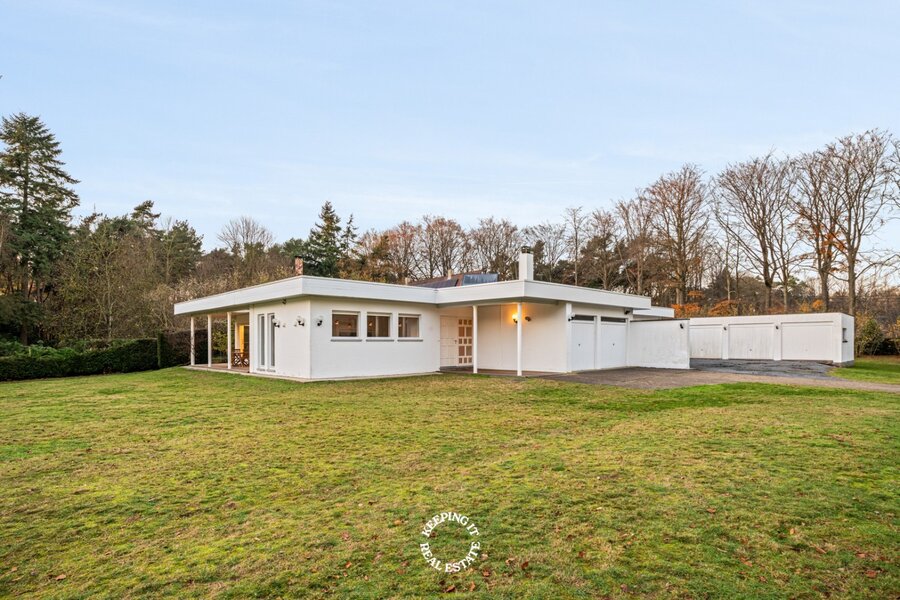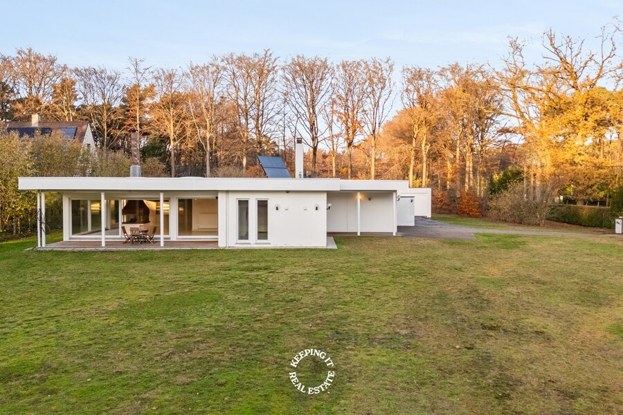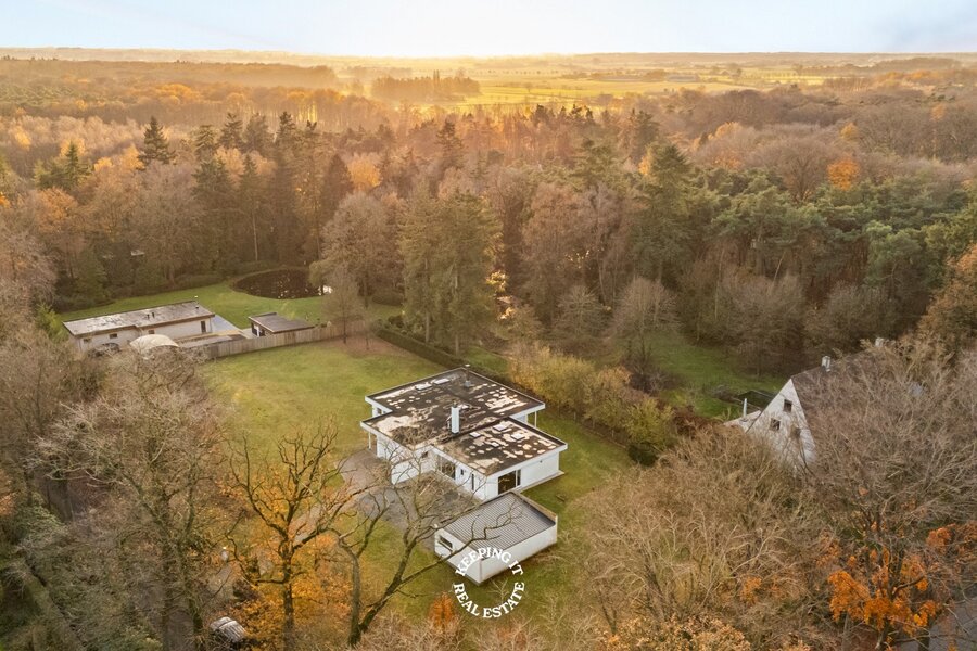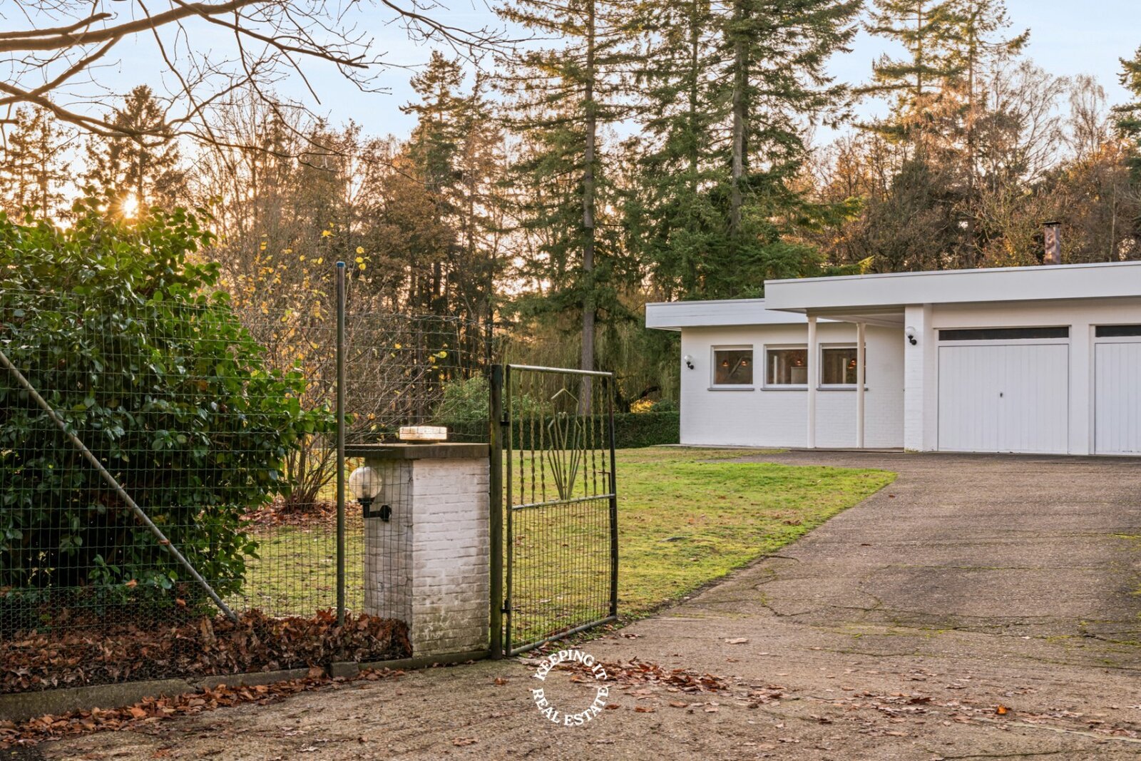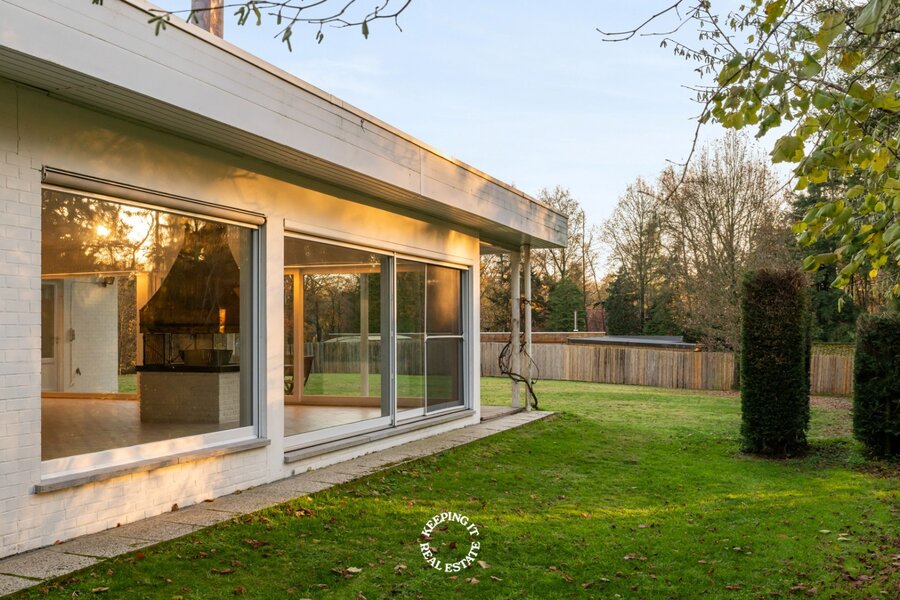 In de idyllische luwte van het bos van Hertsberge, op het perfect georiënteerde hoekperceel van de Kasteeldreef en de Sparrendreef, treffen we deze karaktervolle architectenwoning aan. Het betreft een ontwerp van architect A. Degeyter, gebouwd in 1976 en in 1989 met respect voor de originele filosofie verder uitgebreid. Degeyter stond bekend om zijn sobere, tijdloze vormtaal, waarbij licht, ruimtebeleving en harmonie met de omgeving centraal staan, en precies dat voel je in elke lijn van deze woning. De woning werd gebouwd op een prachtig lichtrijk perceel van 4780 m² en werd schitterend geïntegreerd in zijn bosrijke context. Dankzij de optimale oriëntatie baadt de tuin de hele dag in het licht, terwijl de mature groenaanplanting rust en privacy garandeert. Het hoekperceel vormt een van de meest gegeerde locaties in het bos.