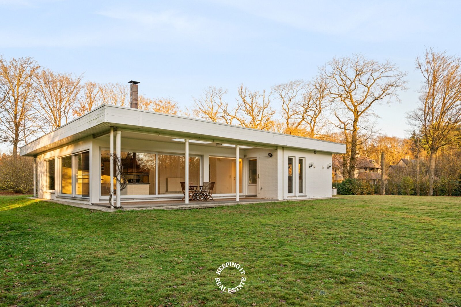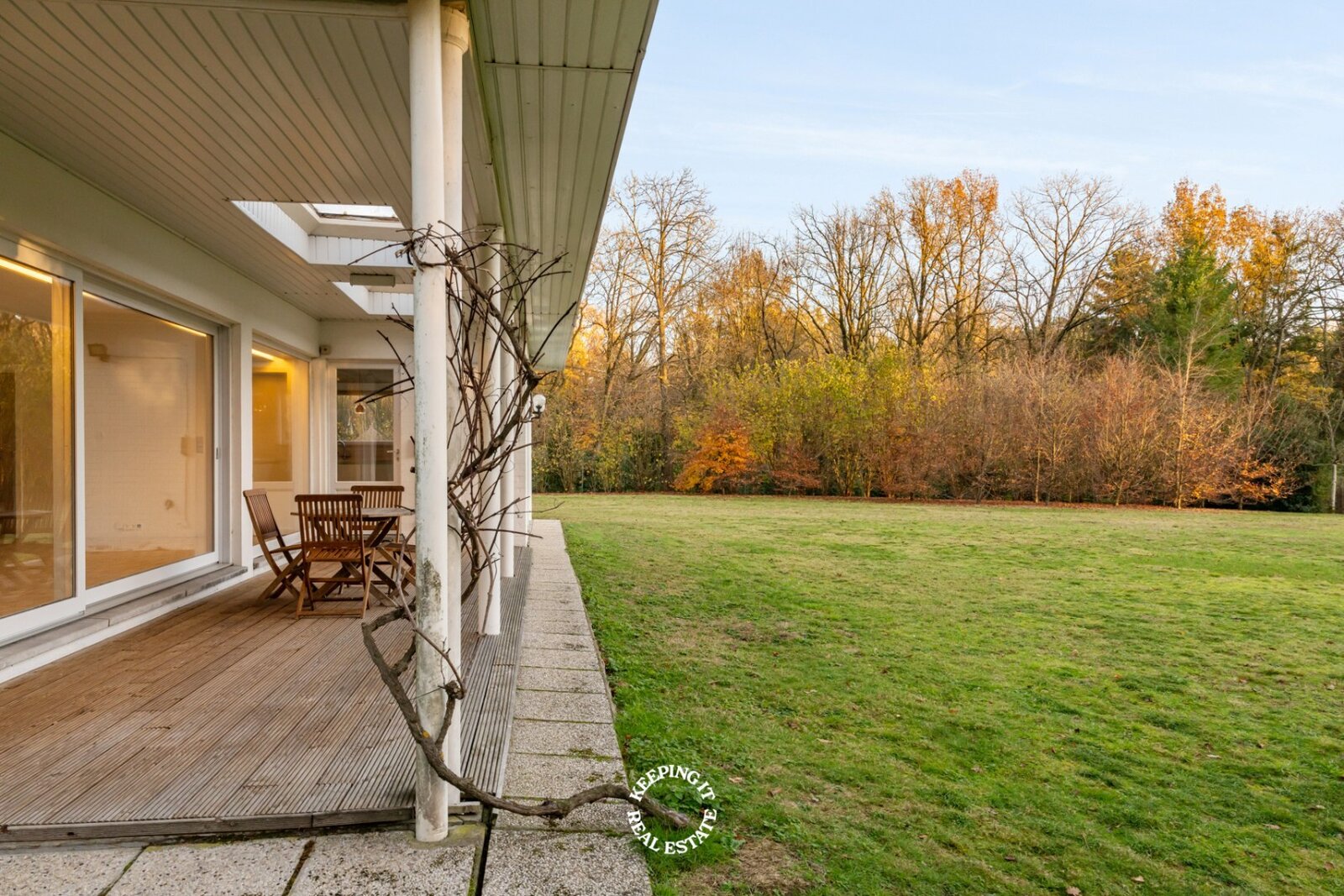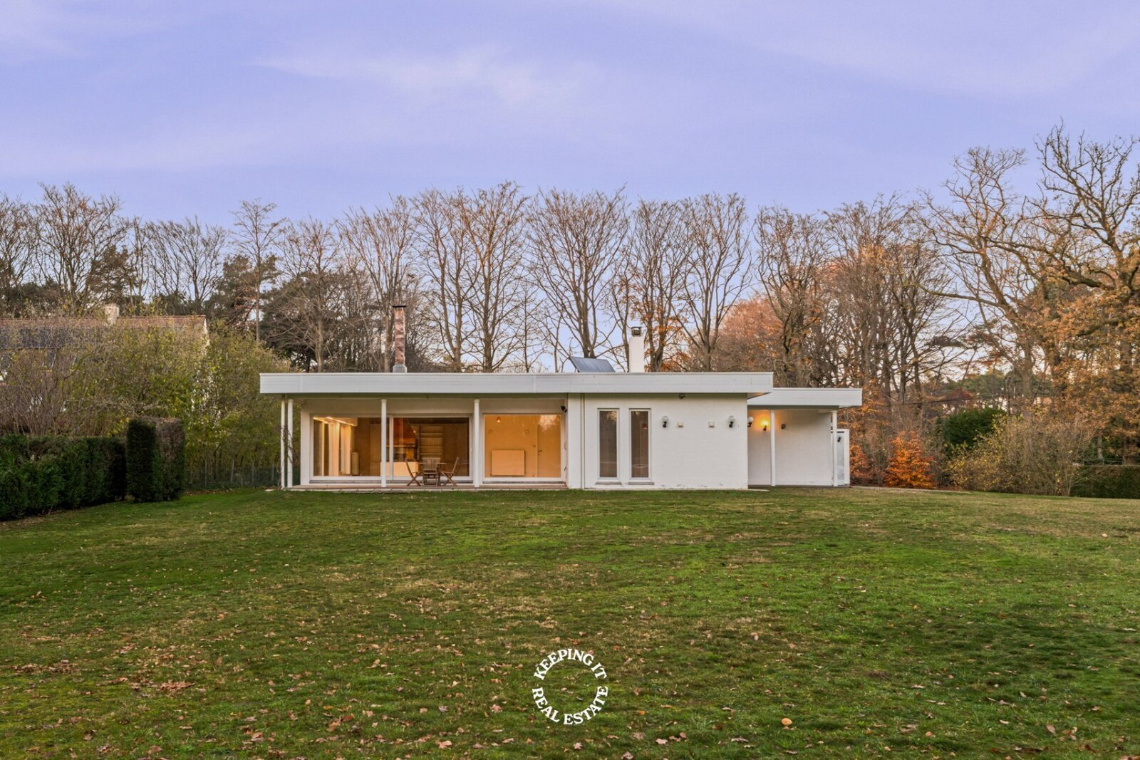 In de idyllische luwte van het bos van Hertsberge, op het perfect georiënteerde hoekperceel van de Kasteeldreef en de Sparrendreef, treffen we deze karaktervolle architectenwoning aan. Het betreft een ontwerp van architect A. Degeyter, gebouwd in 1976 en in 1989 met respect voor de originele filosofie verder uitgebreid. Degeyter stond bekend om zijn sobere, tijdloze vormtaal, waarbij licht, ruimtebeleving en harmonie met de omgeving centraal staan, en precies dat voel je in elke lijn van deze woning. De woning werd gebouwd op een prachtig lichtrijk perceel van 4780 m² en werd schitterend geïntegreerd in zijn bosrijke context. Dankzij de optimale oriëntatie baadt de tuin de hele dag in het licht, terwijl de mature groenaanplanting rust en privacy garandeert. Het hoekperceel vormt een van de meest gegeerde locaties in het bos.