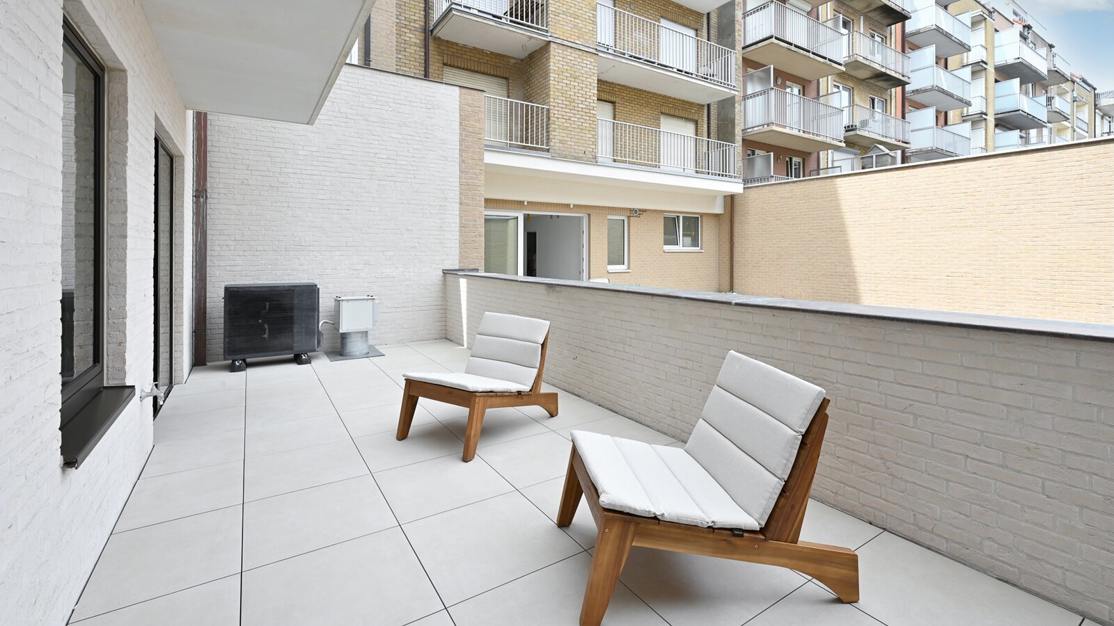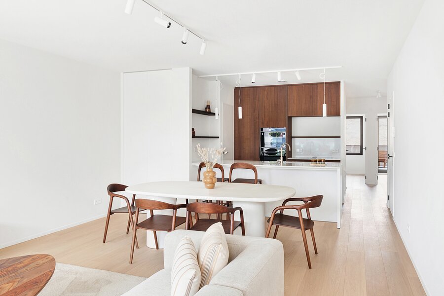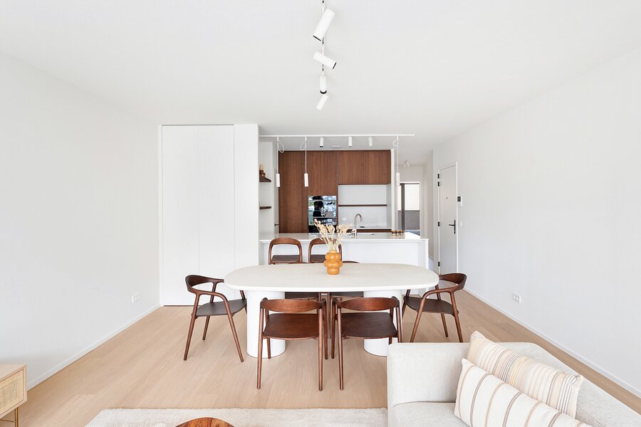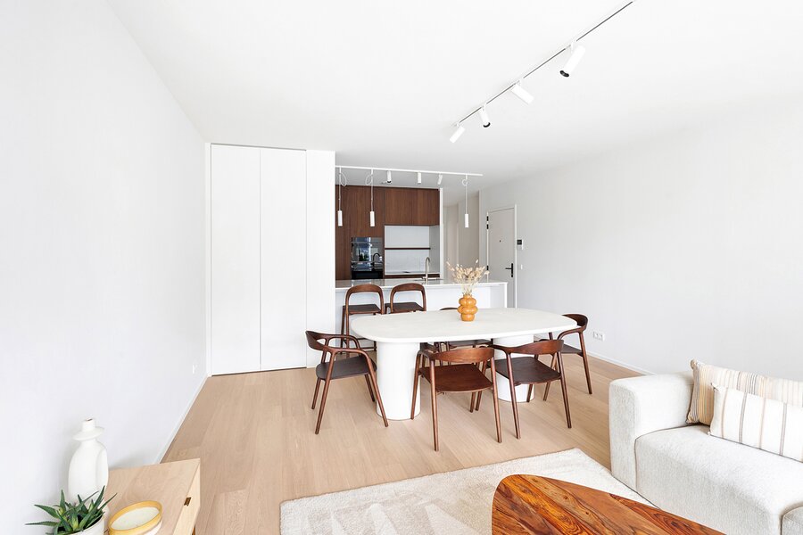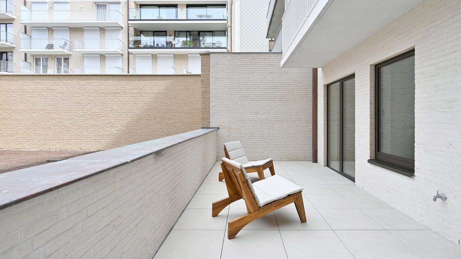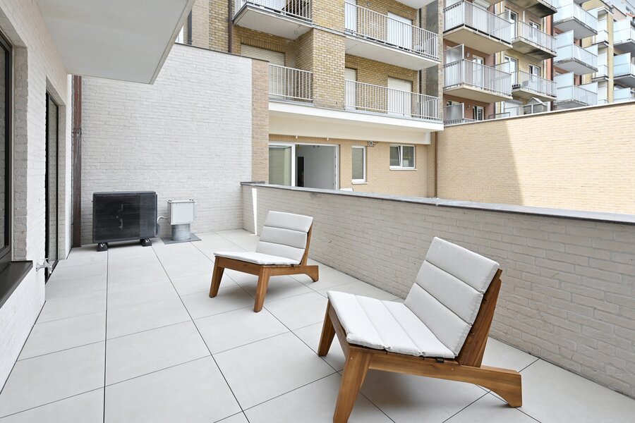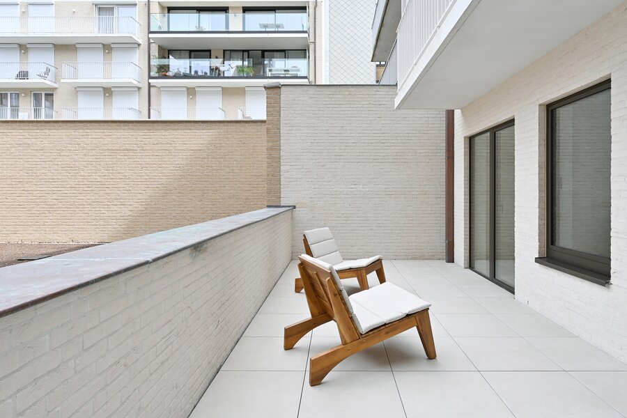 De leefruimte geniet van een mooie natuurlijke lichtinval en sluit naadloos aan op het aangename terras aan de voorzijde van het appartement. De moderne, smaakvolle keuken is volledig uitgerust en vormt een elegant geheel met de leefruimte.